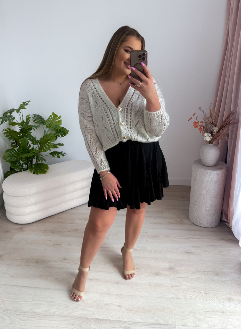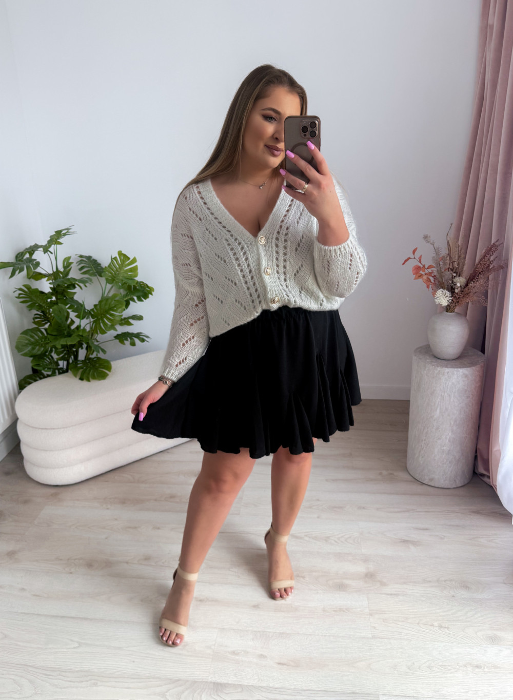 Urocza krótka spódniczka o rozkloszowanym kroju z zakładkami, która świetnie się układa, dodając sylwetce lekkości i kobiecego wdzięku. Gumka w pasie zapewnia komfort noszenia oraz idealne dopasowanie do figury. Doskonale komponuje się ze swetrami, koszulami czy bluzami, tworząc stylowe zestawy na co dzień i wyjątkowe okazje.