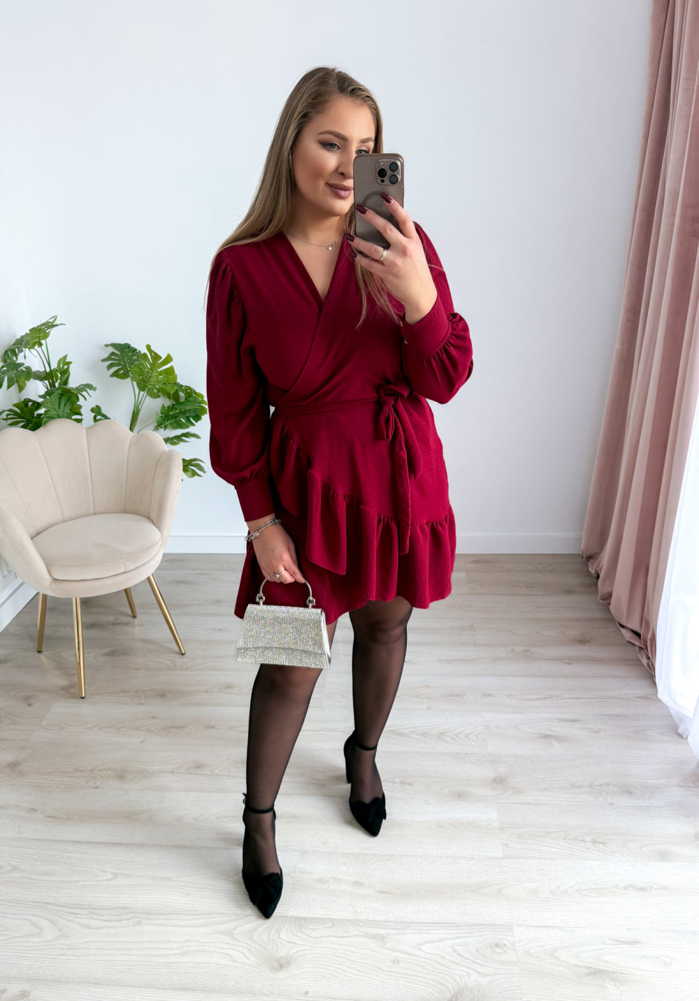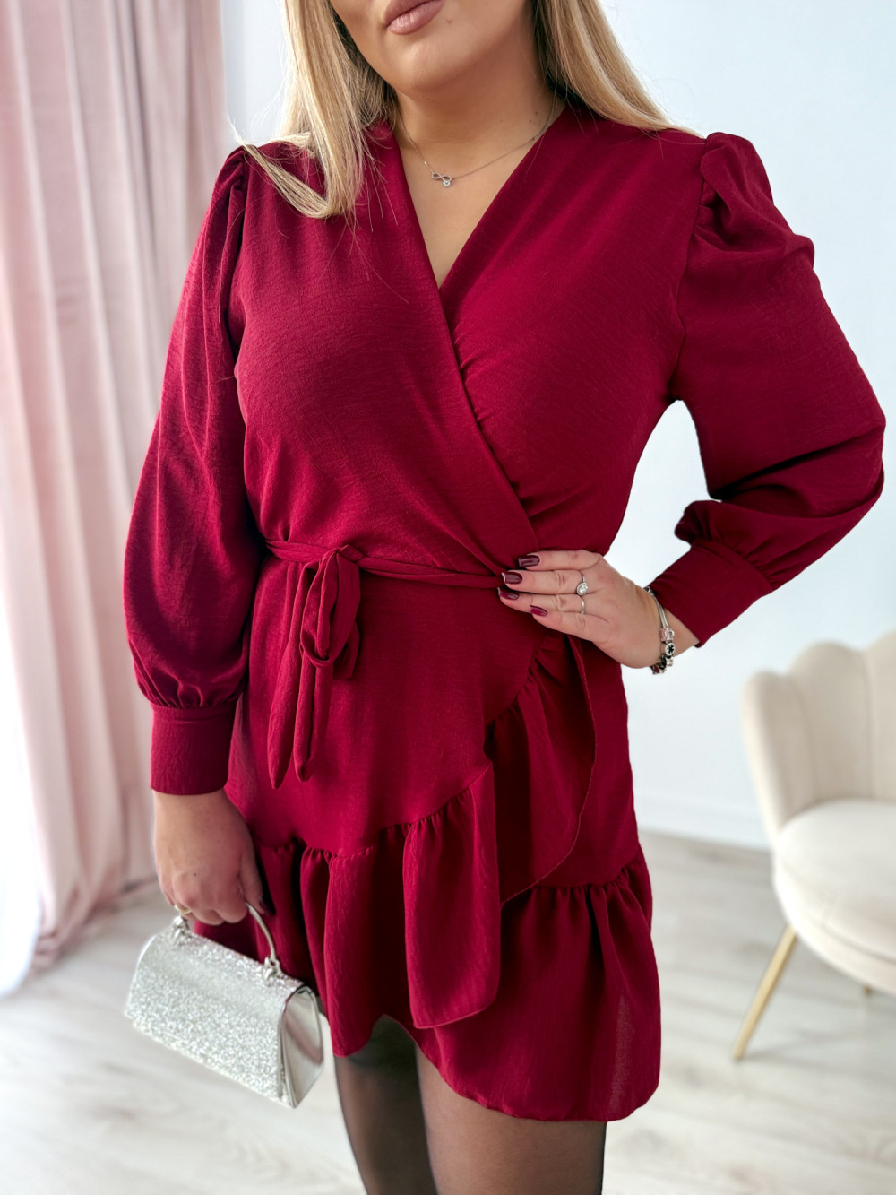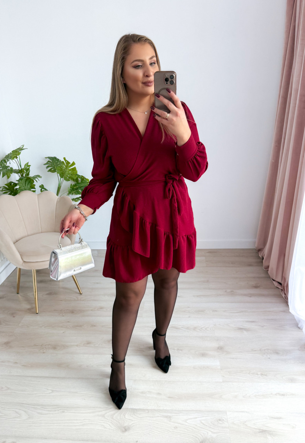 Elegancka sukienka o klasycznym kroju, która podkreśli Twoją sylwetkę i zapewni komfort noszenia. Dekolt w kształcie litery "V" pięknie eksponuje szyję, a zakładany fason z paskiem w talii doskonale akcentuje kobiece kształty. Długi rękaw nadaje sukience uniwersalnego charakteru, idealnego na chłodniejsze dni. To propozycja, która sprawdzi się zarówno na co dzień, jak i na bardziej eleganckie okazje.