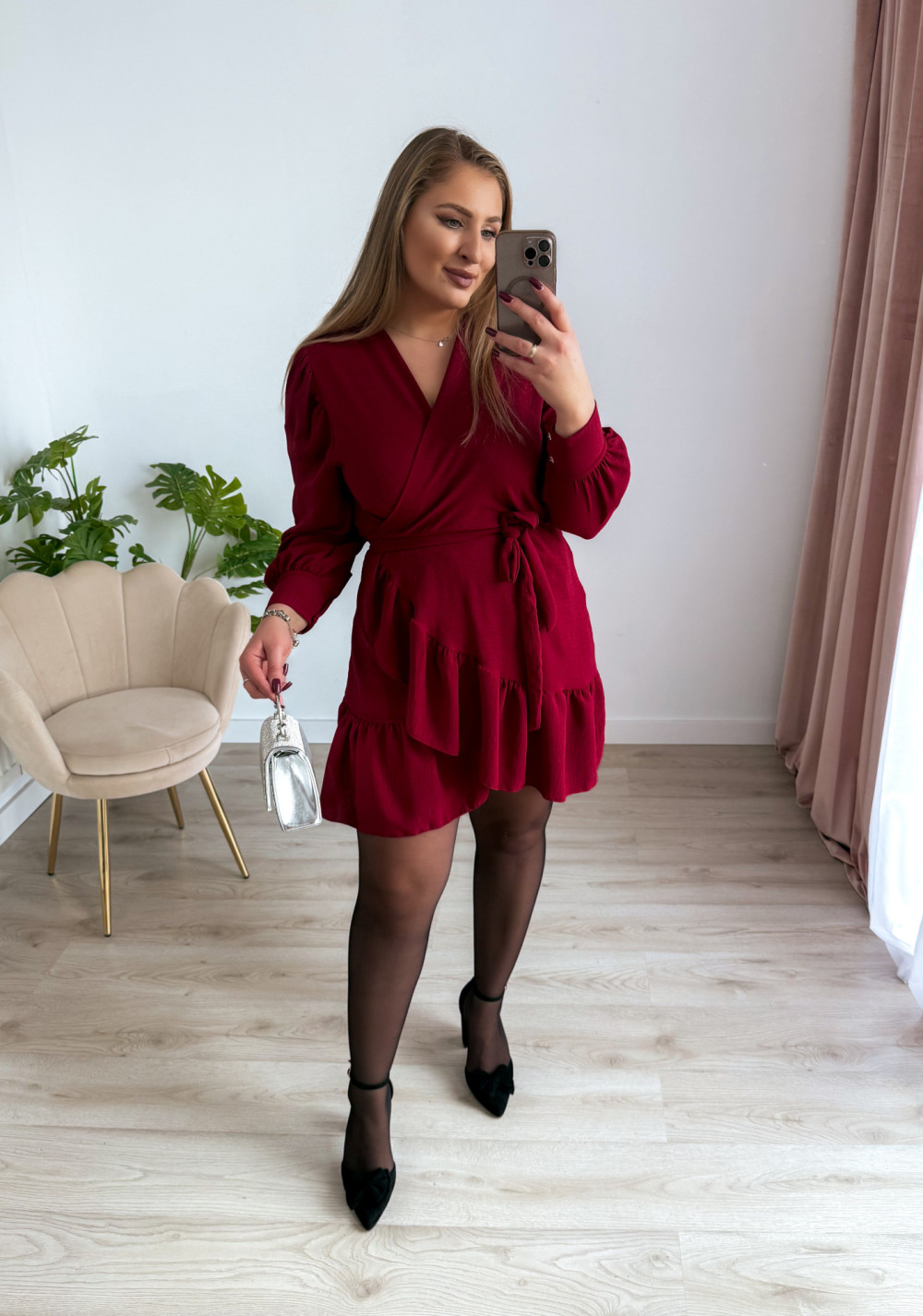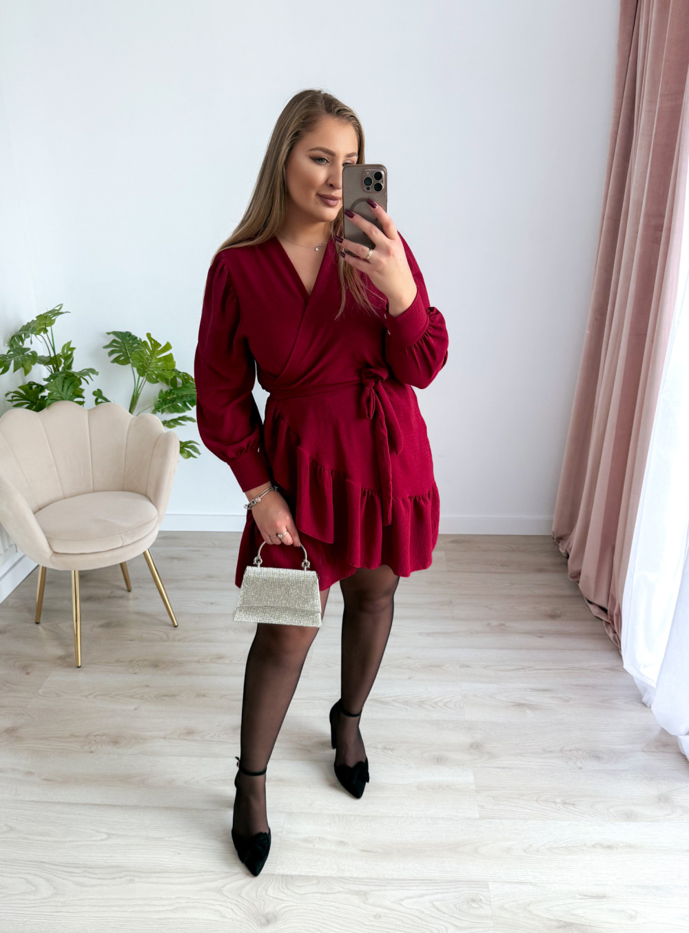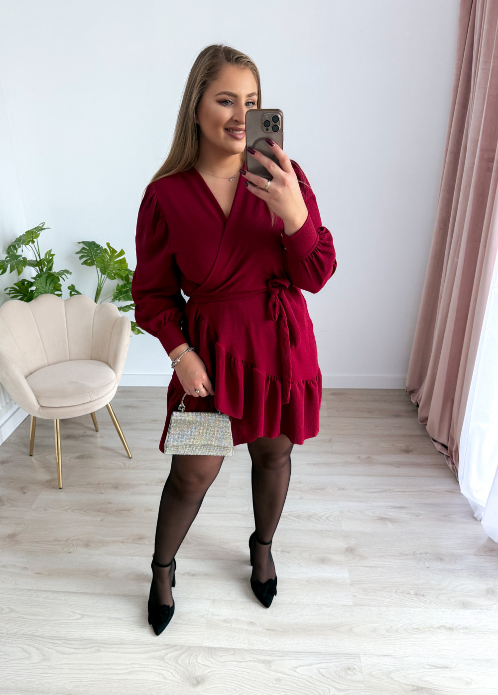 Elegancka sukienka o klasycznym kroju, która podkreśli Twoją sylwetkę i zapewni komfort noszenia. Dekolt w kształcie litery "V" pięknie eksponuje szyję, a zakładany fason z paskiem w talii doskonale akcentuje kobiece kształty. Długi rękaw nadaje sukience uniwersalnego charakteru, idealnego na chłodniejsze dni. To propozycja, która sprawdzi się zarówno na co dzień, jak i na bardziej eleganckie okazje.