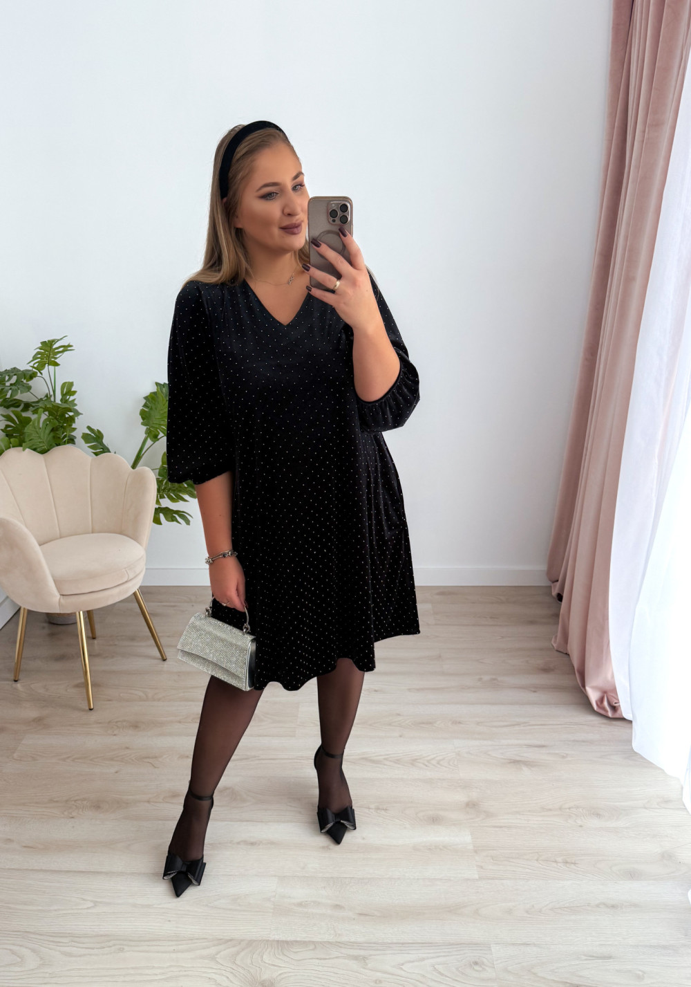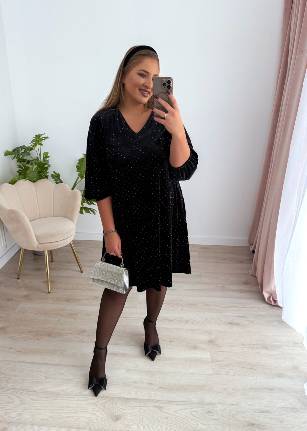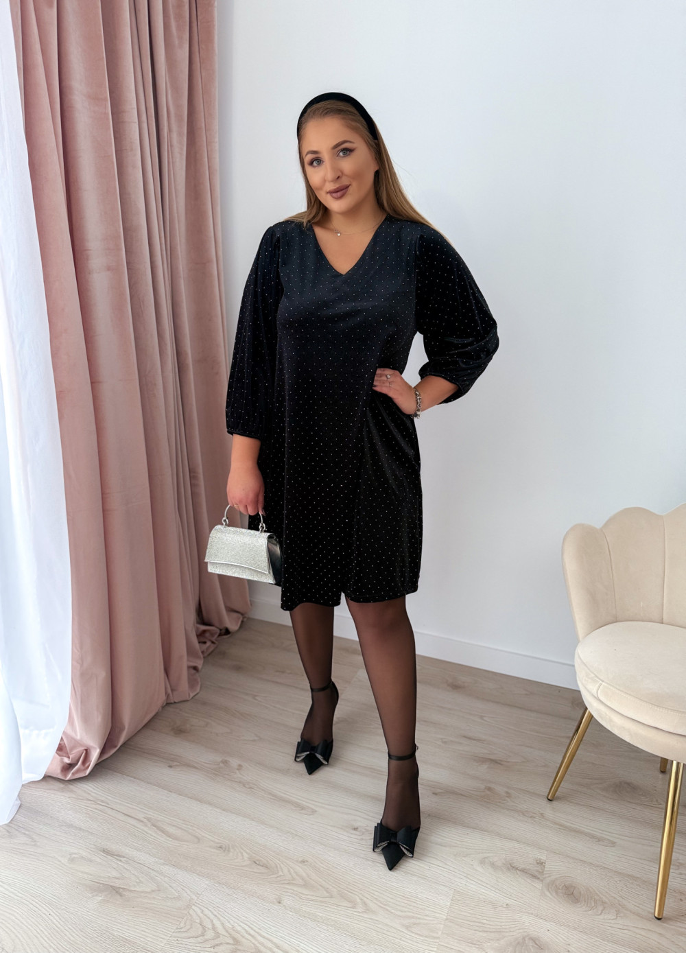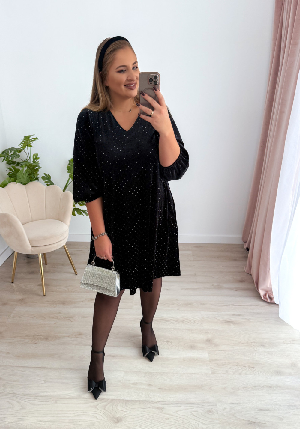 Sukienka welurowa o trapezowym kroju z diamencikami Apolonia - czarna
