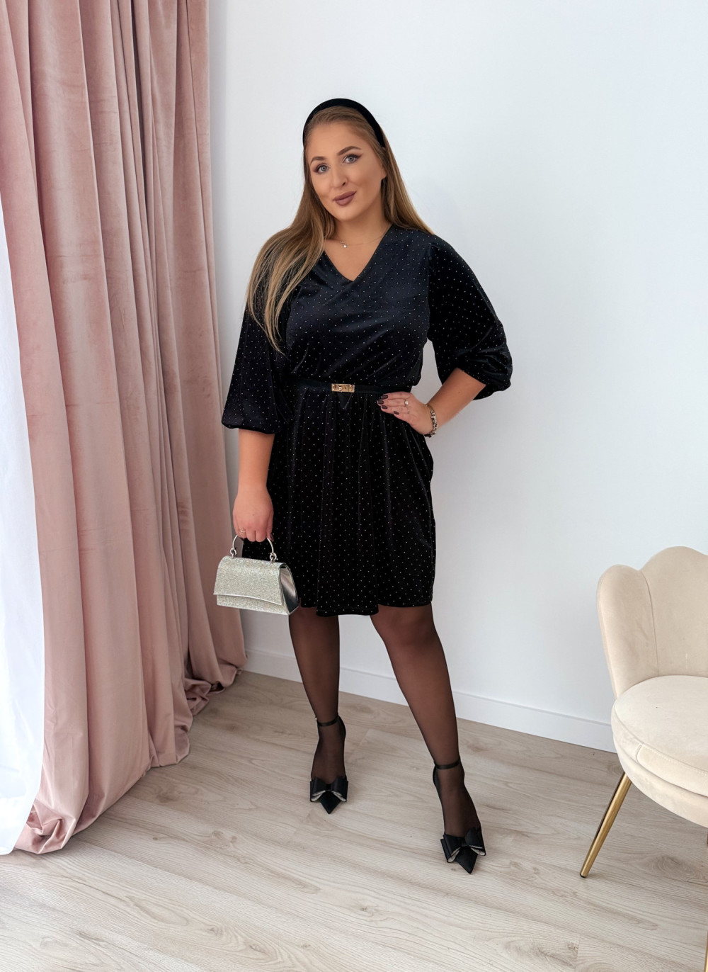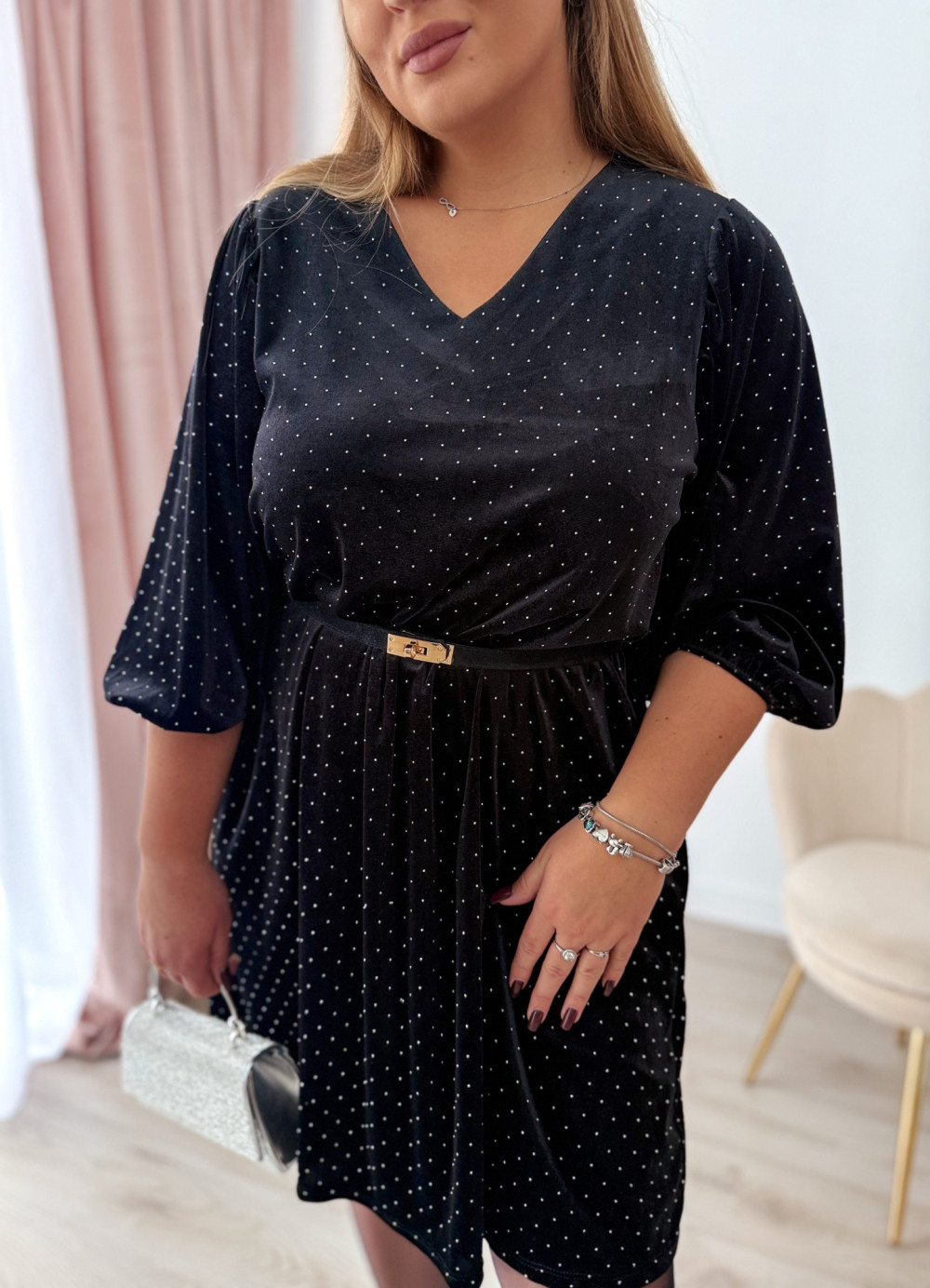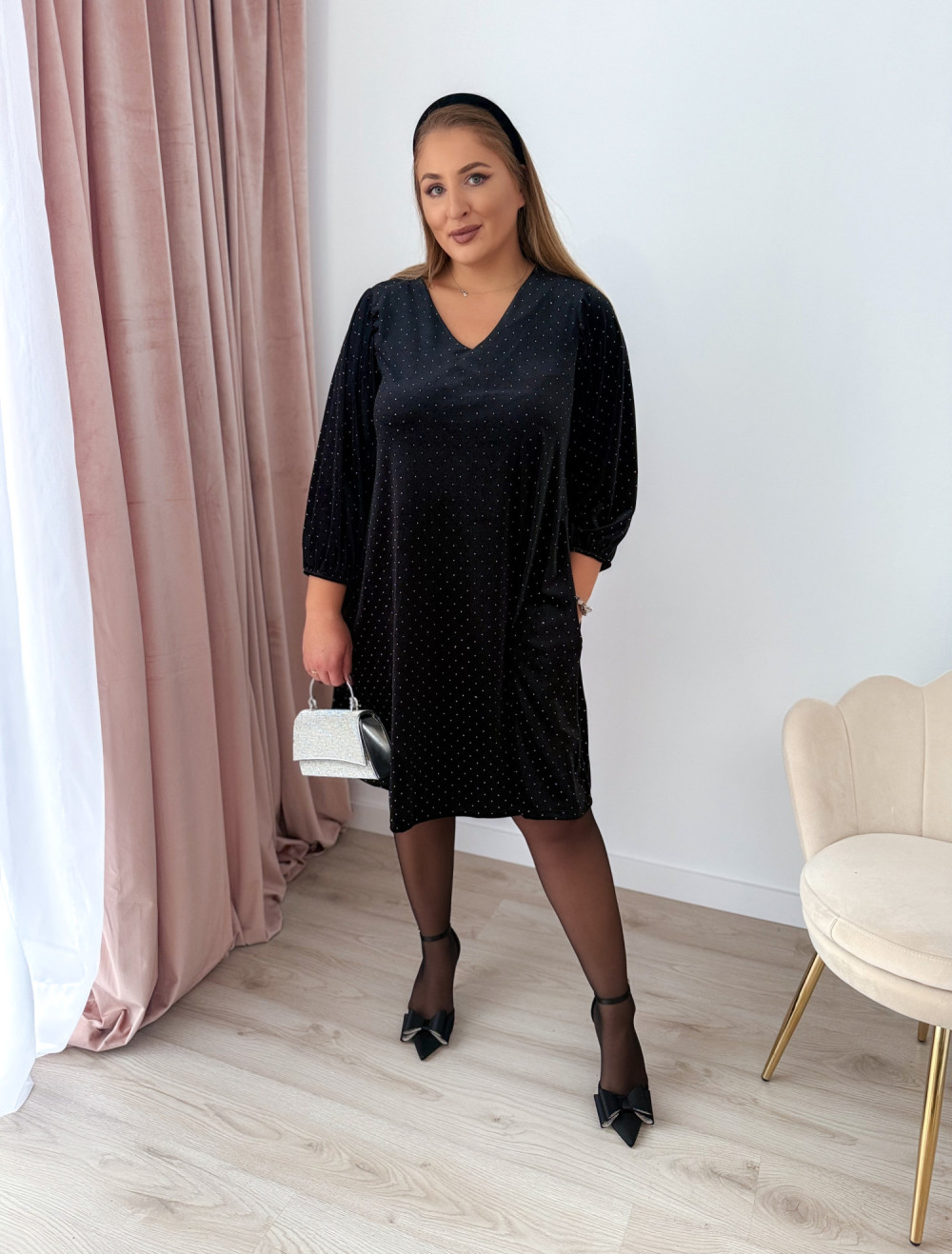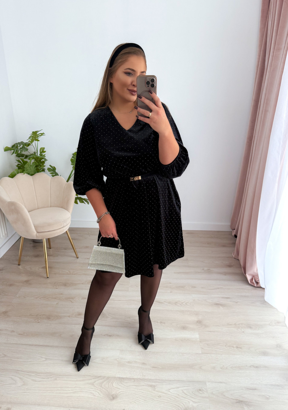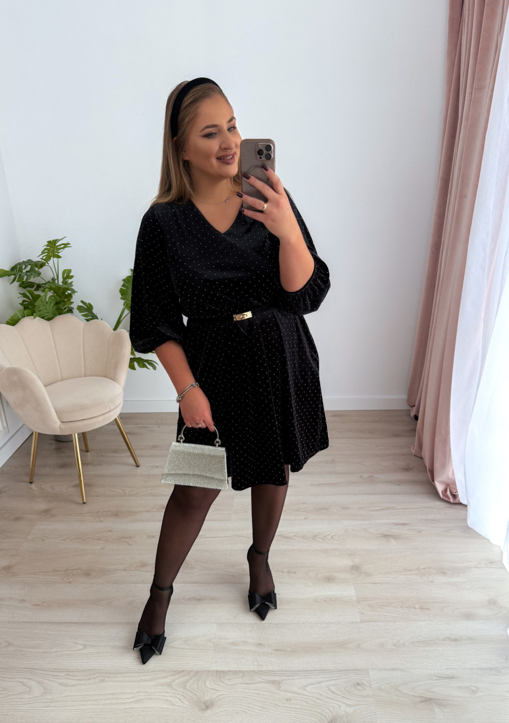 Sukienka welurowa o trapezowym kroju z diamencikami Apolonia - czarna