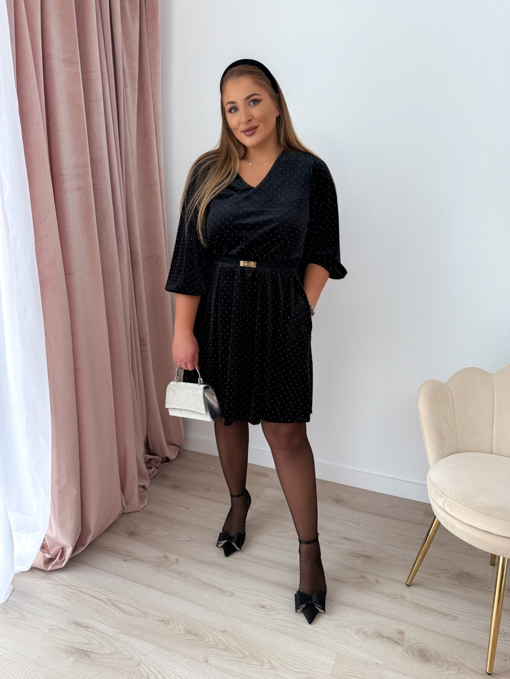 Ta sukienka to idealne połączenie wygody i błysku! Wykonana z miękkiego, welurowego materiału, zapewnia swobodę dzięki luźnemu, trapezowemu krojowi w stylu oversize. Całość obsypana subtelnymi diamencikami, które nadają jej wyjątkowego, eleganckiego charakteru. Świetnie sprawdzi się zarówno na wieczorne wyjścia, jak i świąteczne spotkania.