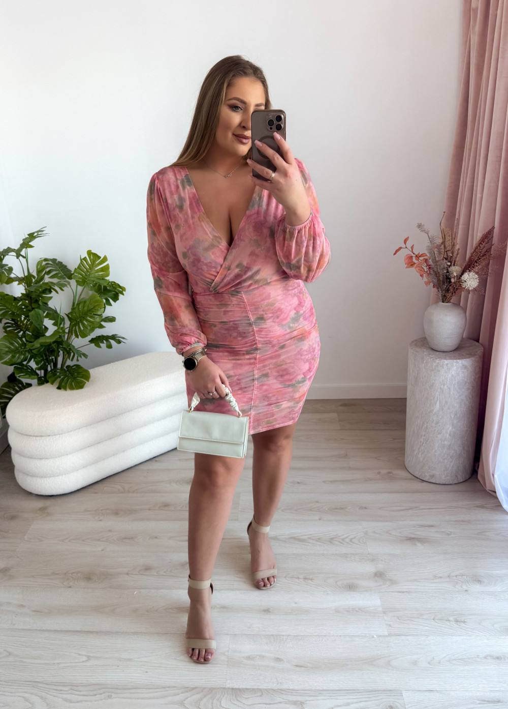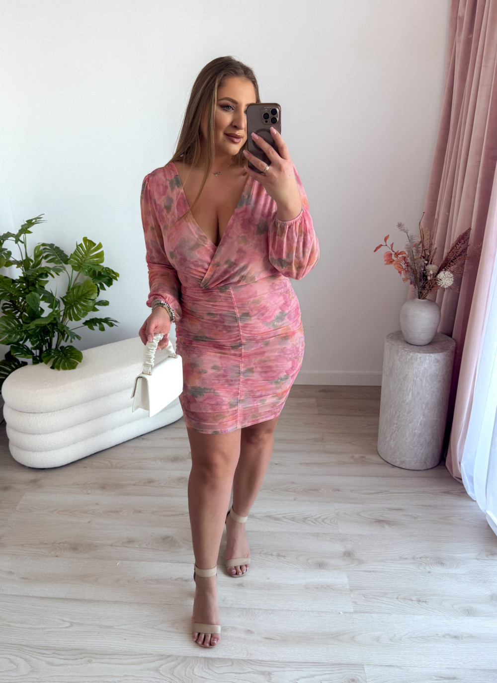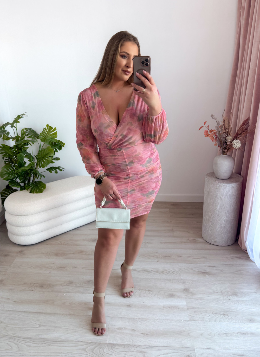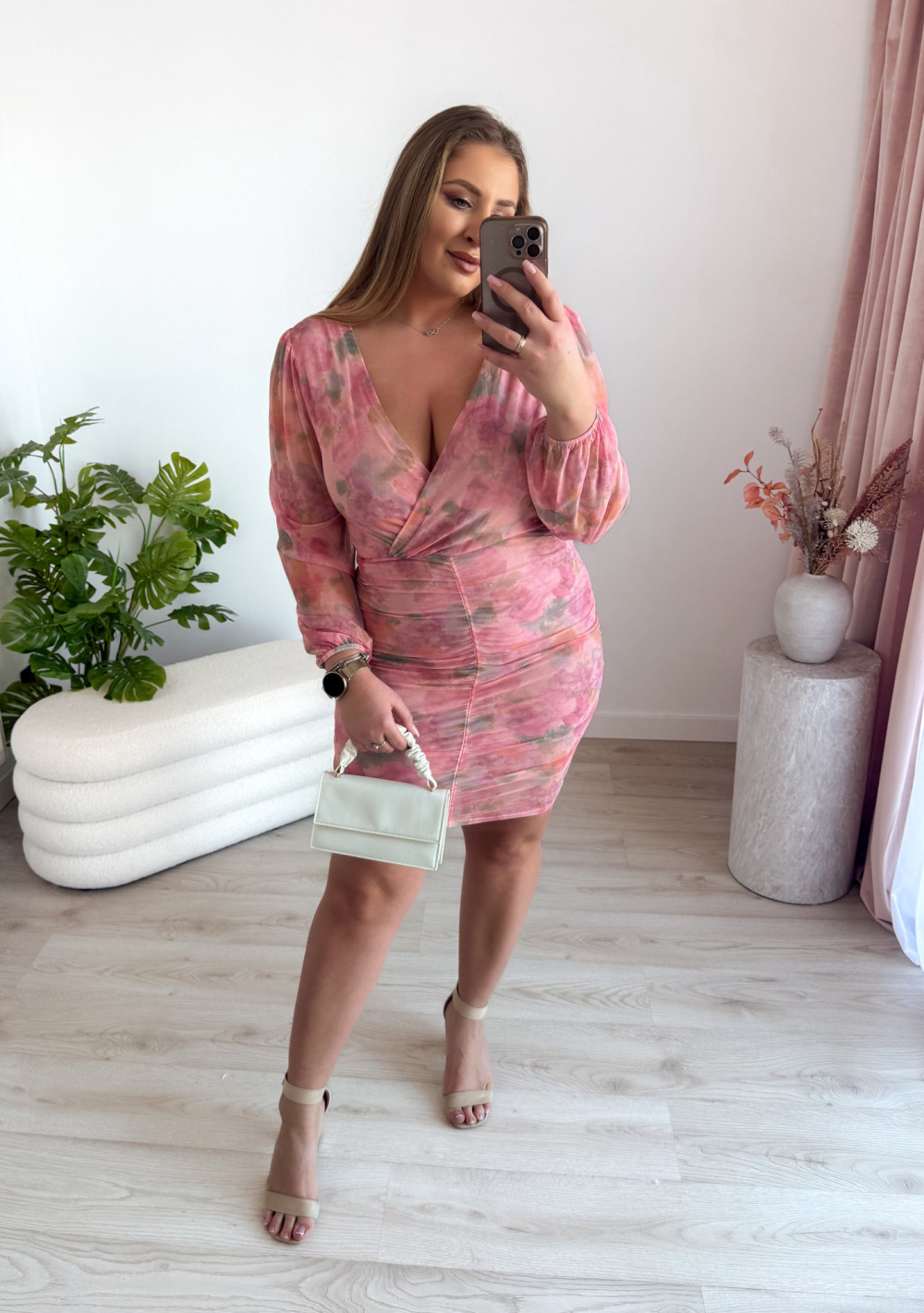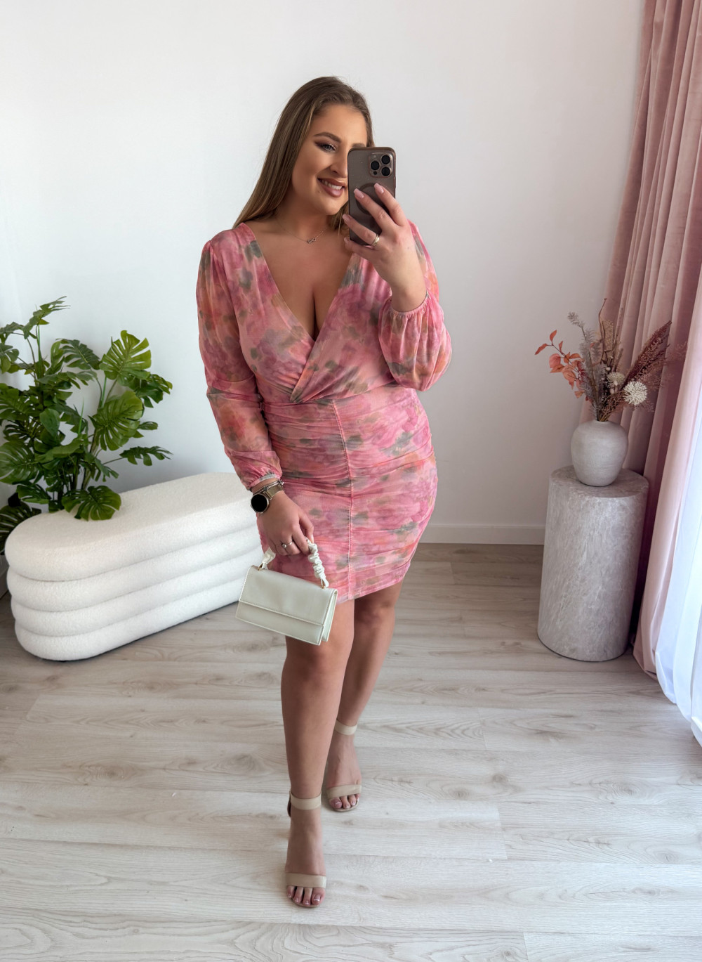 Sukienka z siateczki z drapowaniem w pudrowe kwiatki Suzanne
