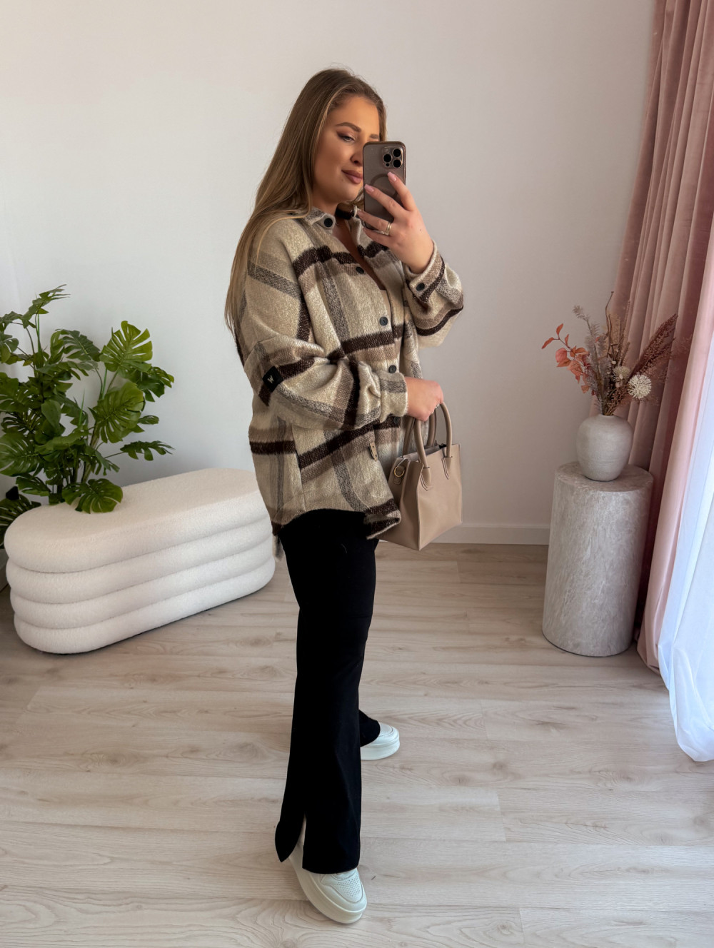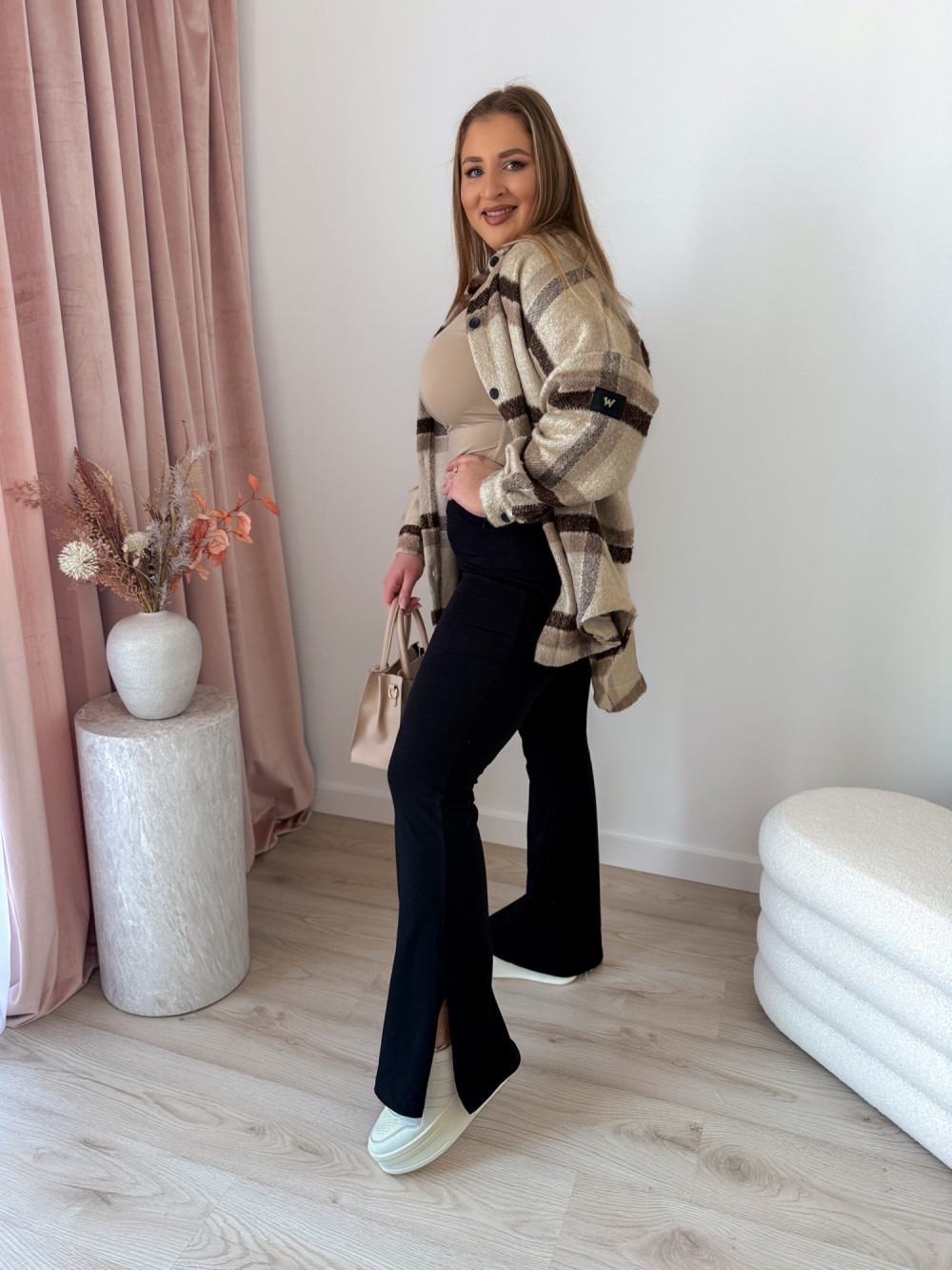 - Rozszerzana nogawka z delikatnym rozcięciem – nadaje lekkości i modnego charakteru