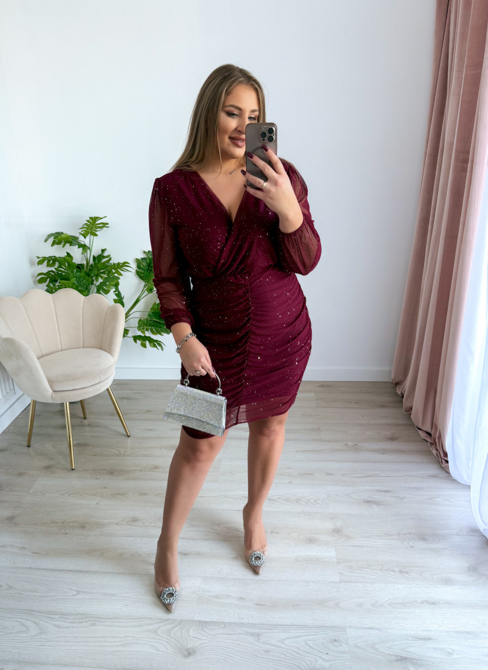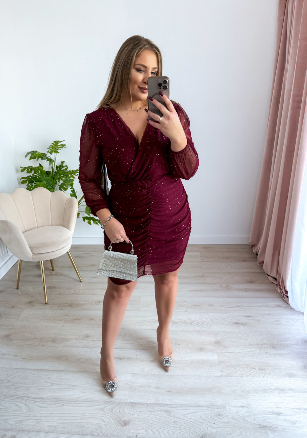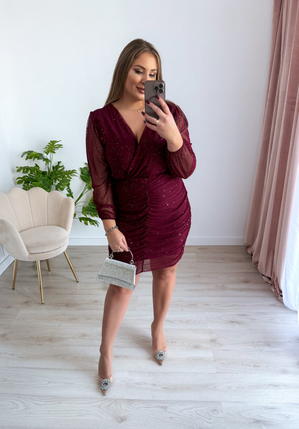 Sukienka z siateczki z drapowaniem Suzanne - bordowa ze srebrnymi drobinkami