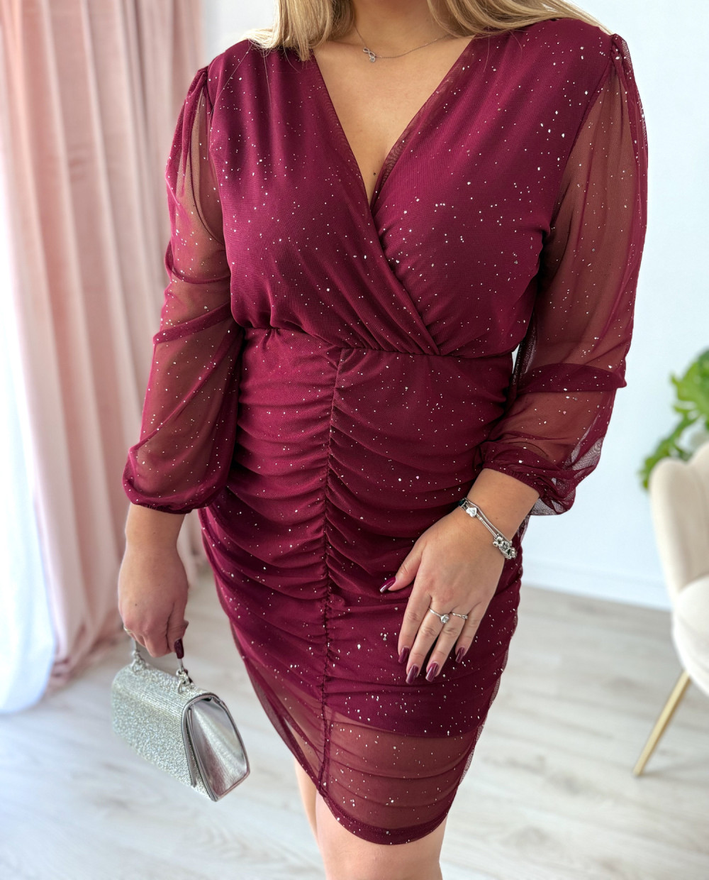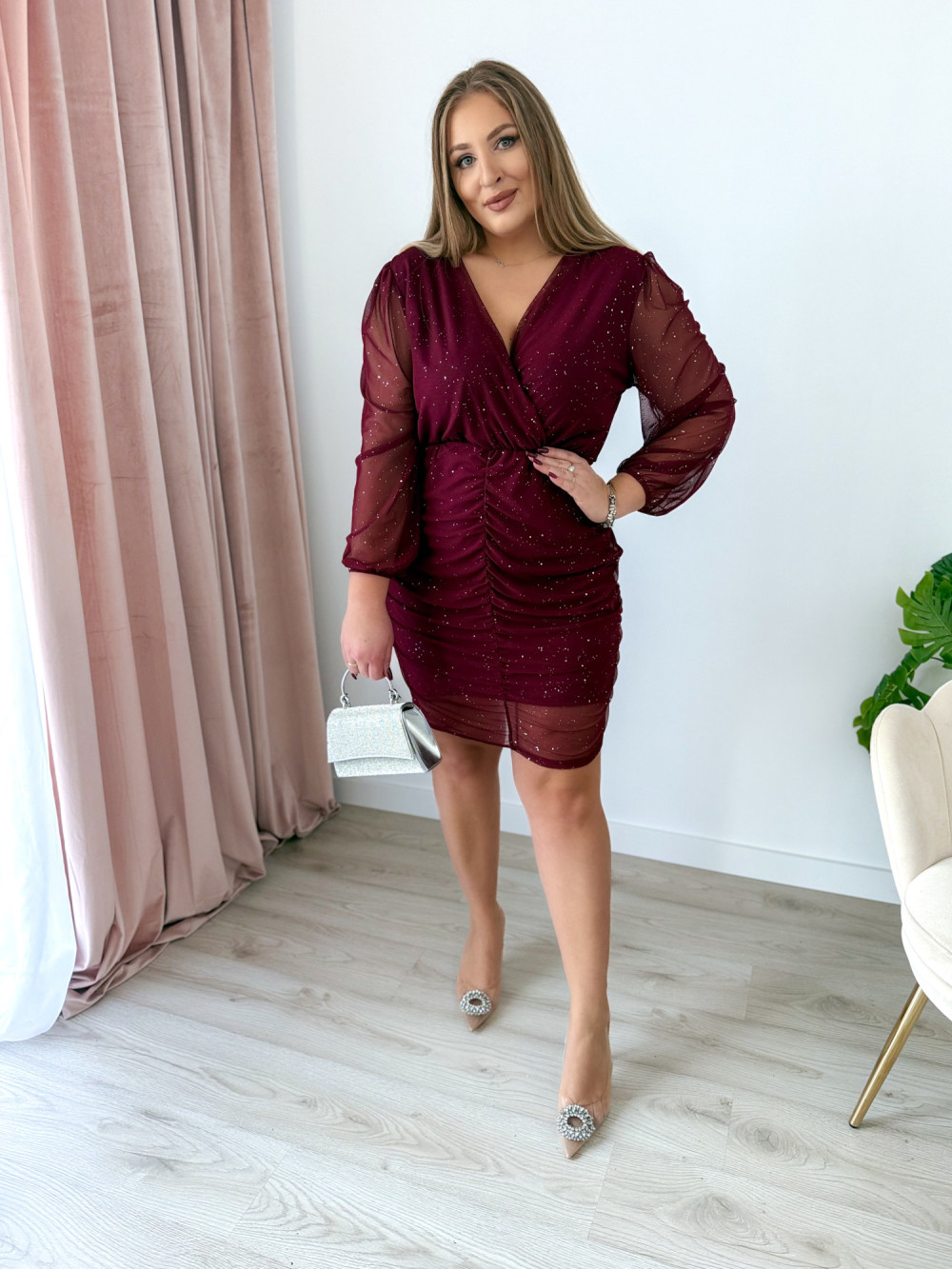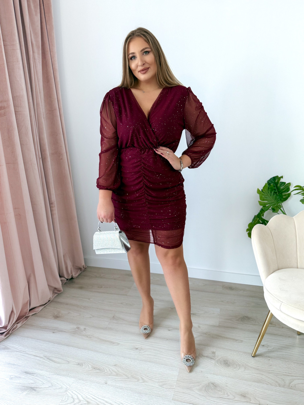 Sukienka z siateczki z drapowaniem Suzanne - bordowa ze srebrnymi drobinkami