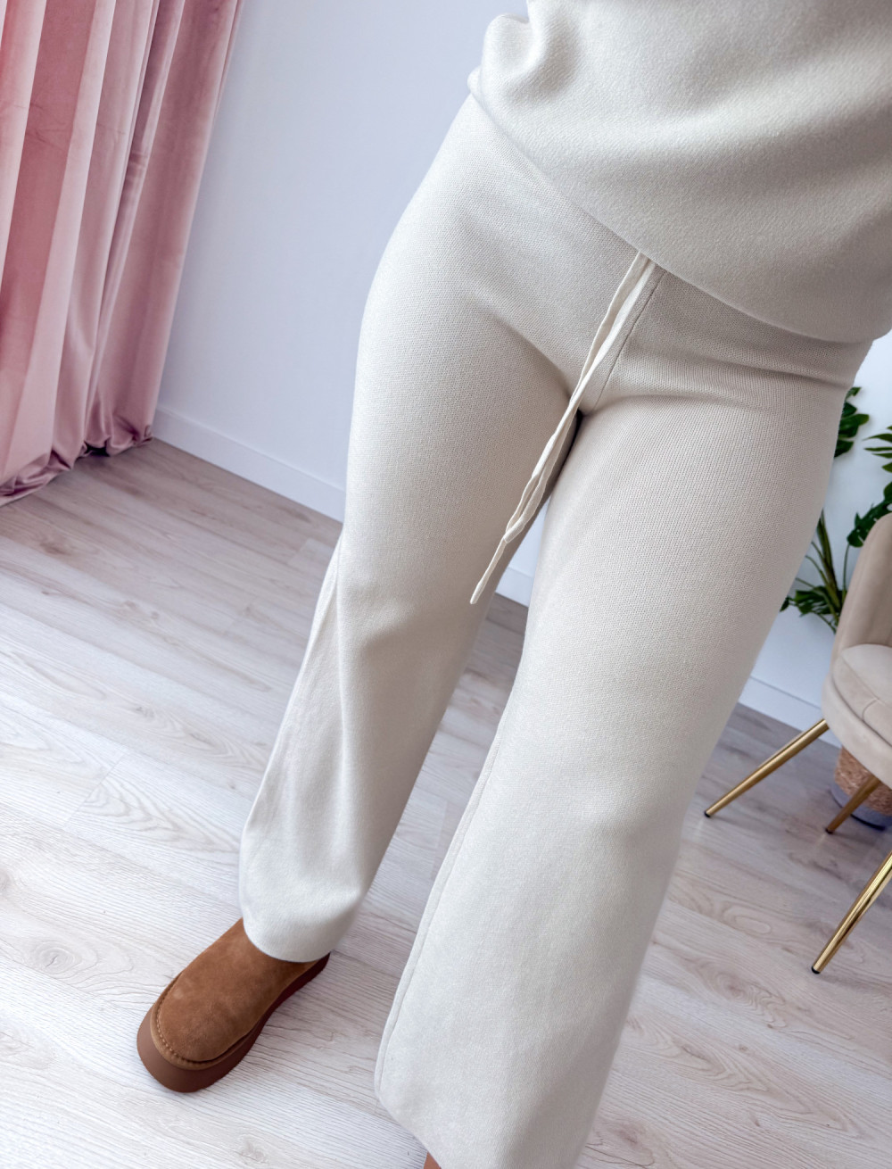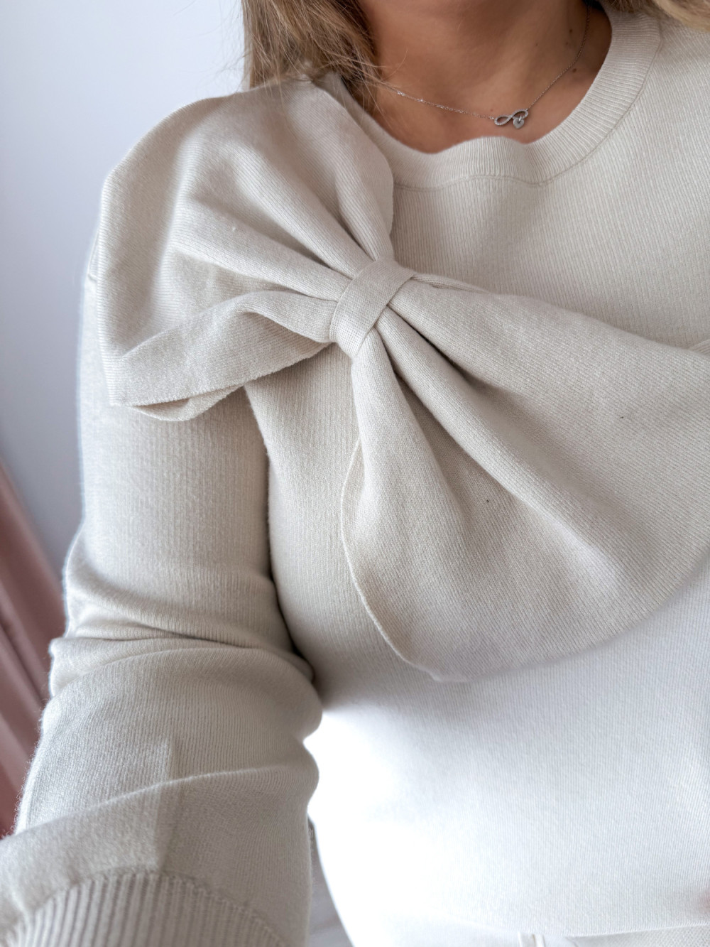 Komplet sweterkowy spodnie z szeroką nogawką+bluzka z kokardką Mina - kremowy