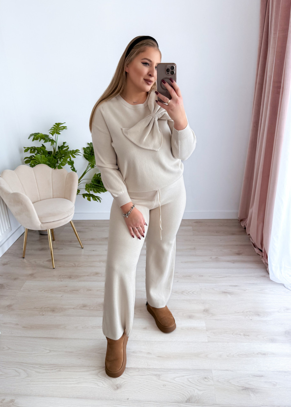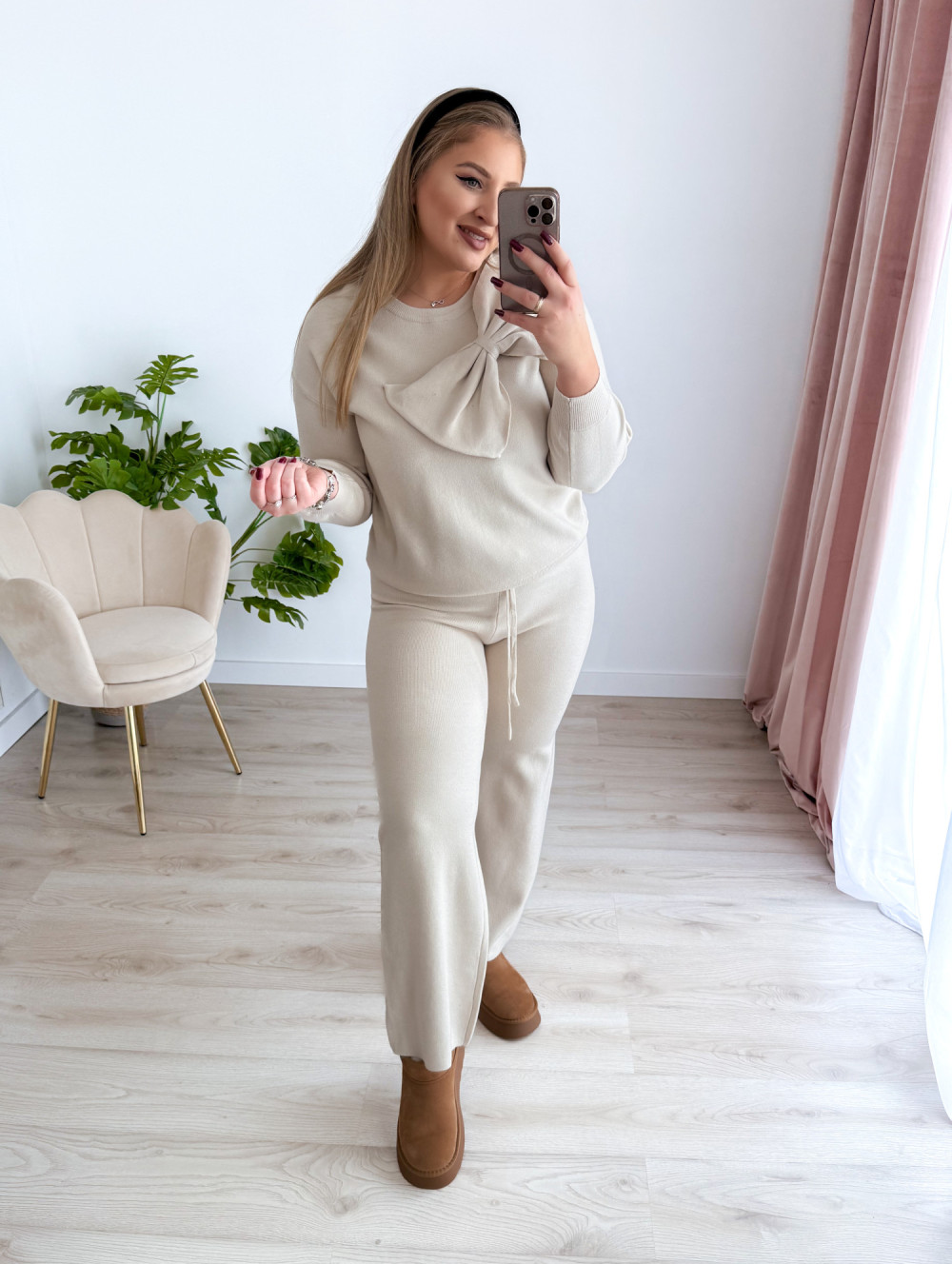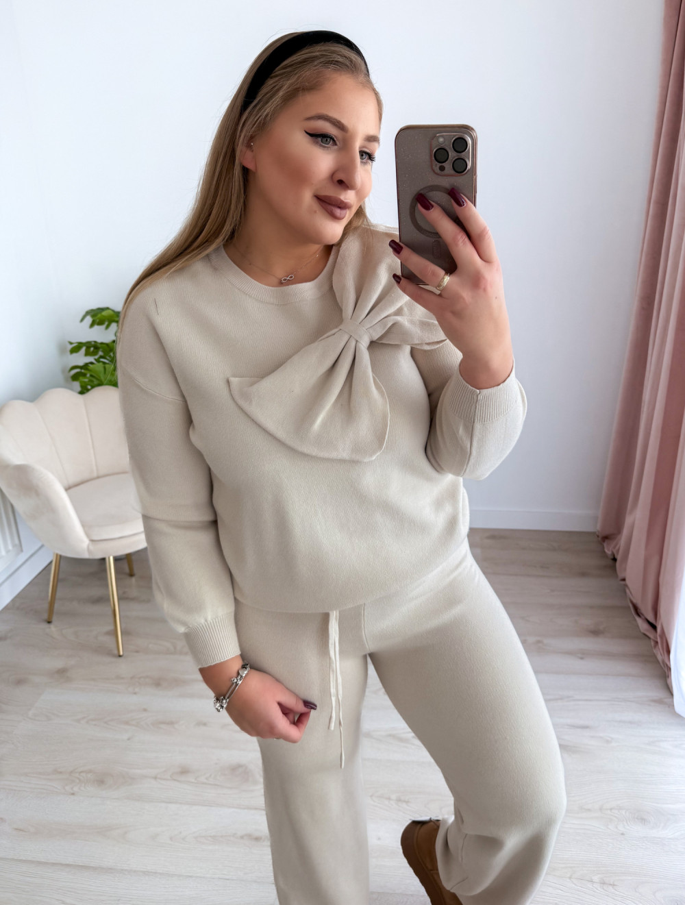 Sweterkowy komplet to idealna propozycja dla miłośniczek wygody i kobiecego stylu. Składa się z szerokich spodni na gumce w pasie oraz bluzki z uroczą kokardką i długim rękawem. Miękki materiał i modny fason sprawiają, że całość prezentuje się elegancko, a jednocześnie bardzo komfortowo w noszeniu.