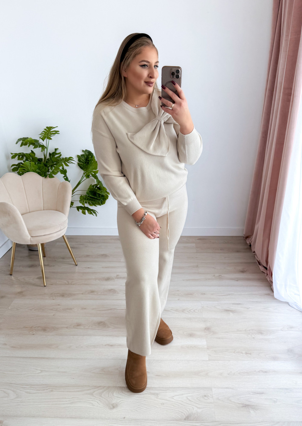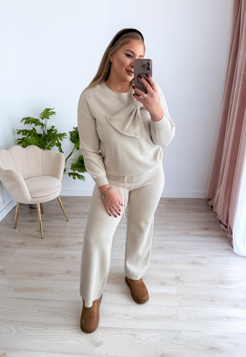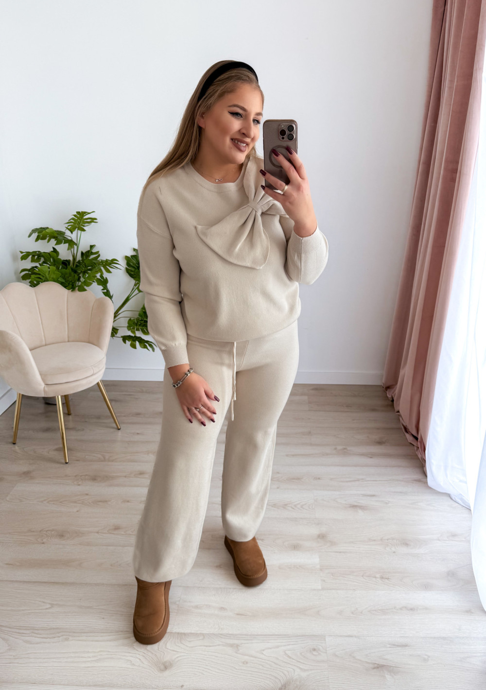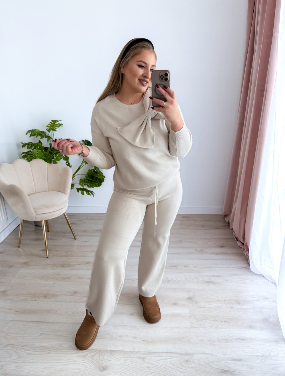 Sweterkowy komplet to idealna propozycja dla miłośniczek wygody i kobiecego stylu. Składa się z szerokich spodni na gumce w pasie oraz bluzki z uroczą kokardką i długim rękawem. Miękki materiał i modny fason sprawiają, że całość prezentuje się elegancko, a jednocześnie bardzo komfortowo w noszeniu.