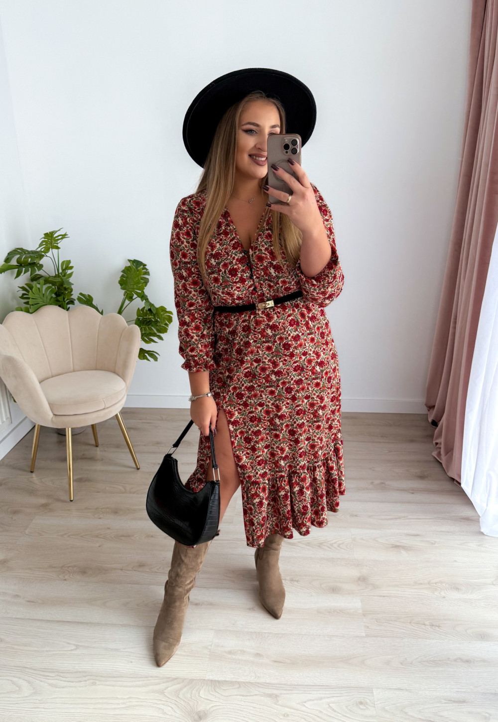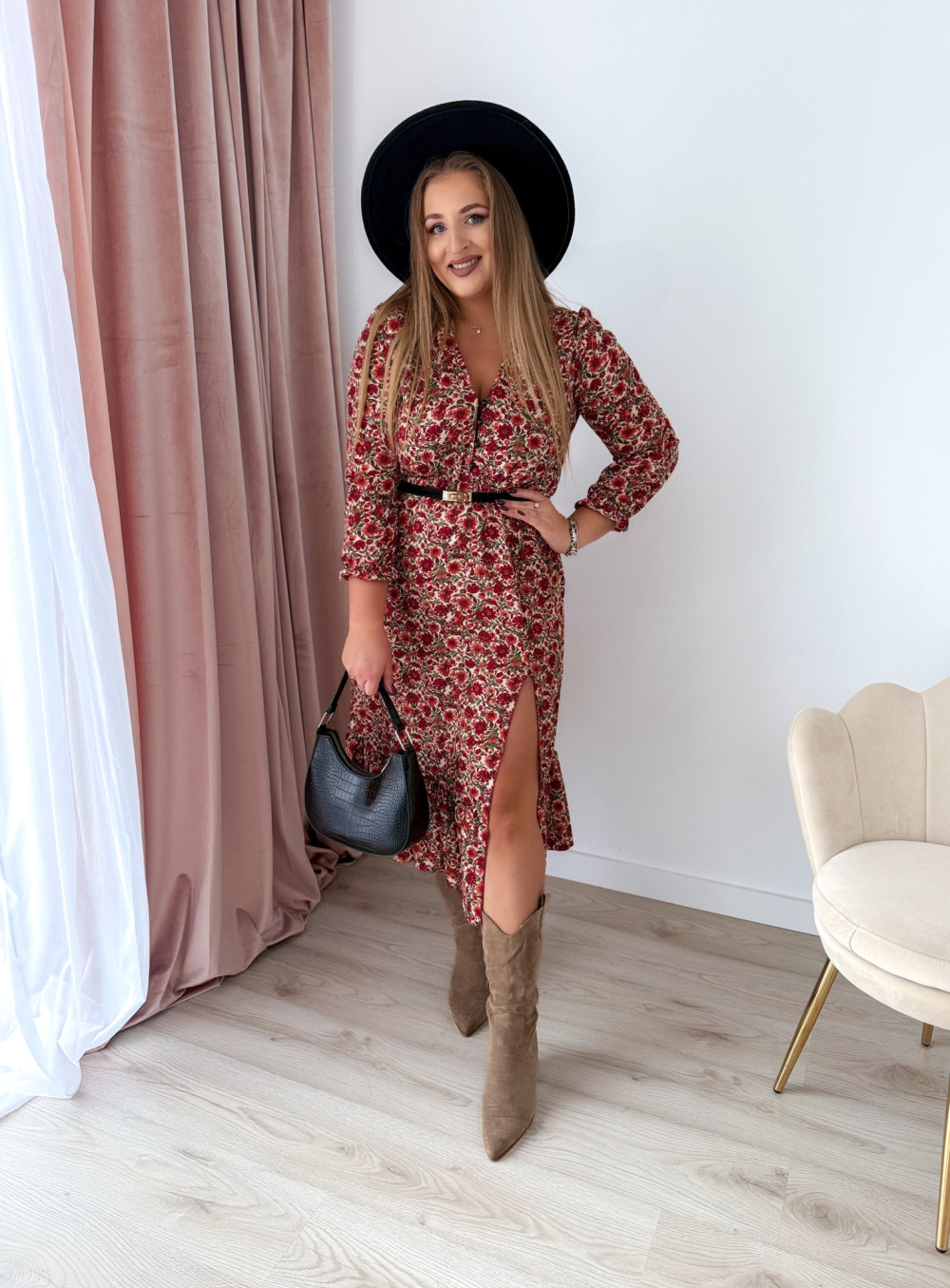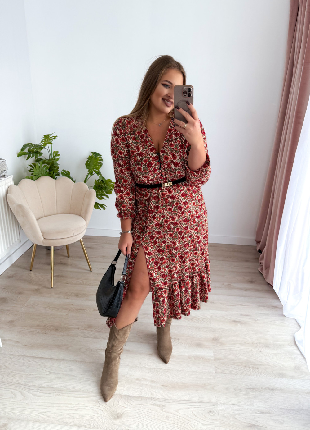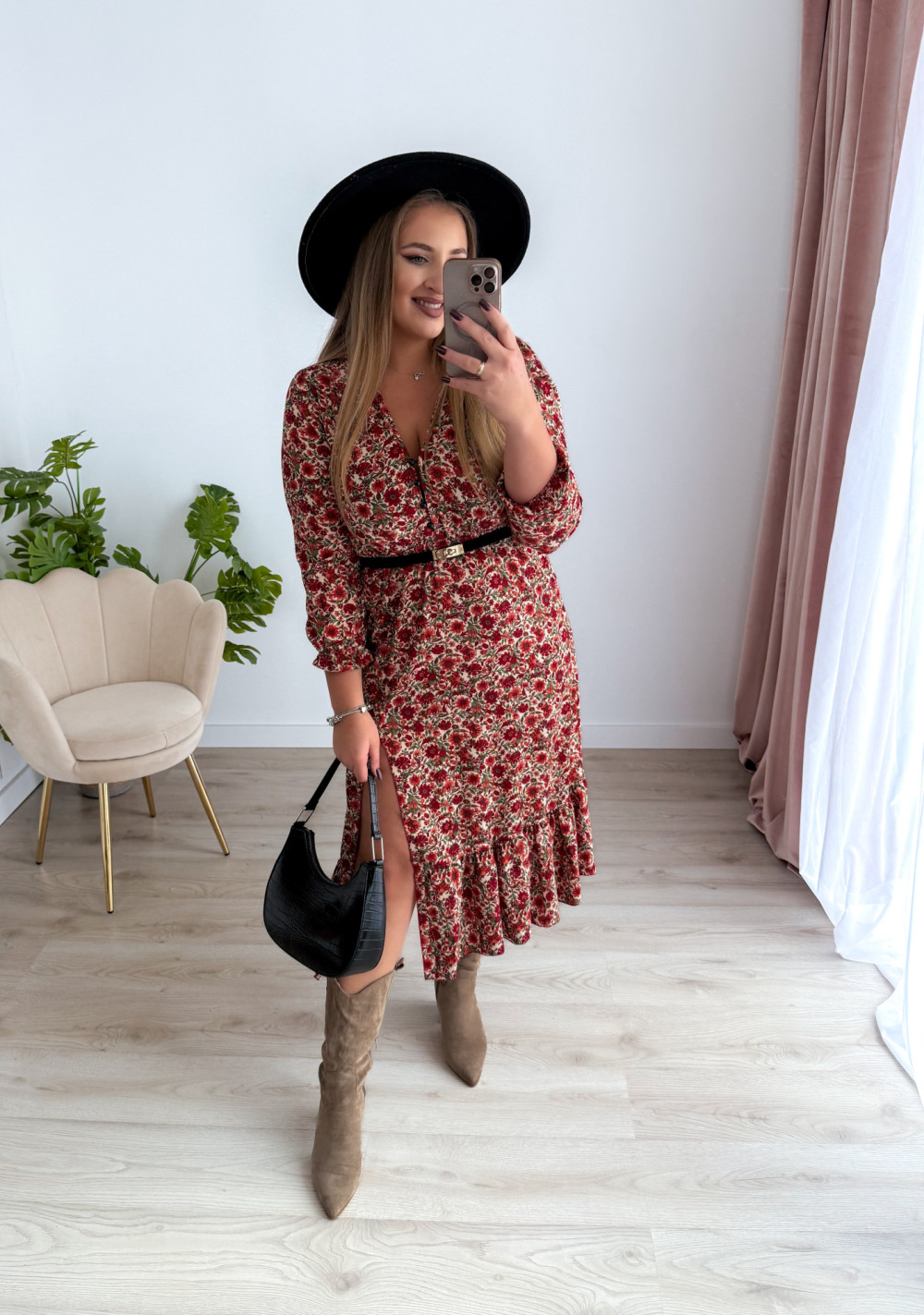 Sukienka midi z guzikami na dekolcie kremowa w koralowe kwiaty Sara