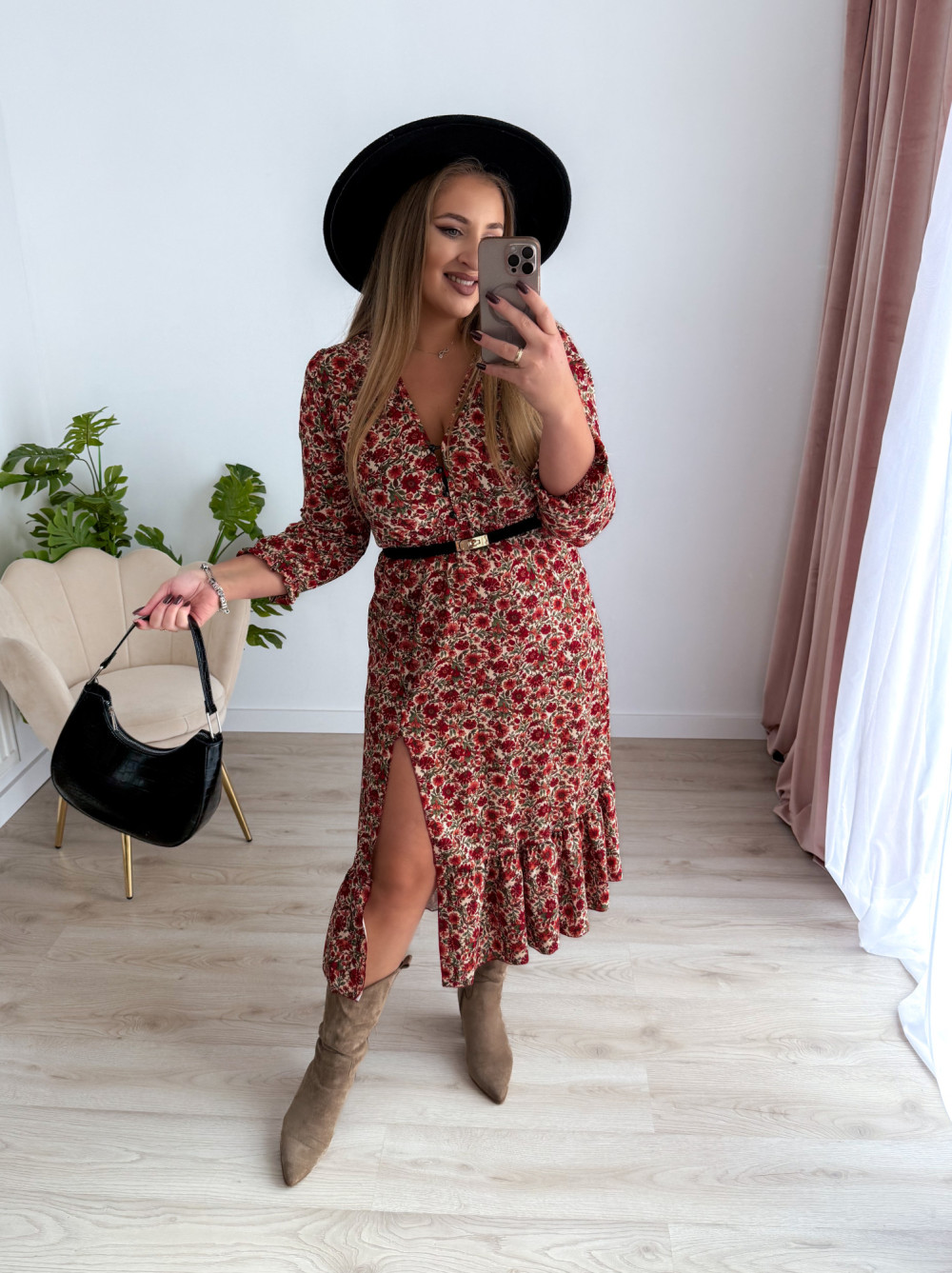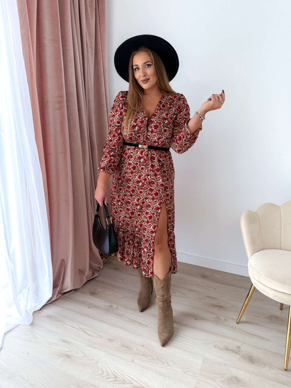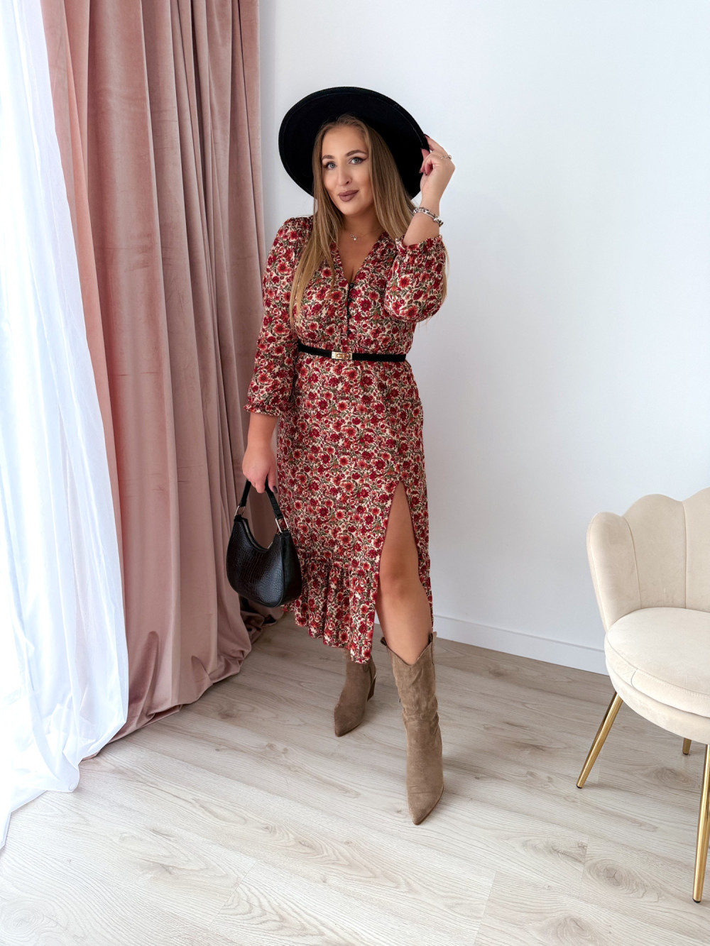 Sukienka midi z guzikami na dekolcie kremowa w koralowe kwiaty Sara