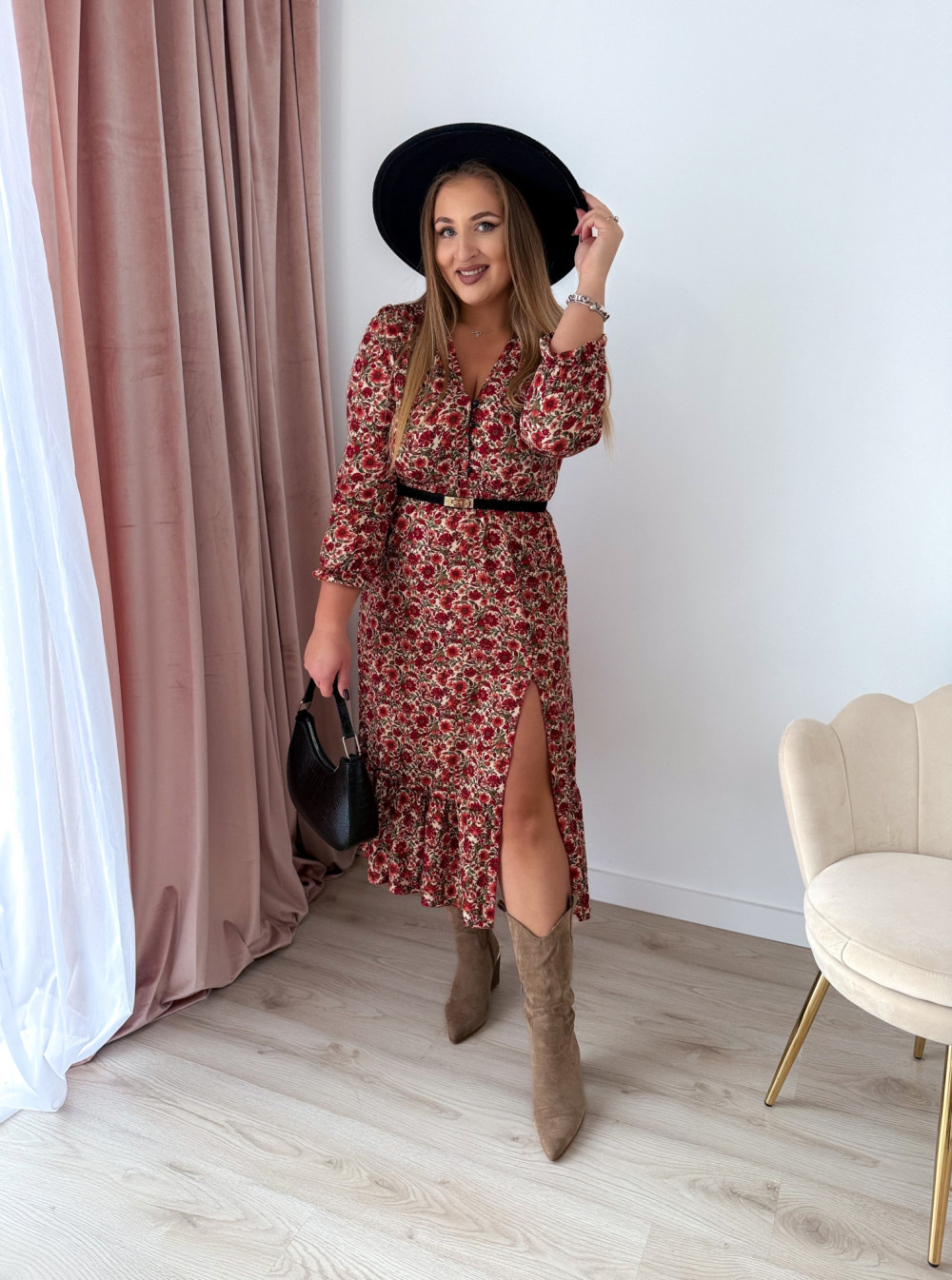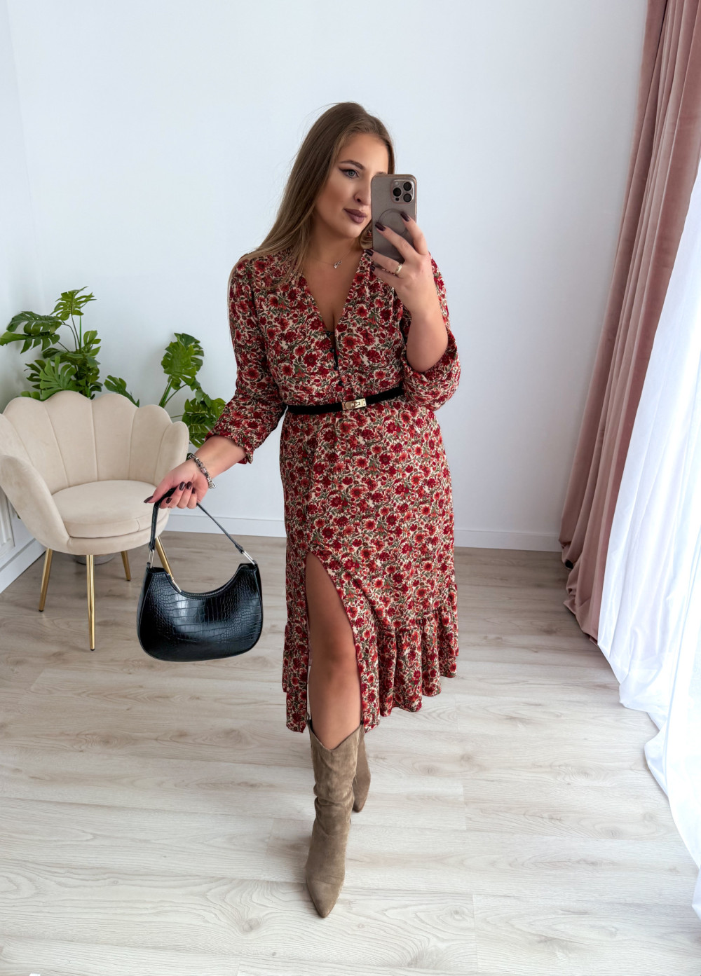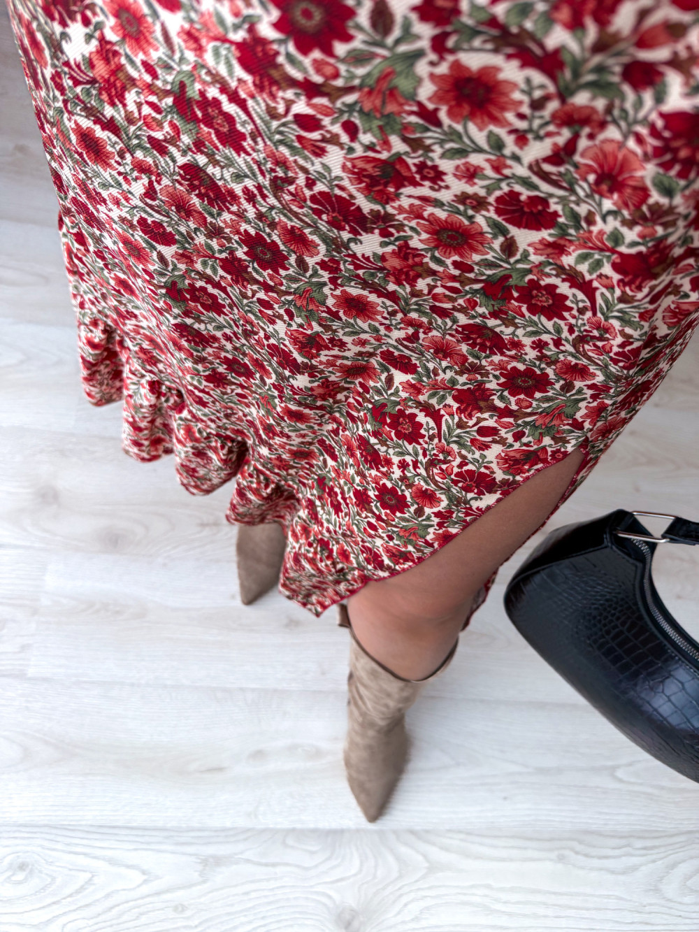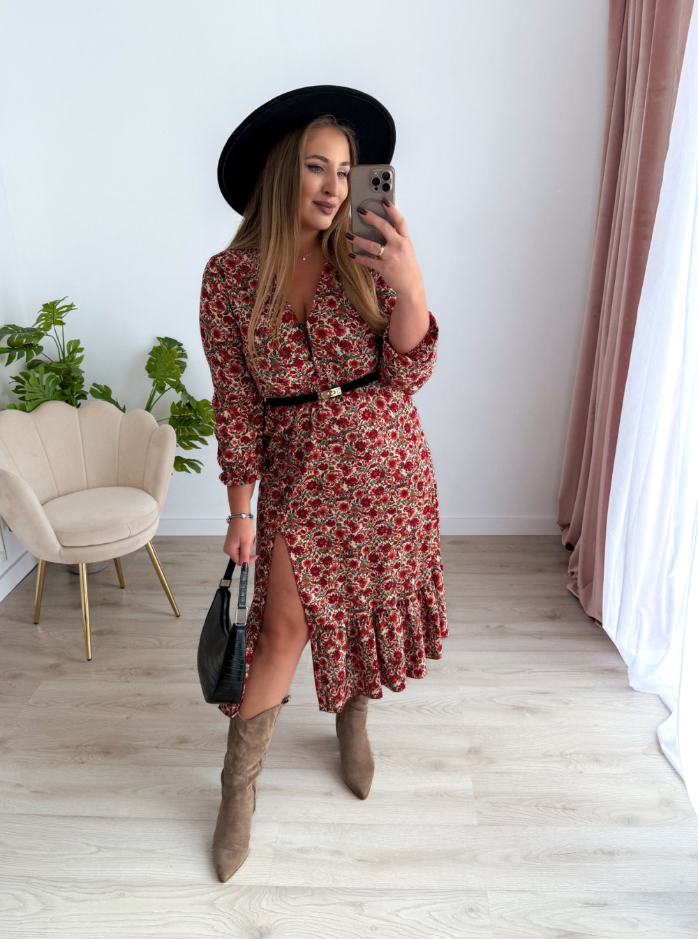 Sukienka midi z guzikami na dekolcie kremowa w koralowe kwiaty Sara