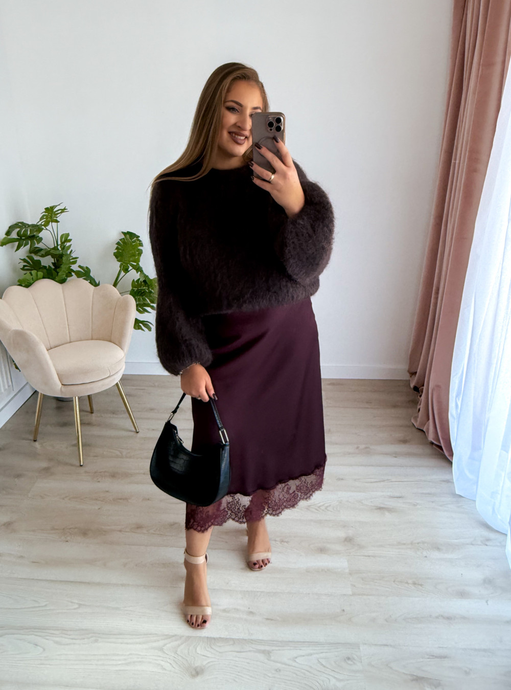 Satynowa spódnica maxi to połączenie elegancji i kobiecego wdzięku. Lekko połyskujący materiał pięknie układa się na sylwetce, a subtelna koronka na dole dodaje całości wyjątkowego charakteru.
