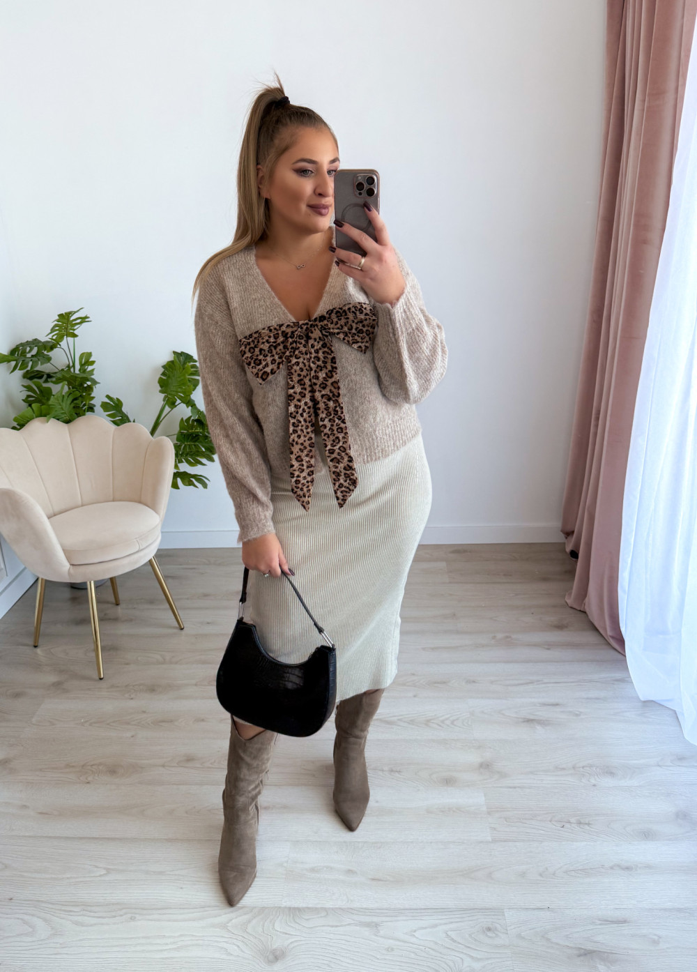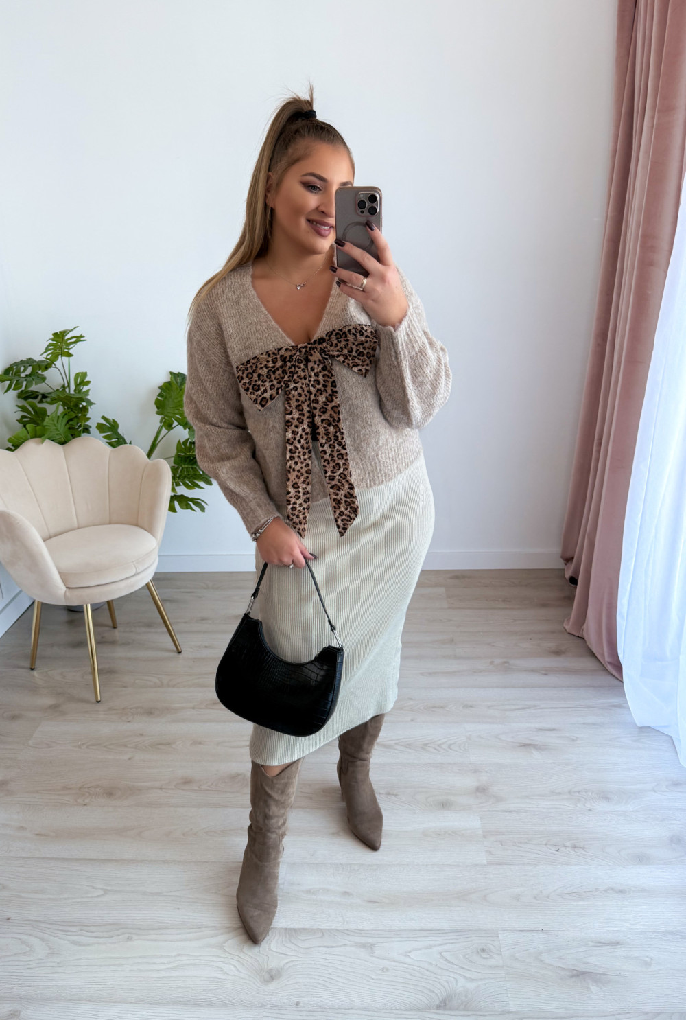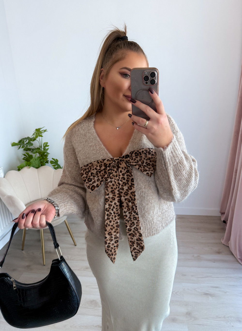 Urocze sweterki z panterkową kokardą to połączenie słodkiego akcentu i wygodnego fasonu. Kokarda jest przyszyta na stałe, dzięki czemu zawsze pięknie zdobi całość. Sweterki mają formę narzutki z subtelnym rozcięciem z przodu, a miękki materiał sprawia, że są niezwykle komfortowe w noszeniu.