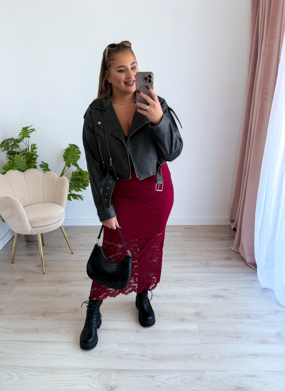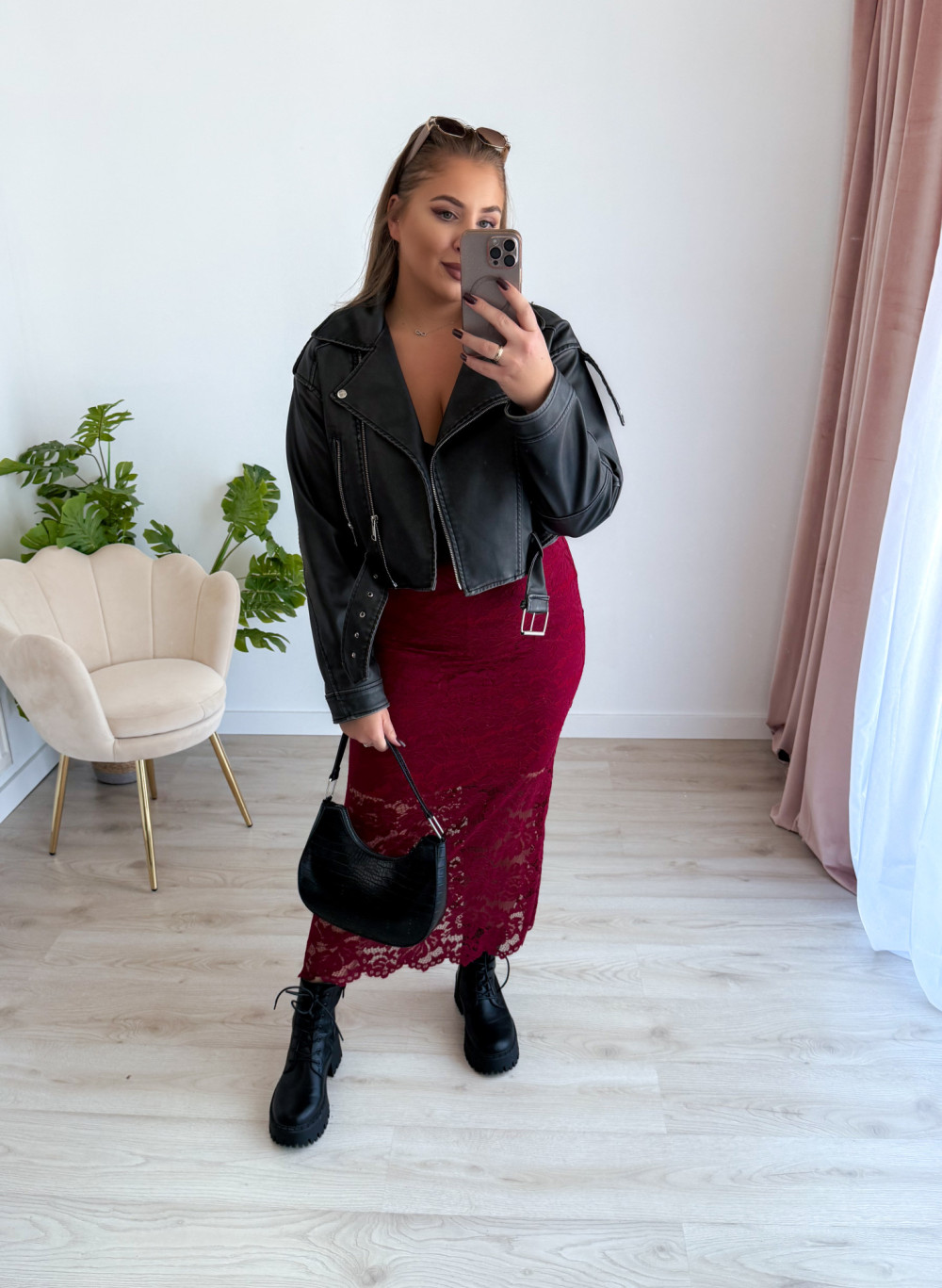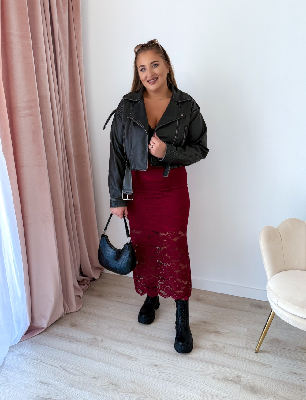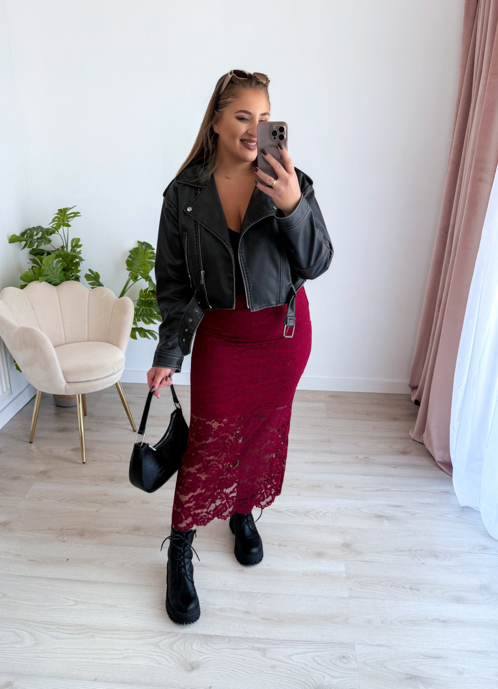 Koronkowa spódnica maxi to elegancja i wygoda w jednym – idealna propozycja na jesienne stylizacje. Elastyczna koronka pięknie się układa, a podszewka do kolan zapewnia komfort noszenia i subtelne wykończenie.