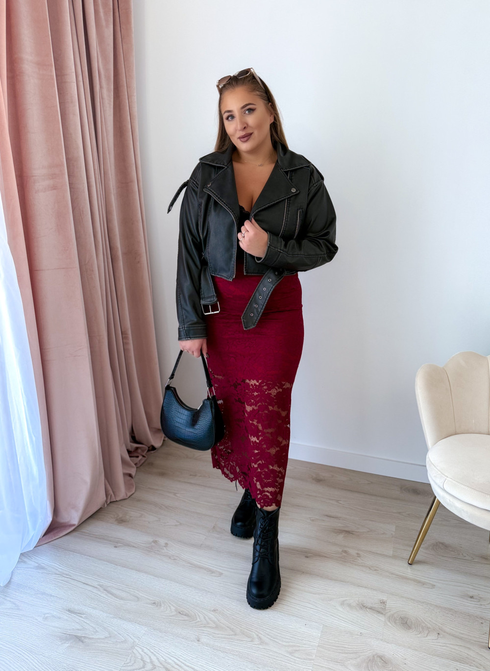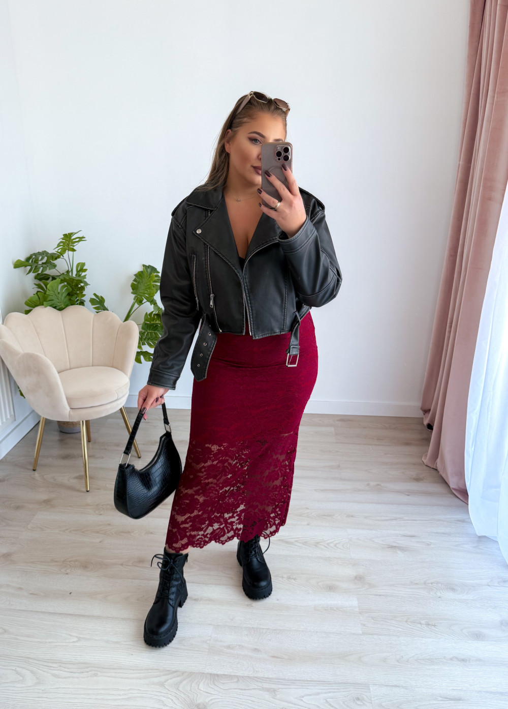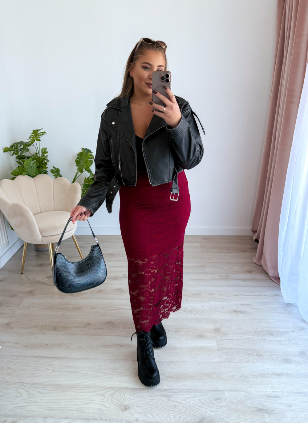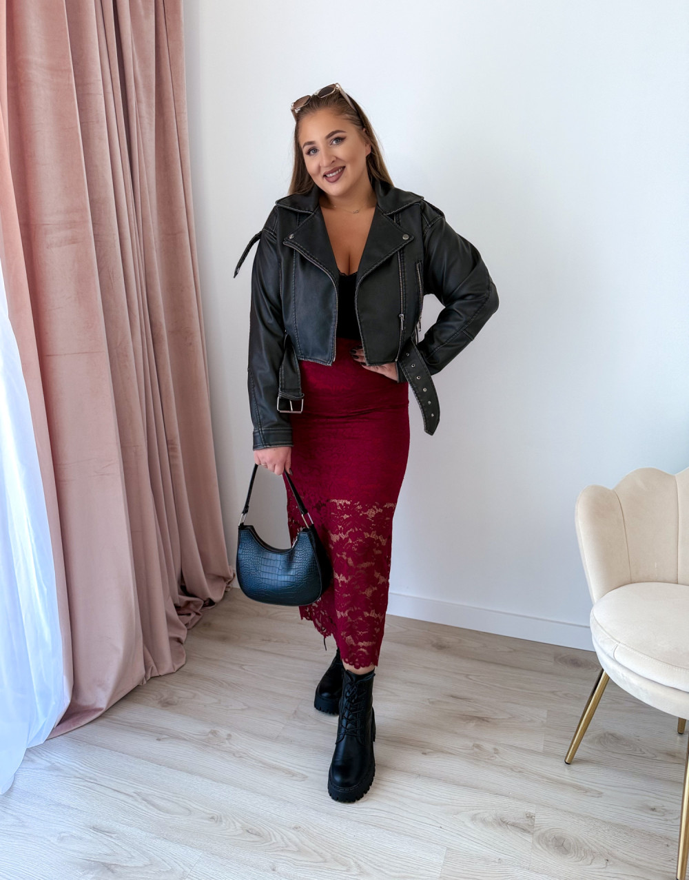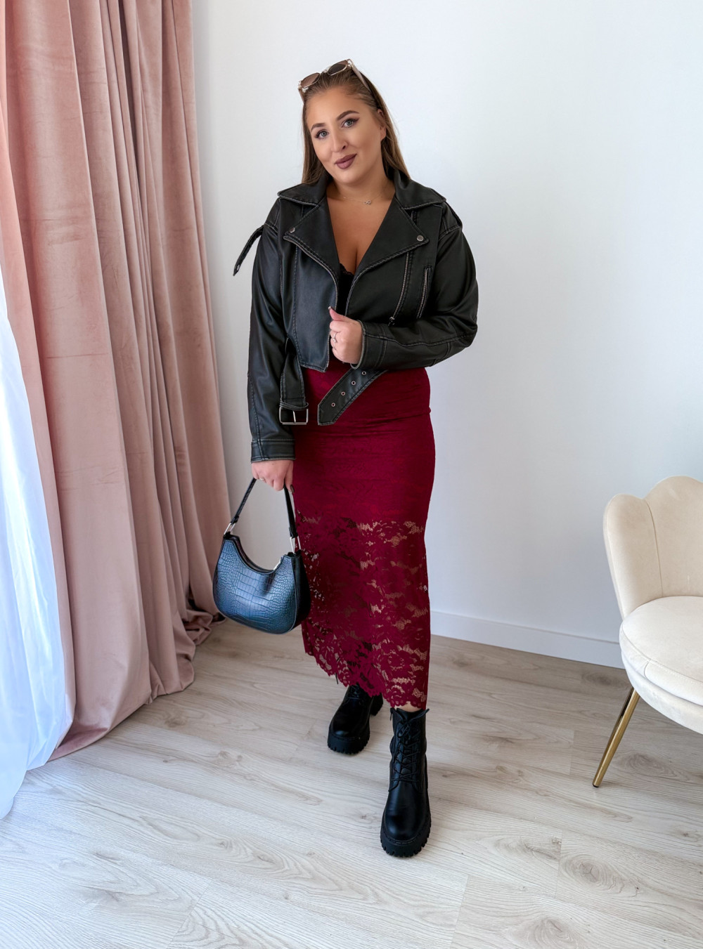 Koronkowa spódnica maxi to elegancja i wygoda w jednym – idealna propozycja na jesienne stylizacje. Elastyczna koronka pięknie się układa, a podszewka do kolan zapewnia komfort noszenia i subtelne wykończenie.