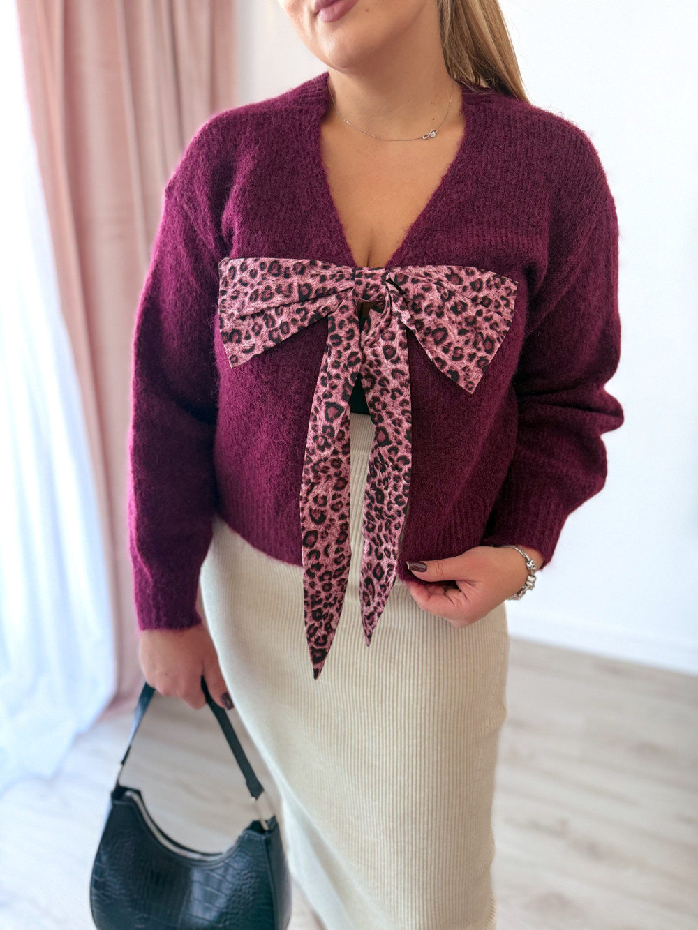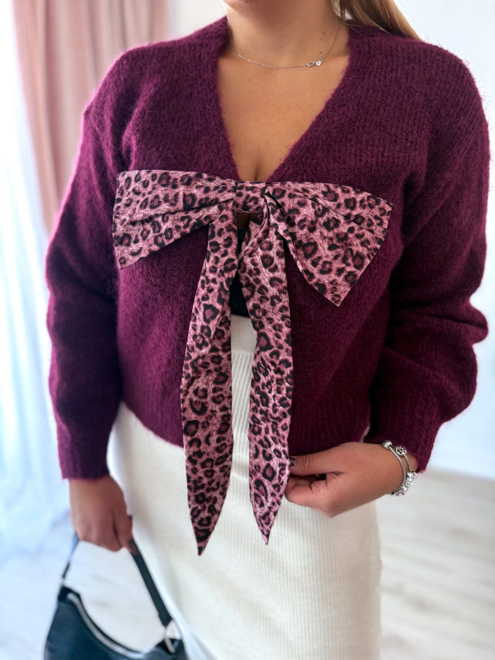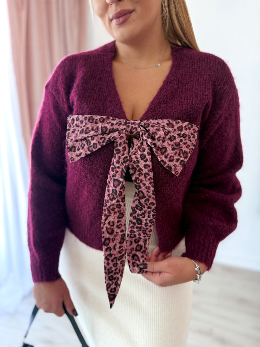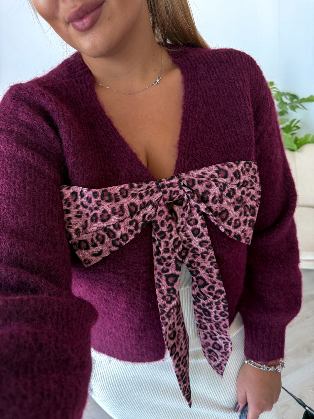 Sweter z panterkową kokardą Wild - śliwka