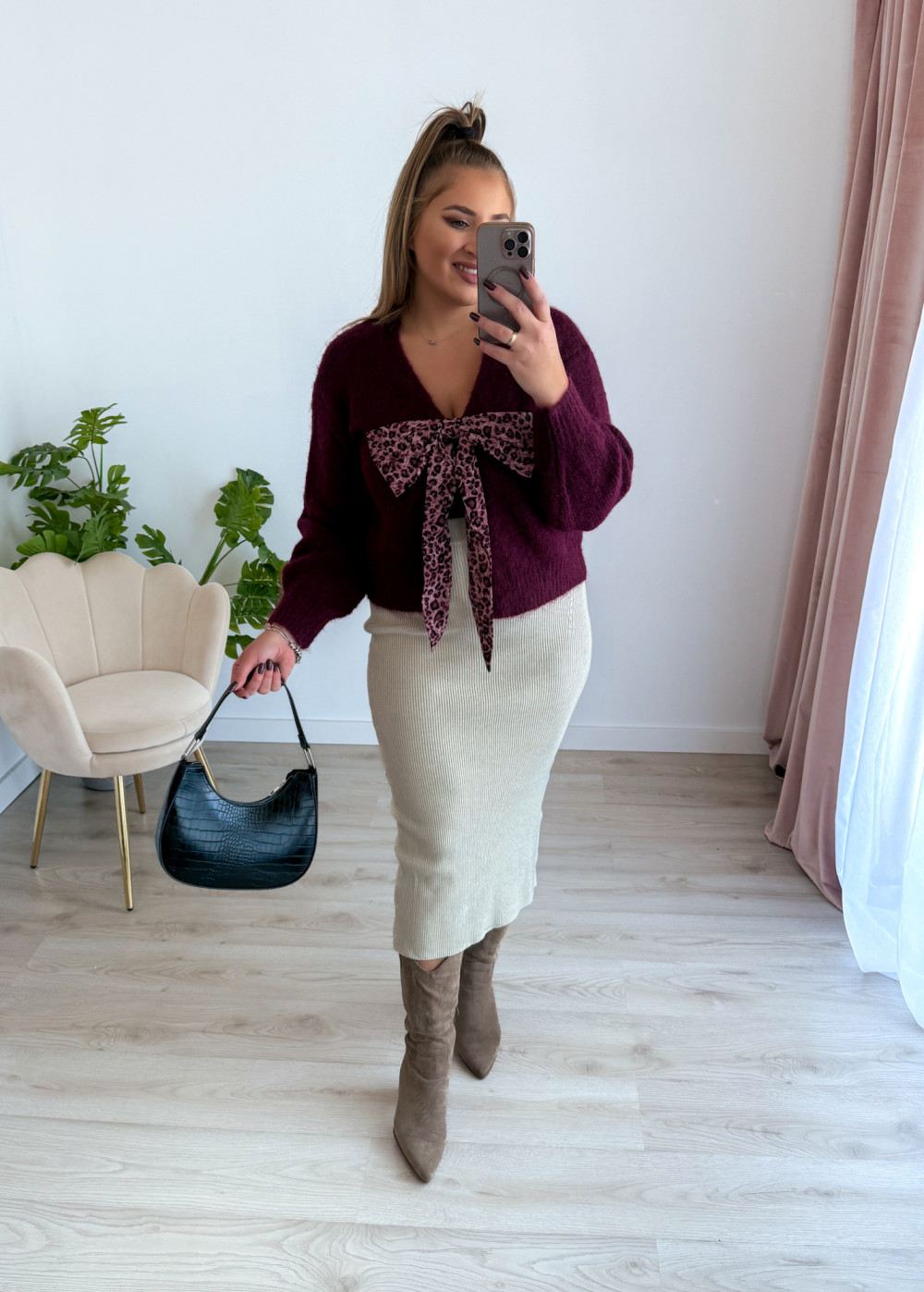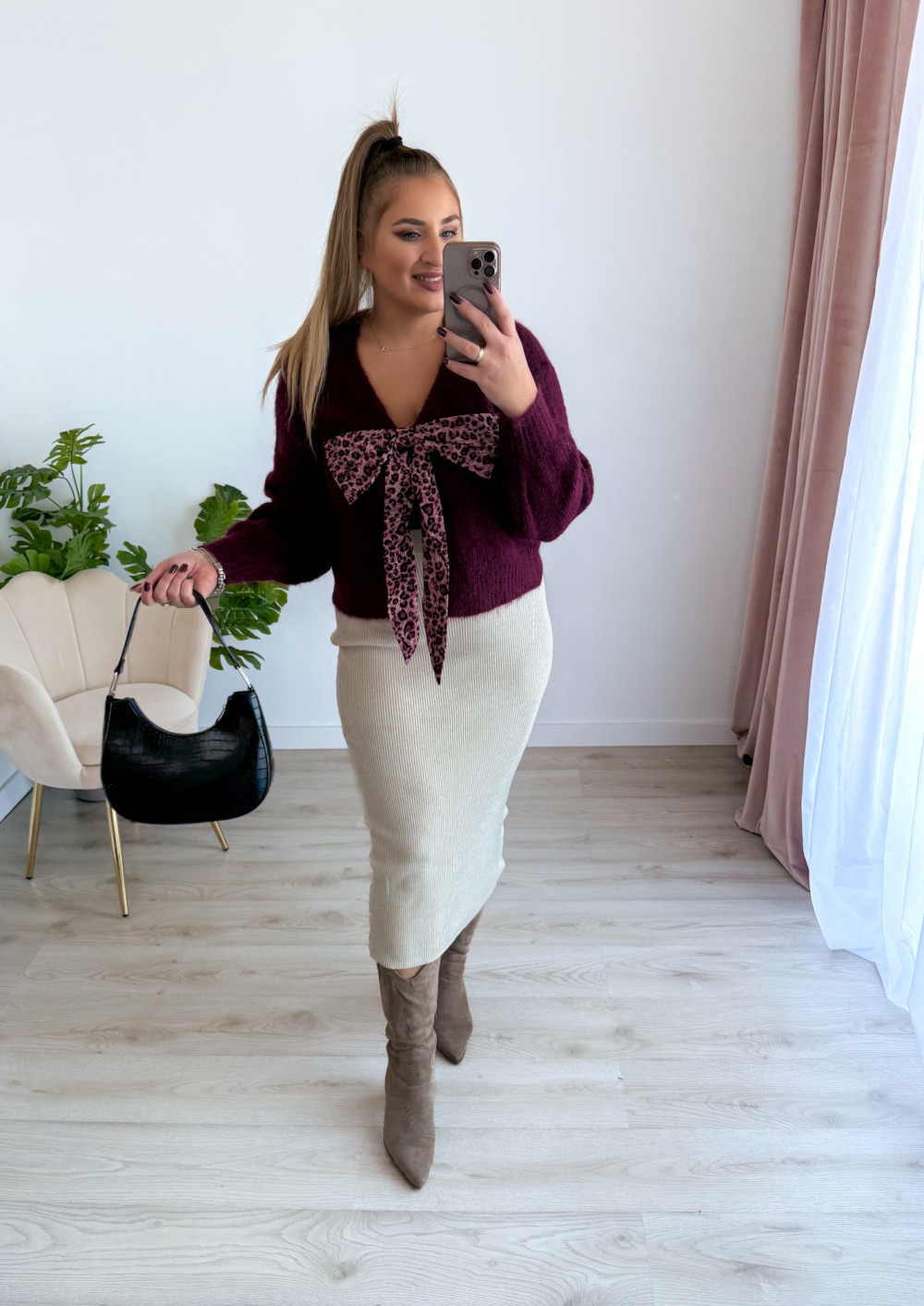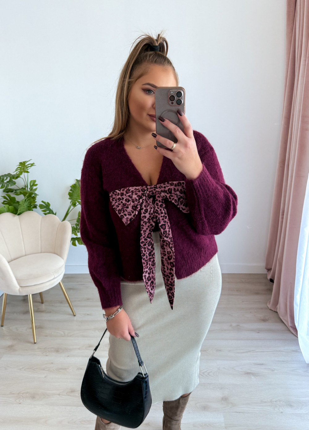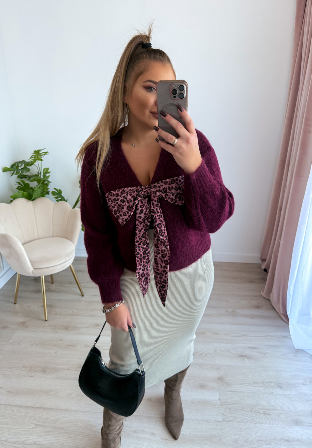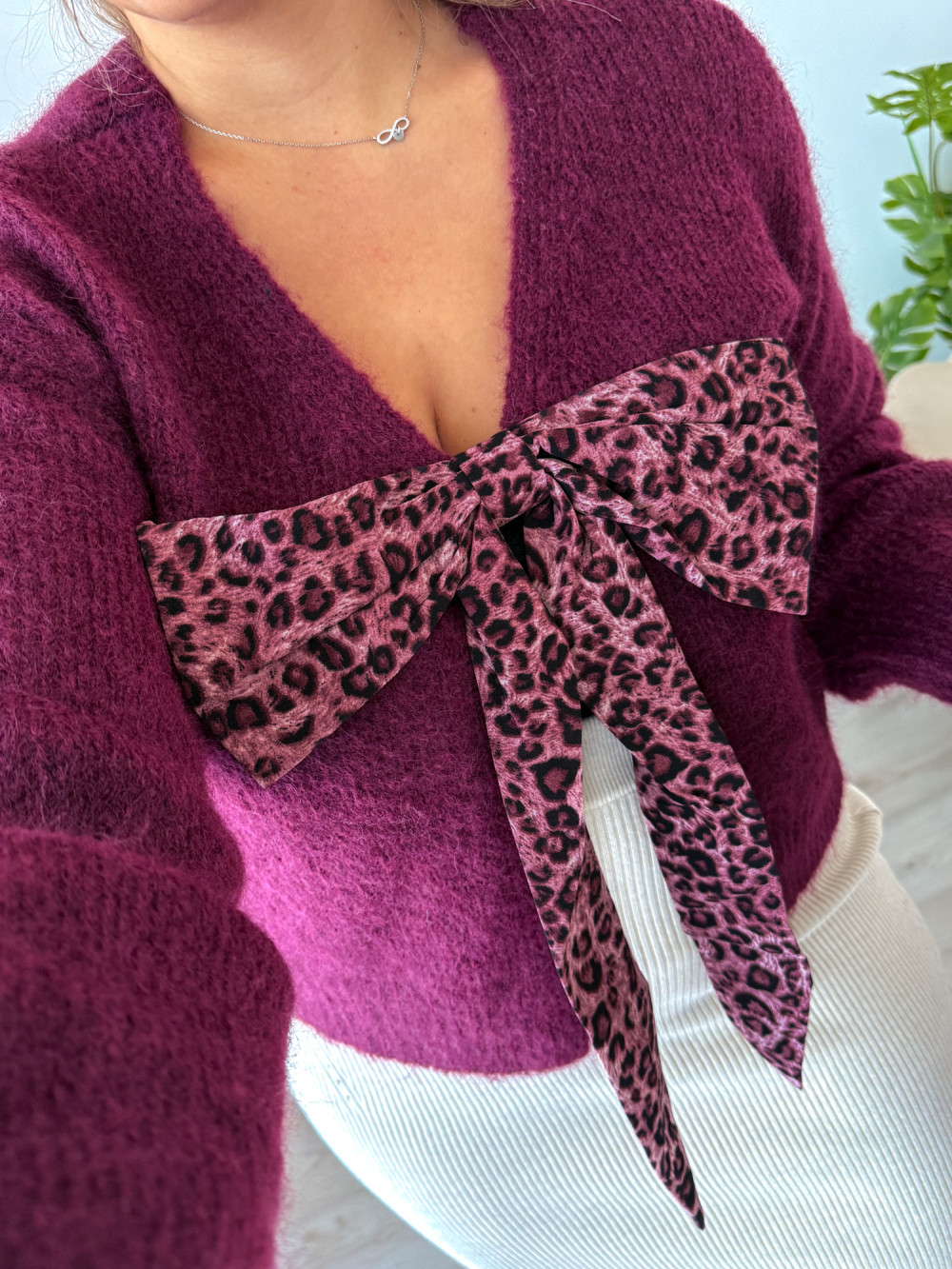Sweter z panterkową kokardą Wild - śliwka