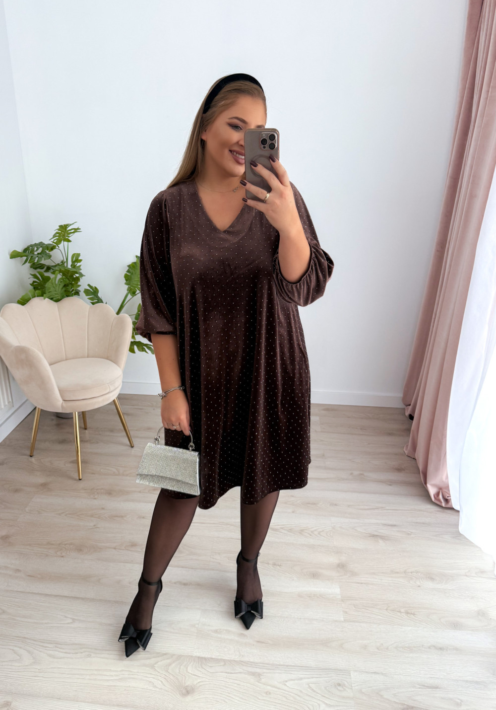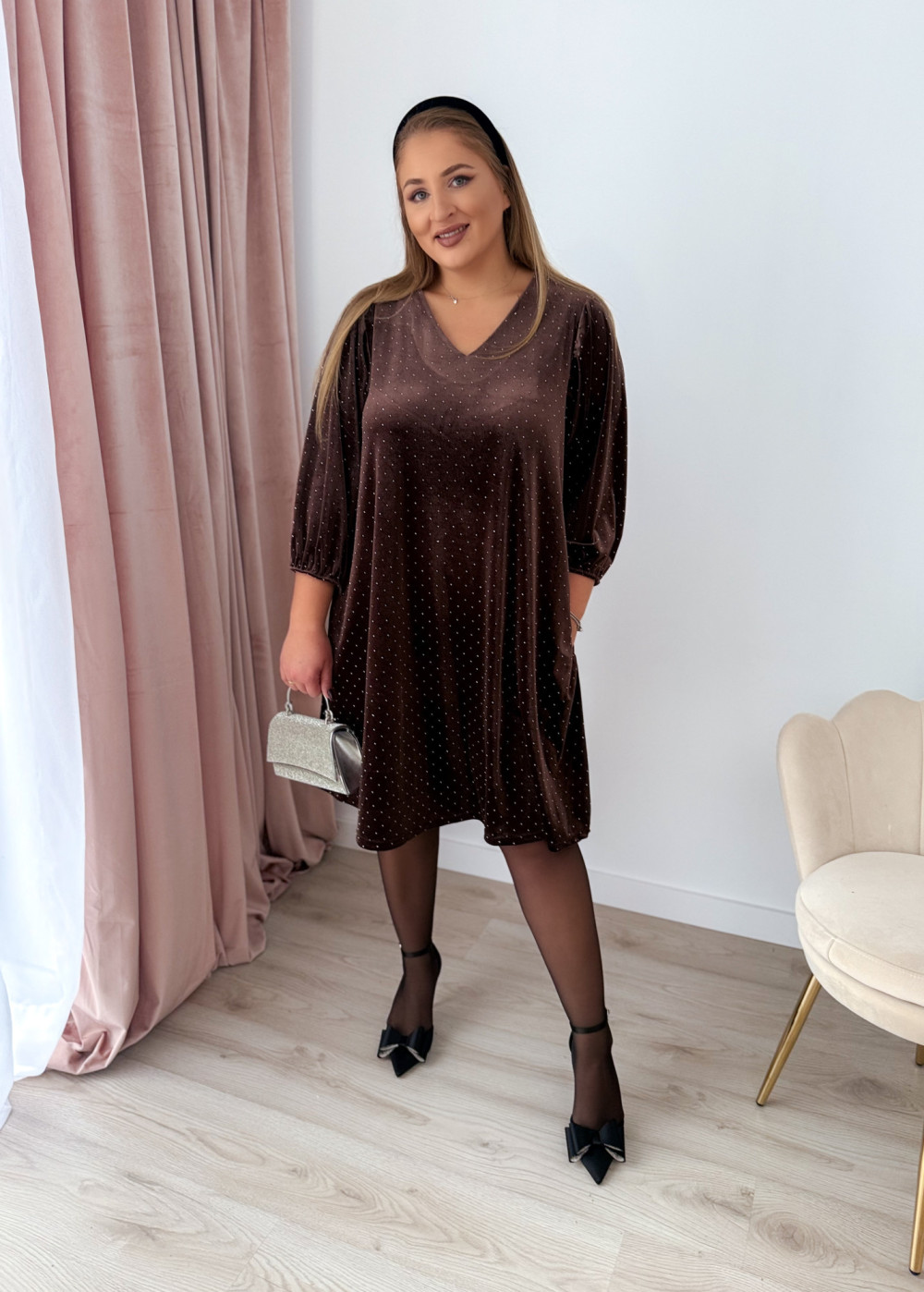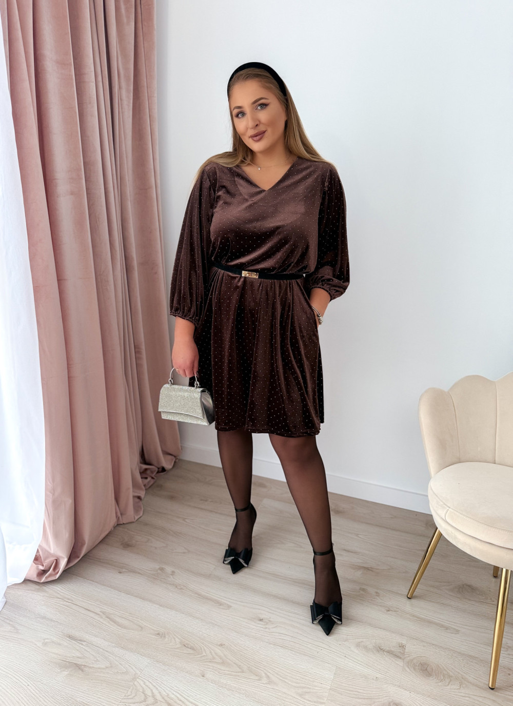 Sukienka welurowa o trapezowym kroju z diamencikami Apolonia - czekolada