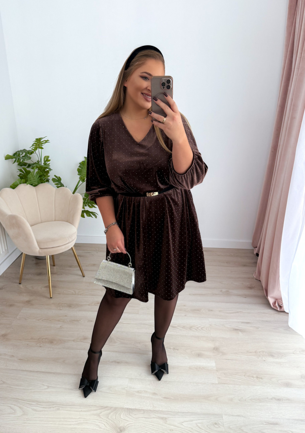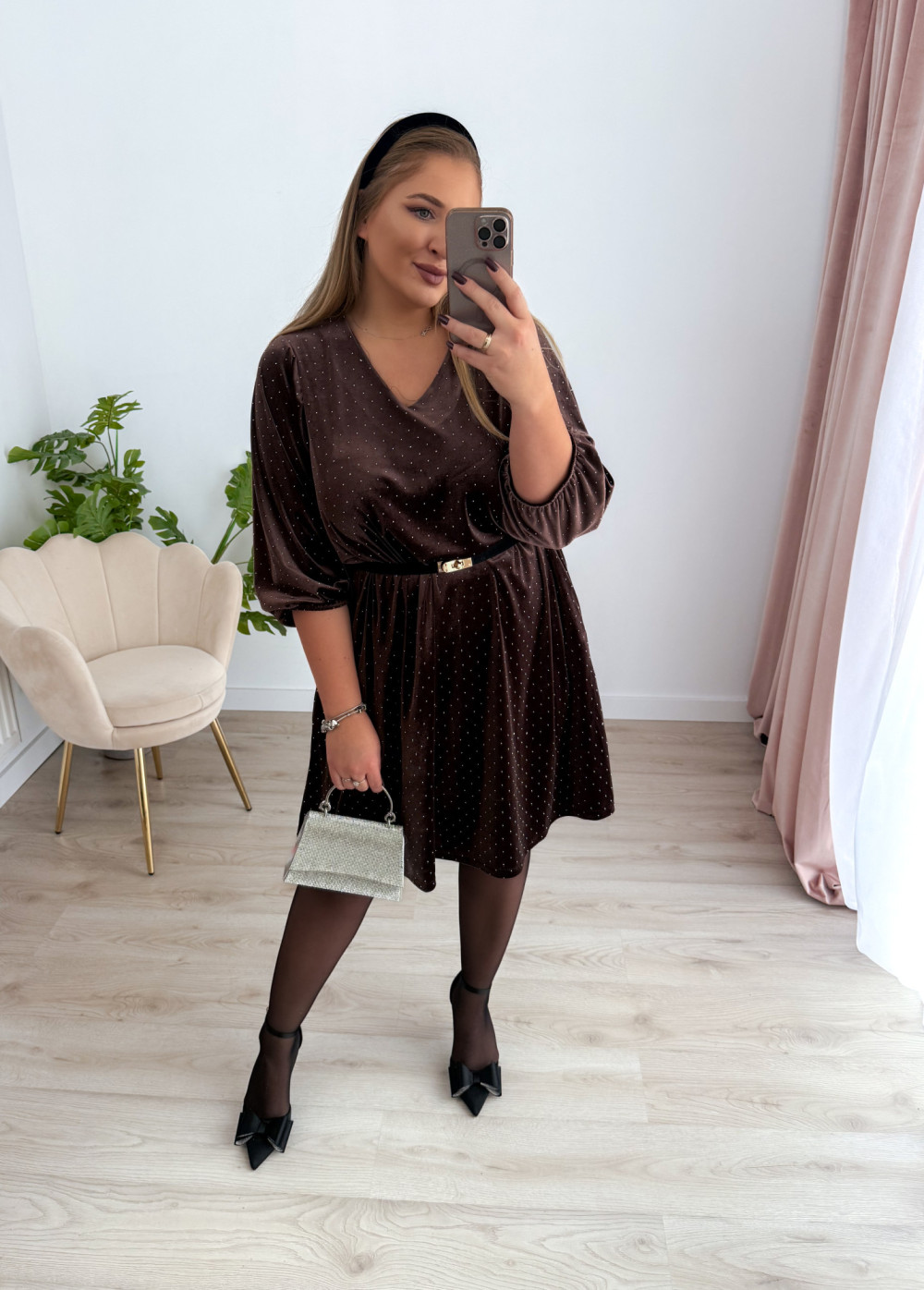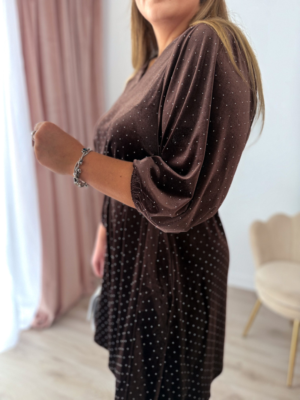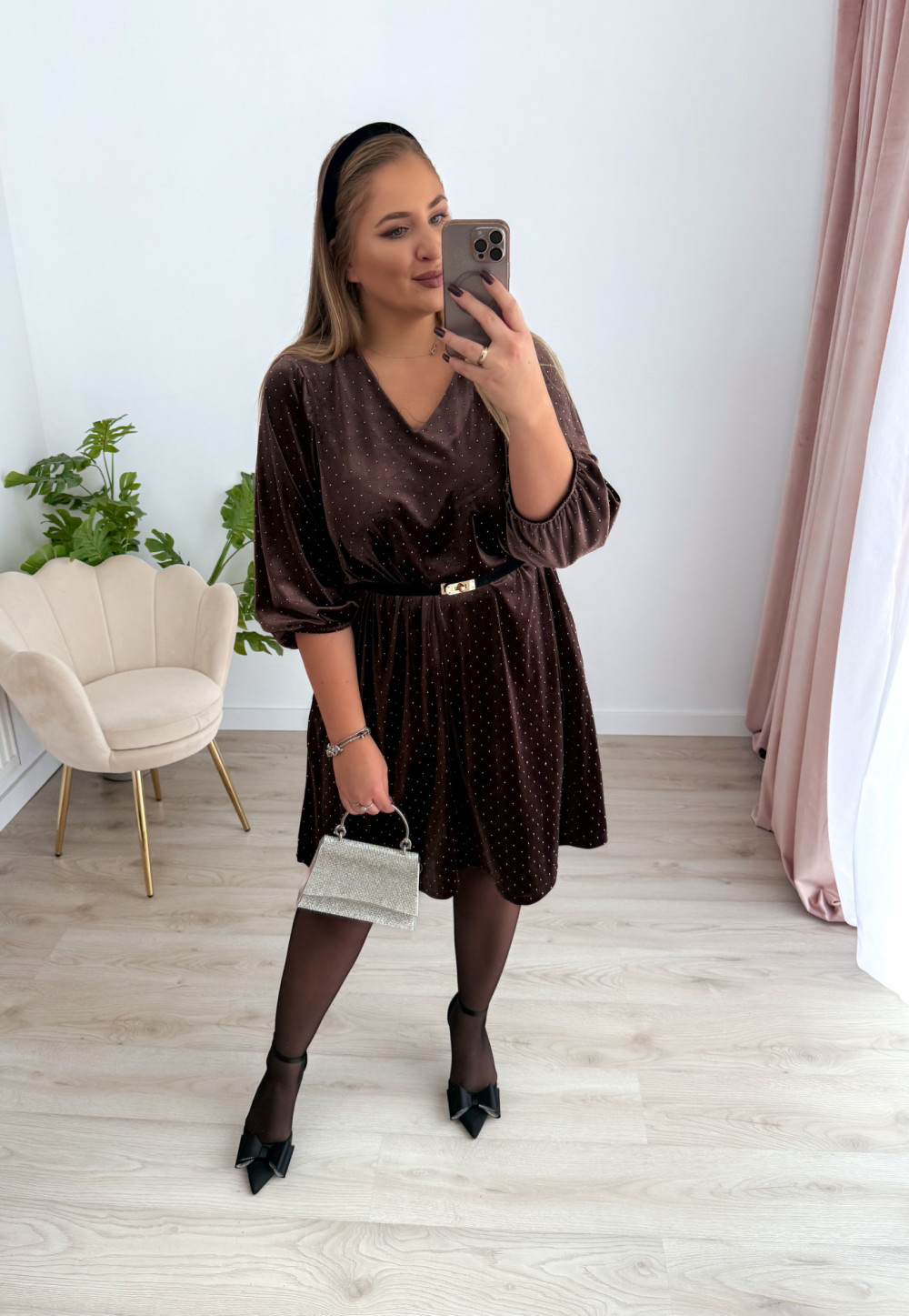 Sukienka welurowa o trapezowym kroju z diamencikami Apolonia - czekolada