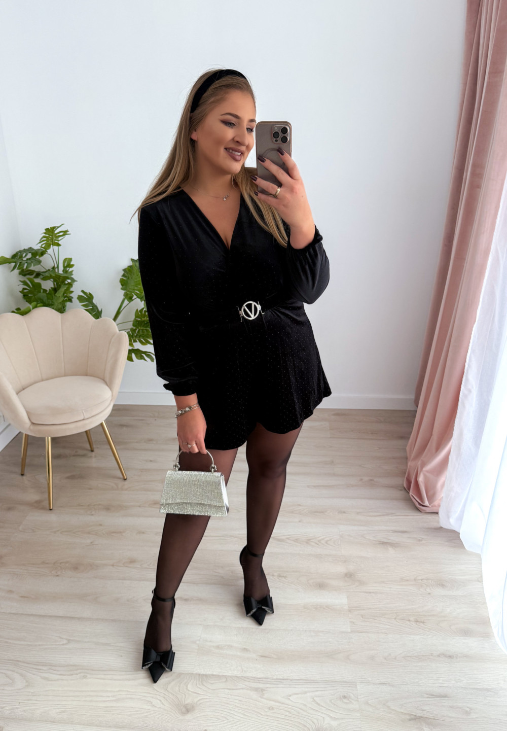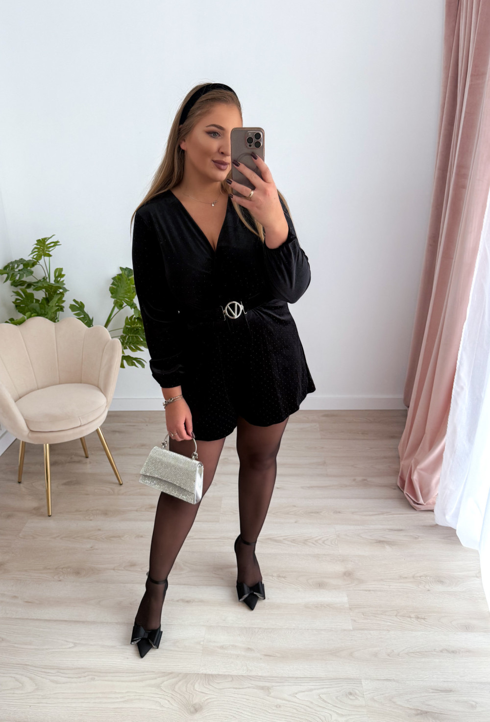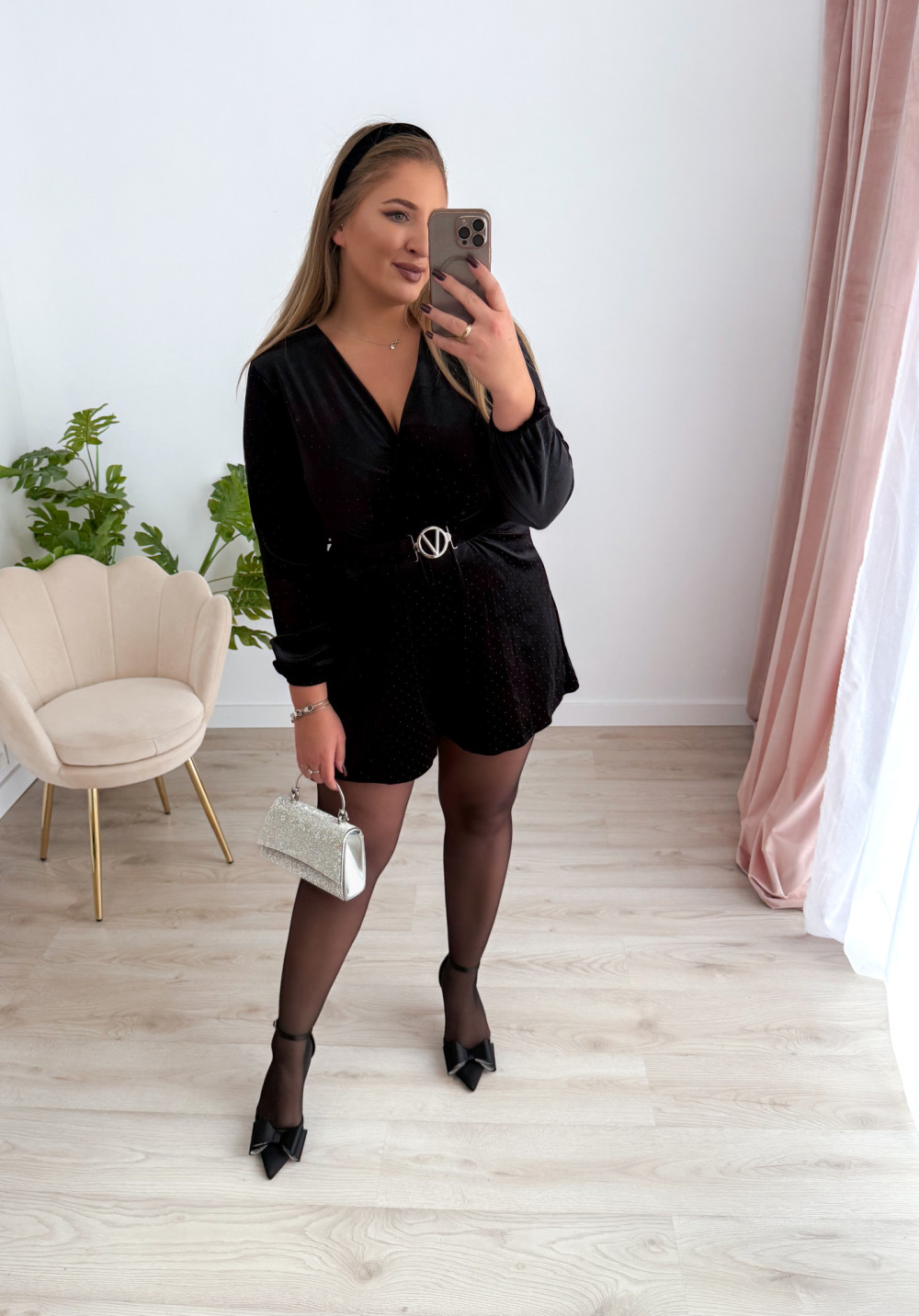 Zachwycający kombinezon welurowy, który łączy wygodę z elegancją! Uszyty z miękkiego, elastycznego weluru, ozdobionego subtelnymi czarnymi diamencikami, które dodają całości wyjątkowego blasku i stylu. Kopertowy dekolt pięknie podkreśla szyję i ramiona, a luźny krój spodenek zapewnia swobodę ruchów i niepowtarzalny komfort.