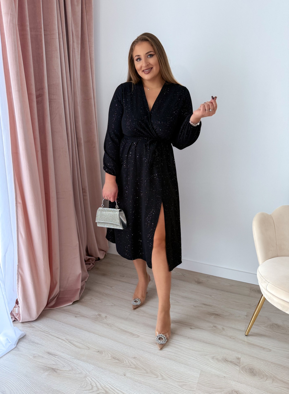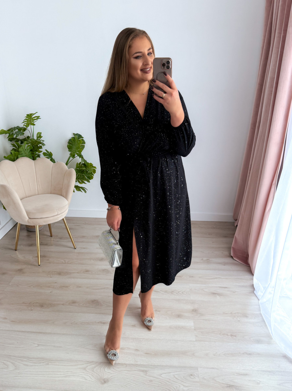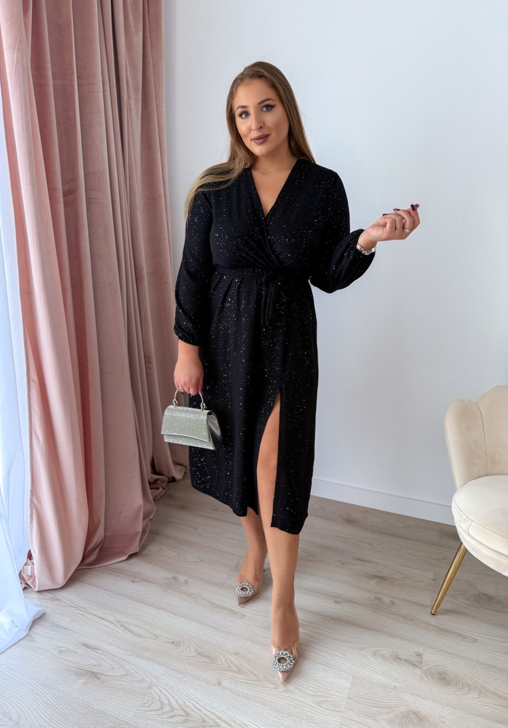 Sukienka nietoperzowa midi z rozcięciem na nogę i srebrnymi drobinkami Marina - czarna