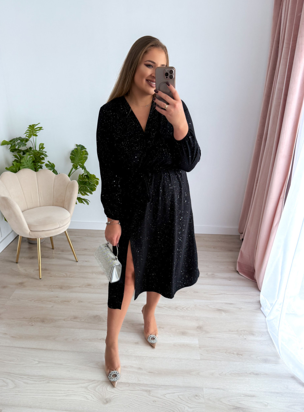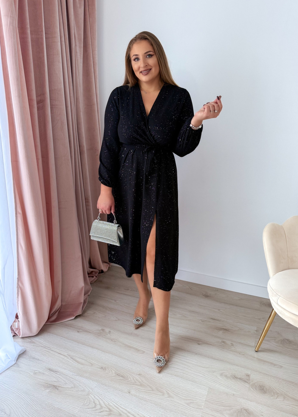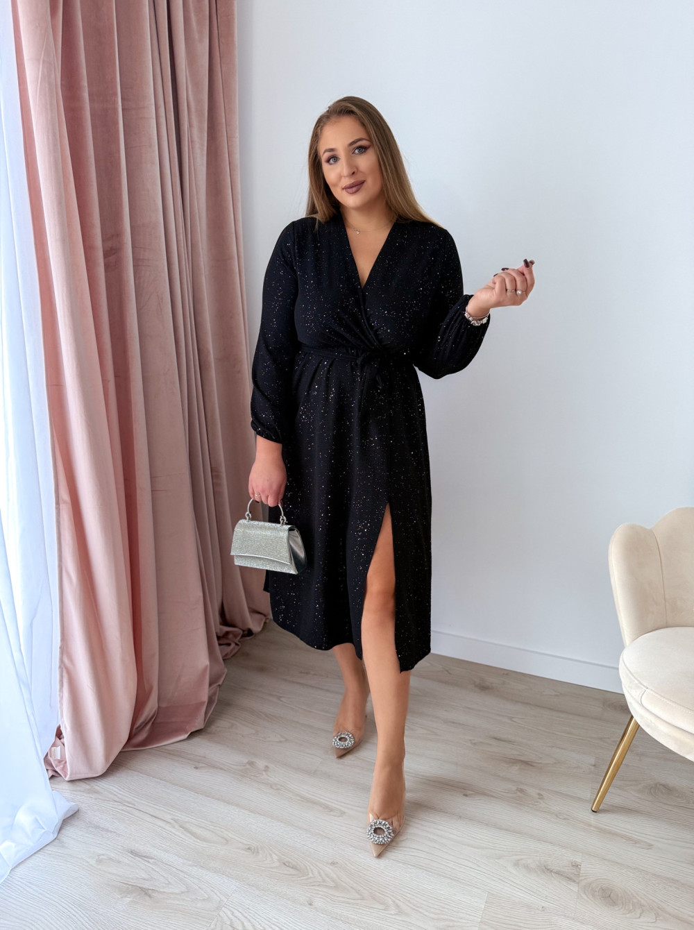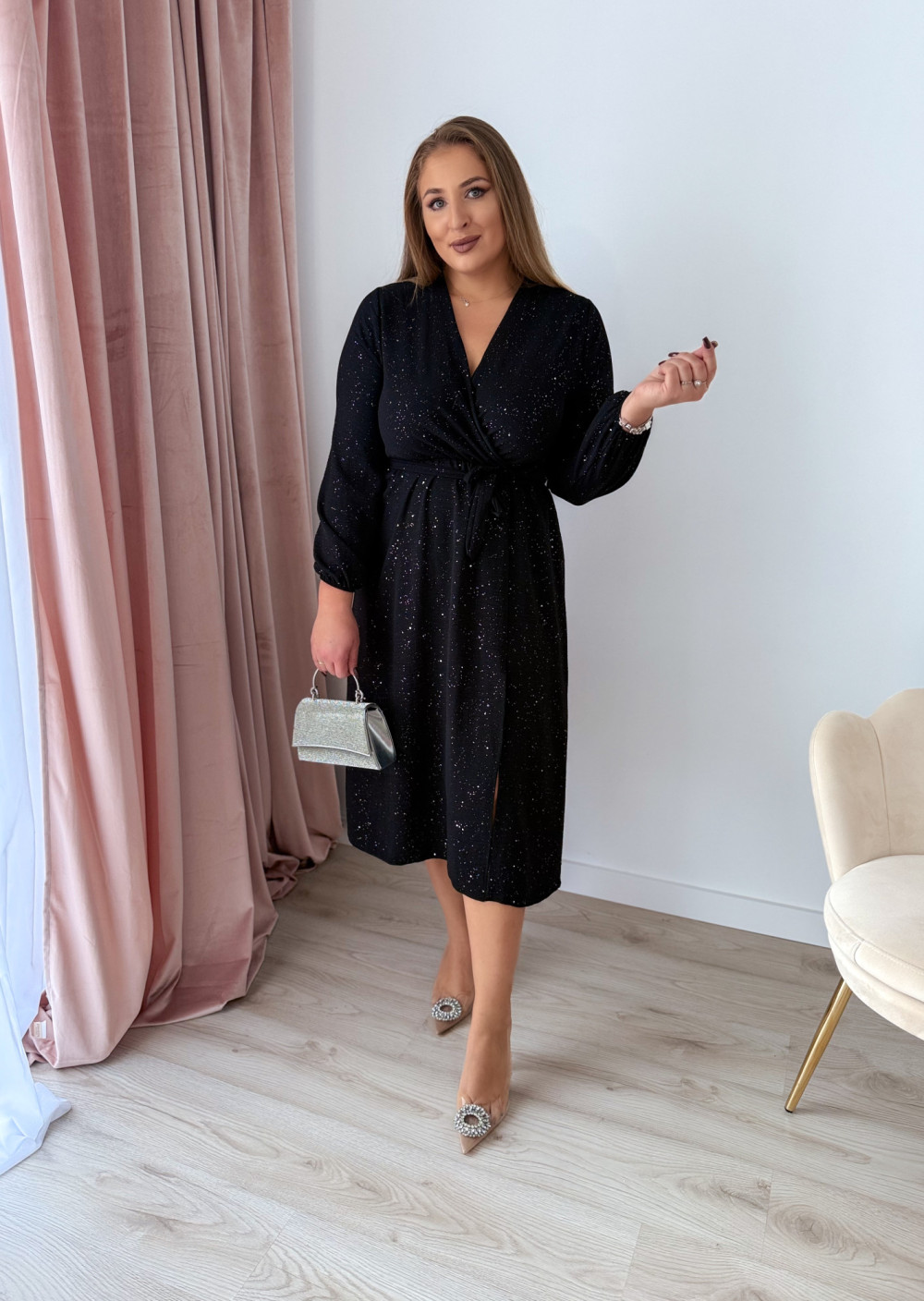 Sukienka nietoperzowa midi z rozcięciem na nogę i srebrnymi drobinkami Marina - czarna
