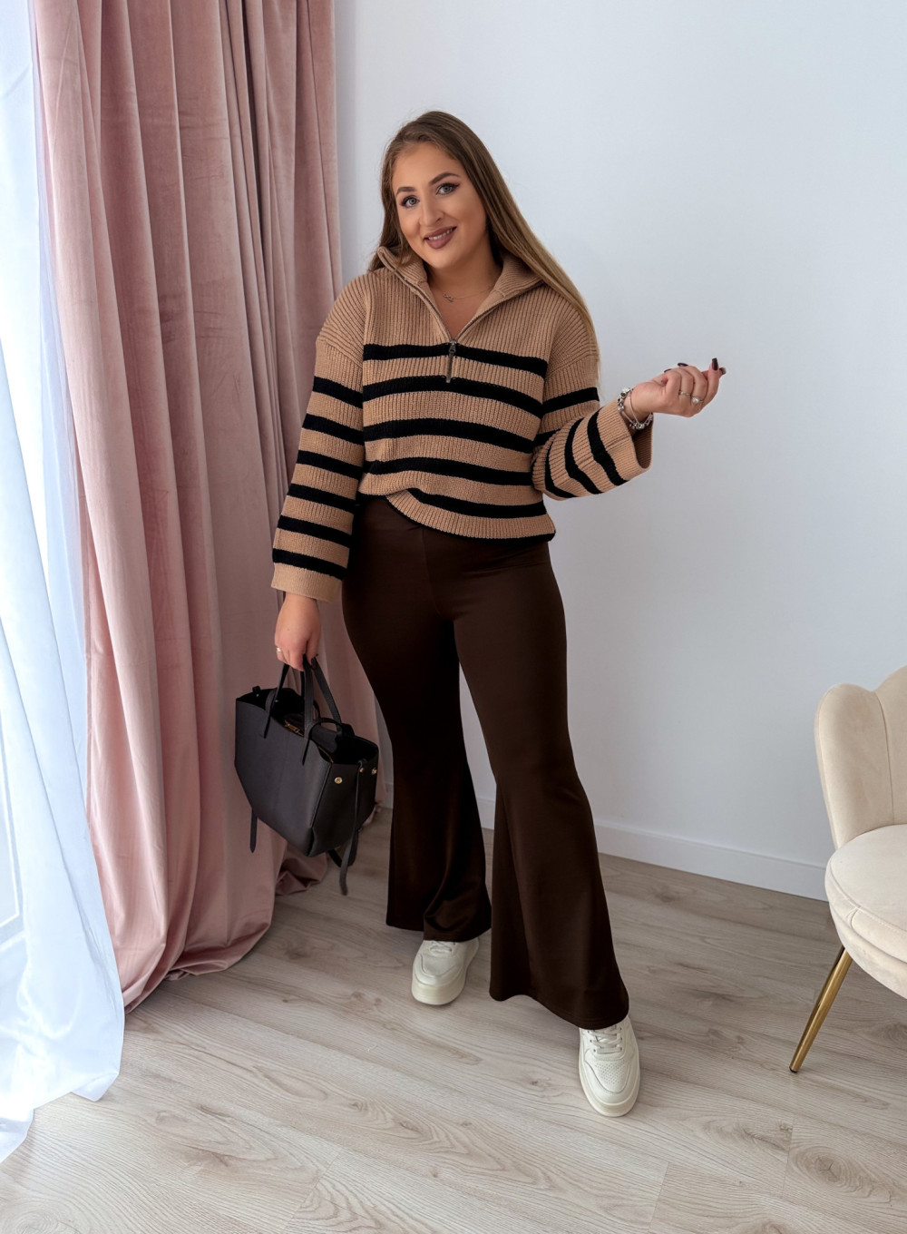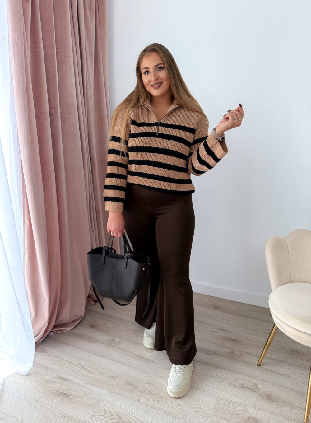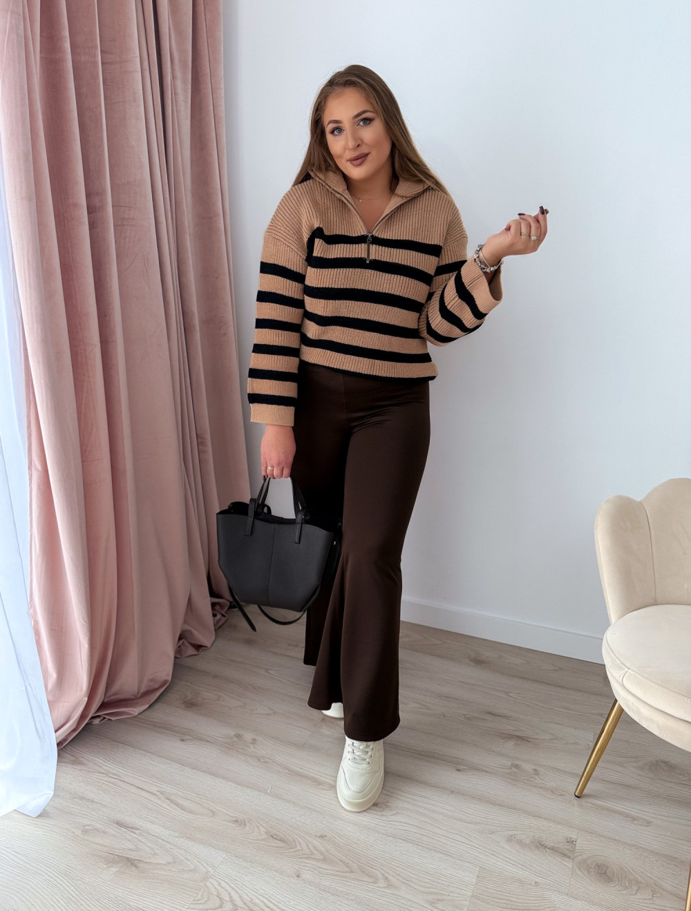 Sweter z zamkiem na dekolcie karmelowy w paski Aria