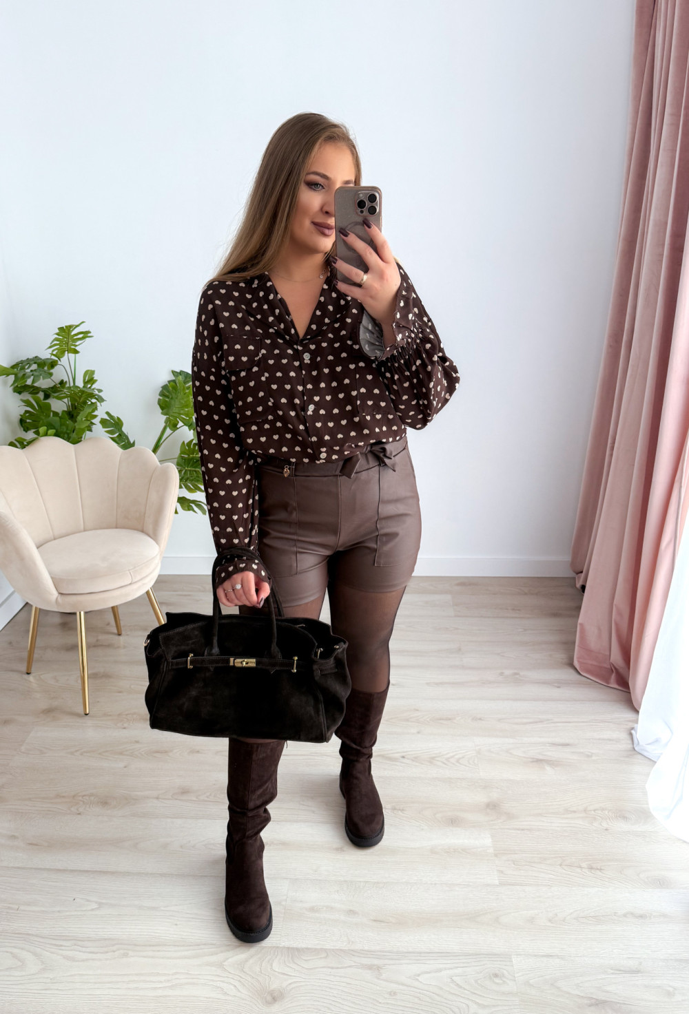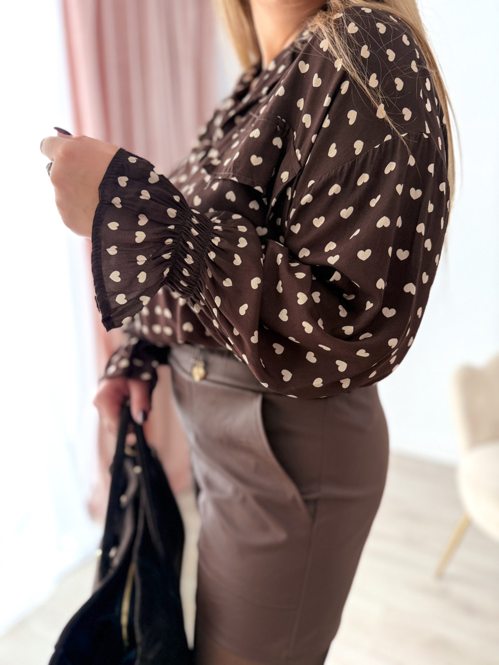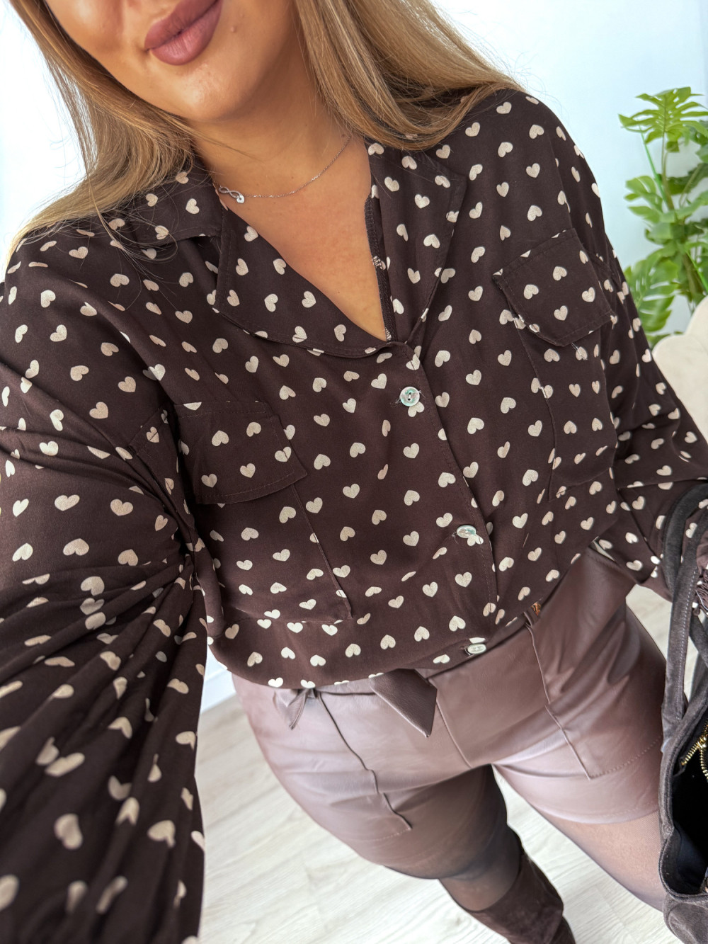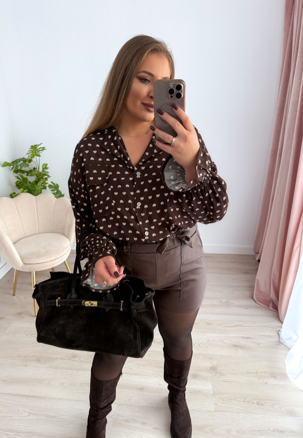 Stylowa koszula w kolorze czekoladowym z delikatnym wzorem w serduszka to propozycja dla kobiet ceniących elegancję z nutą romantyzmu. Klasyczny krój z kołnierzykiem i długim rękawem sprawia, że doskonale sprawdzi się zarówno w codziennych, jak i bardziej formalnych stylizacjach. Zapinana na guziki, wykonana z przyjemnego w dotyku materiału, zapewnia wygodę i świetne dopasowanie.