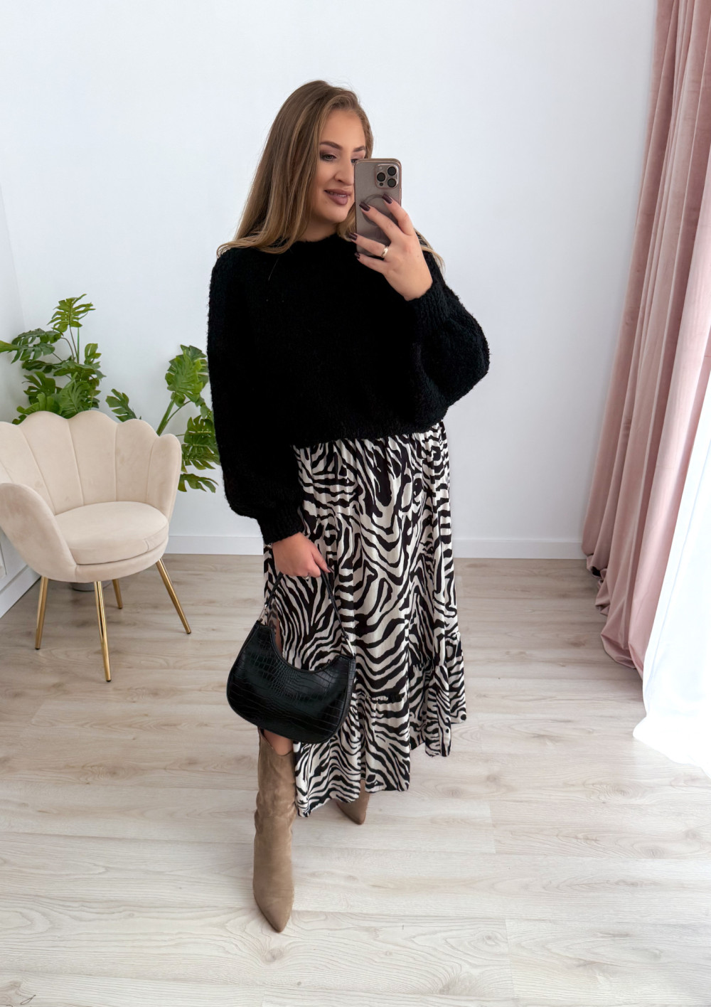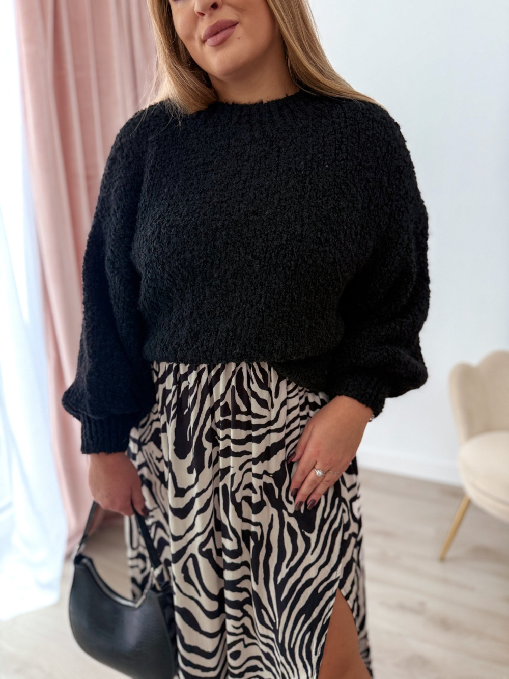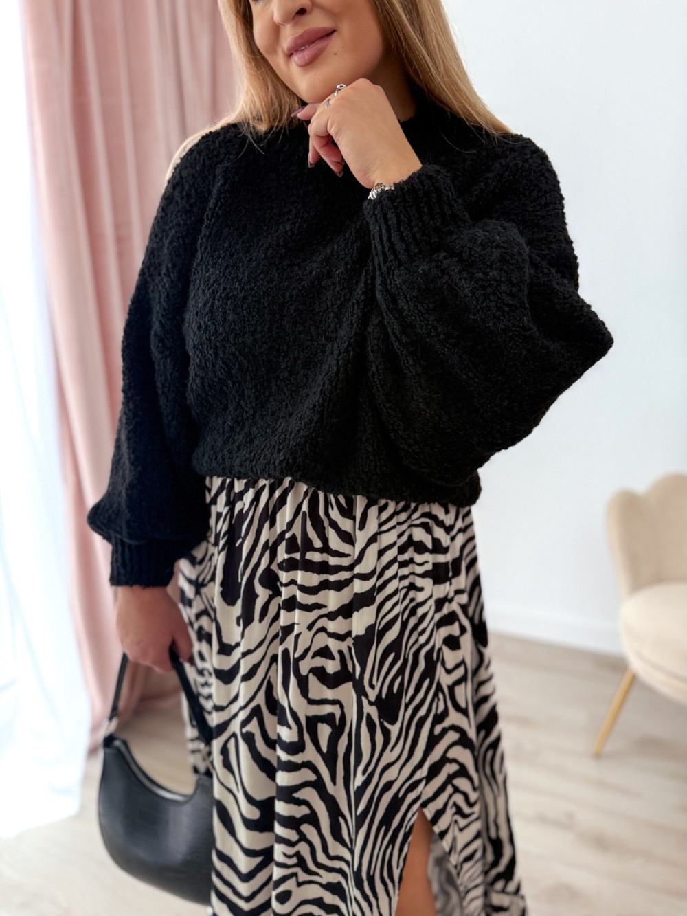 • miękka, mięsista dzianina typu bukla – ciepła i przyjemna w dotyku
