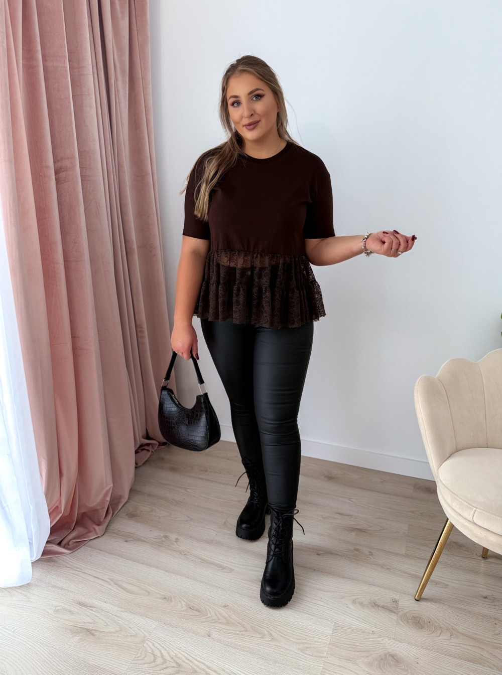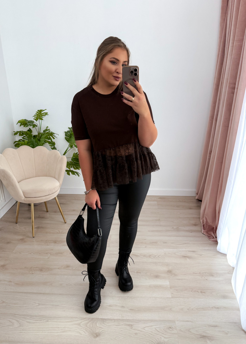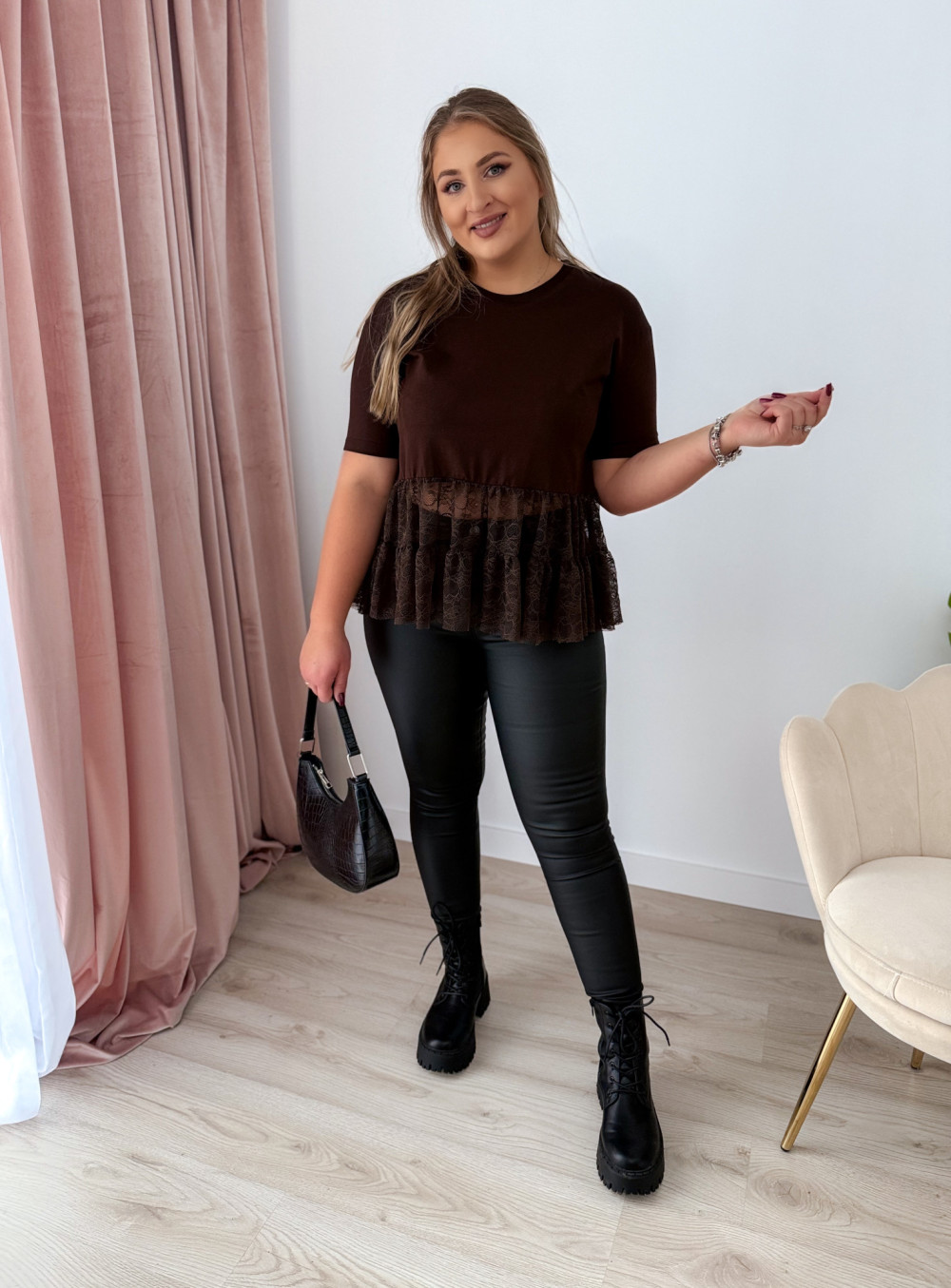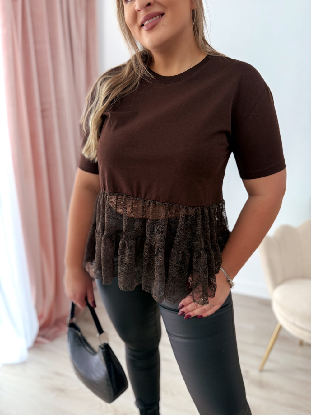 Bluzka na krótki rękaw z koronką Basanti - czekolada
