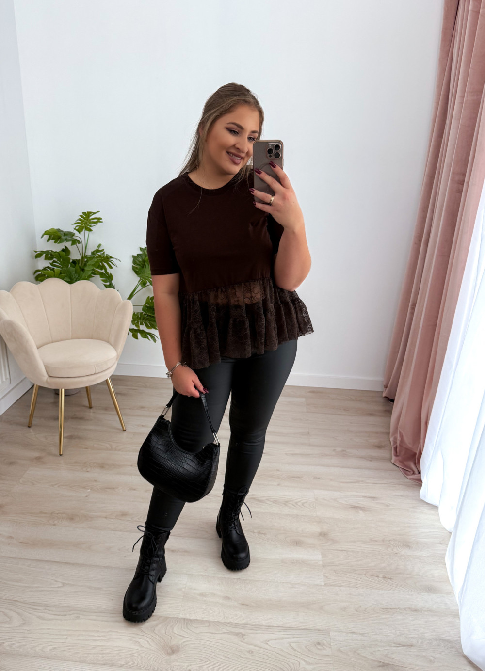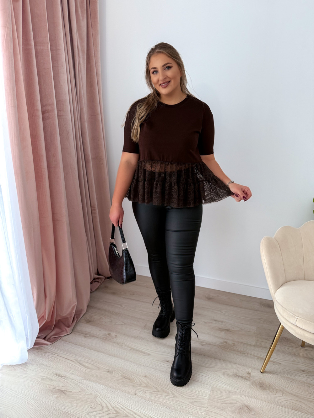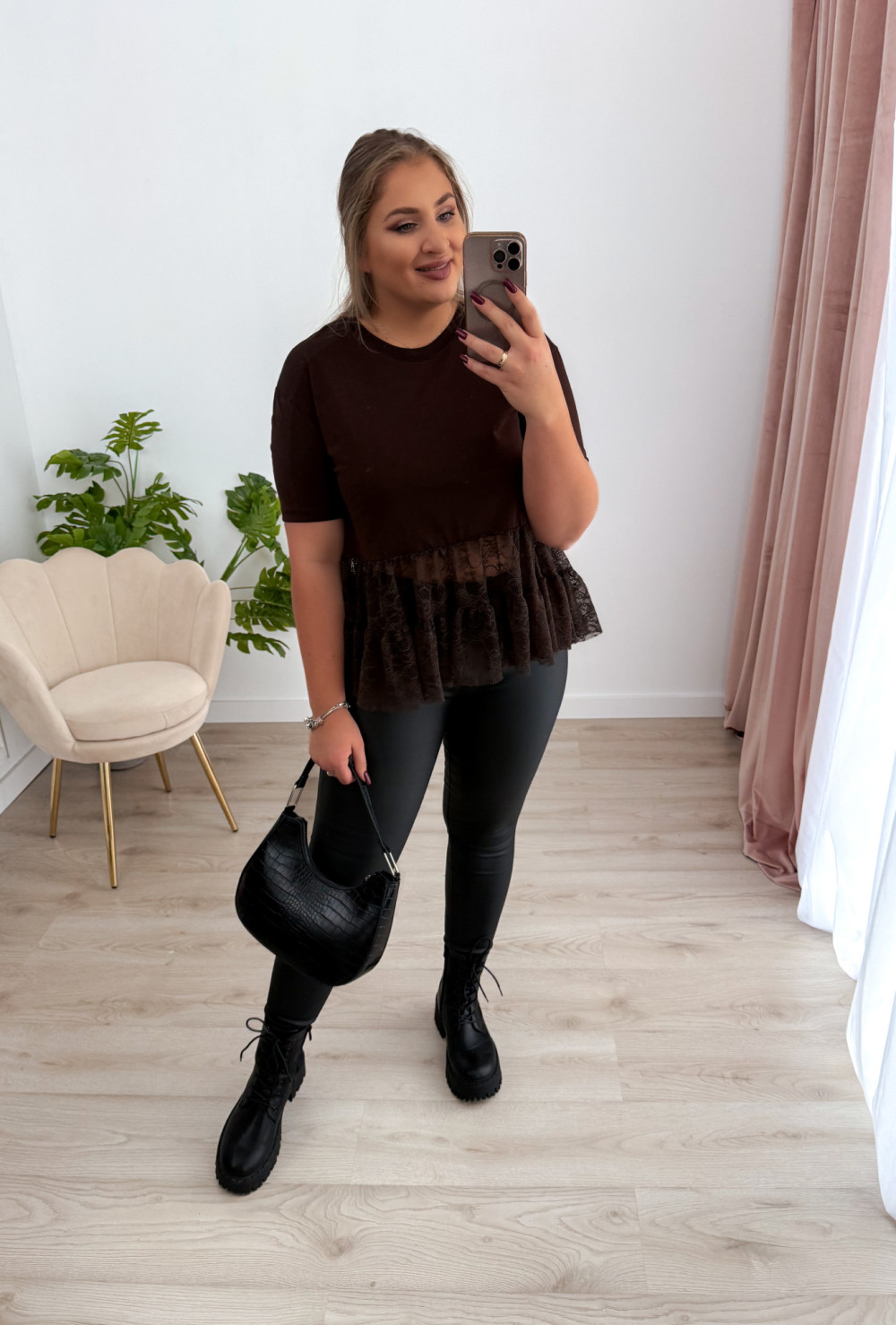 Bluzka na krótki rękaw z koronką Basanti - czekolada