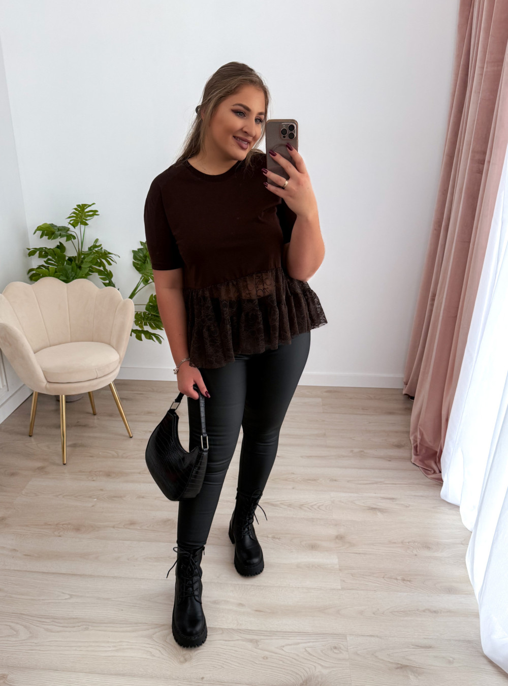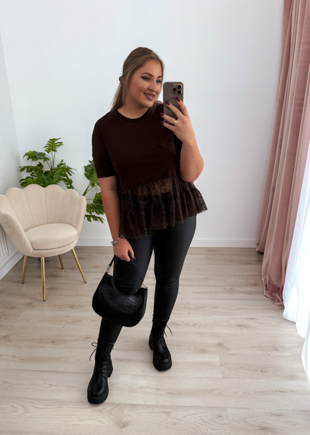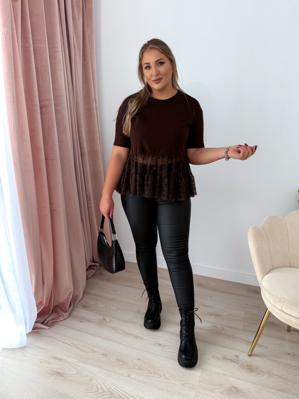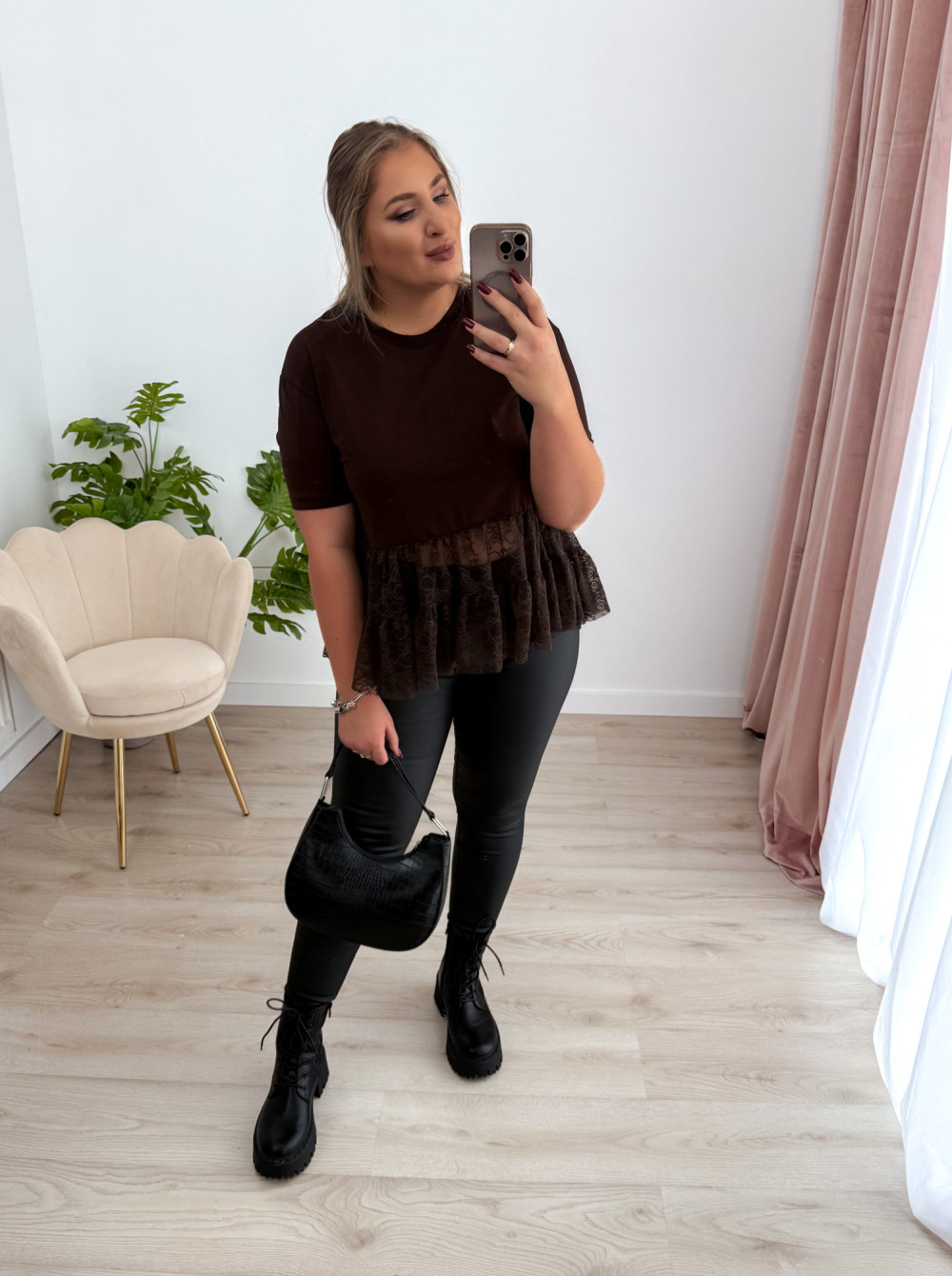 Bluzka na krótki rękaw z koronką Basanti - czekolada