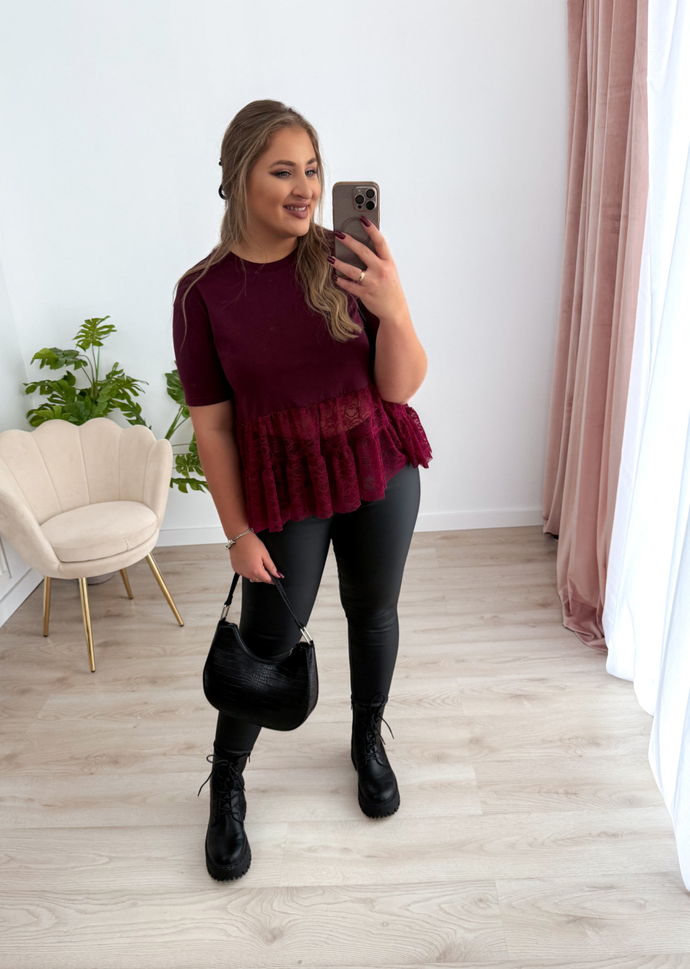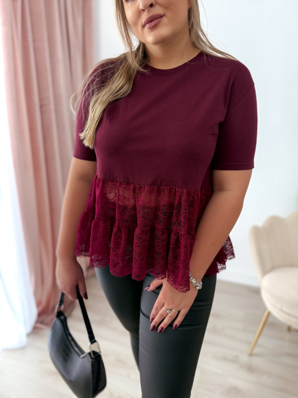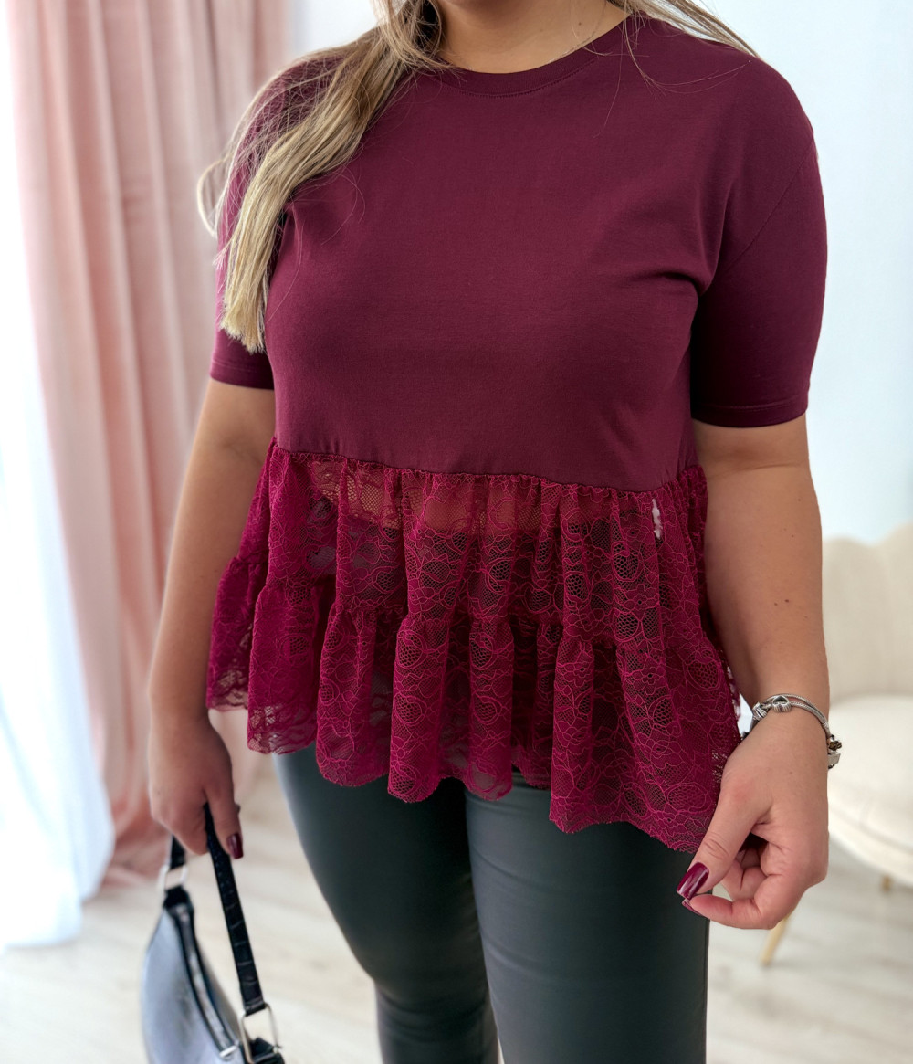 Bluzka na krótki rękaw z koronką Basanti - bordo