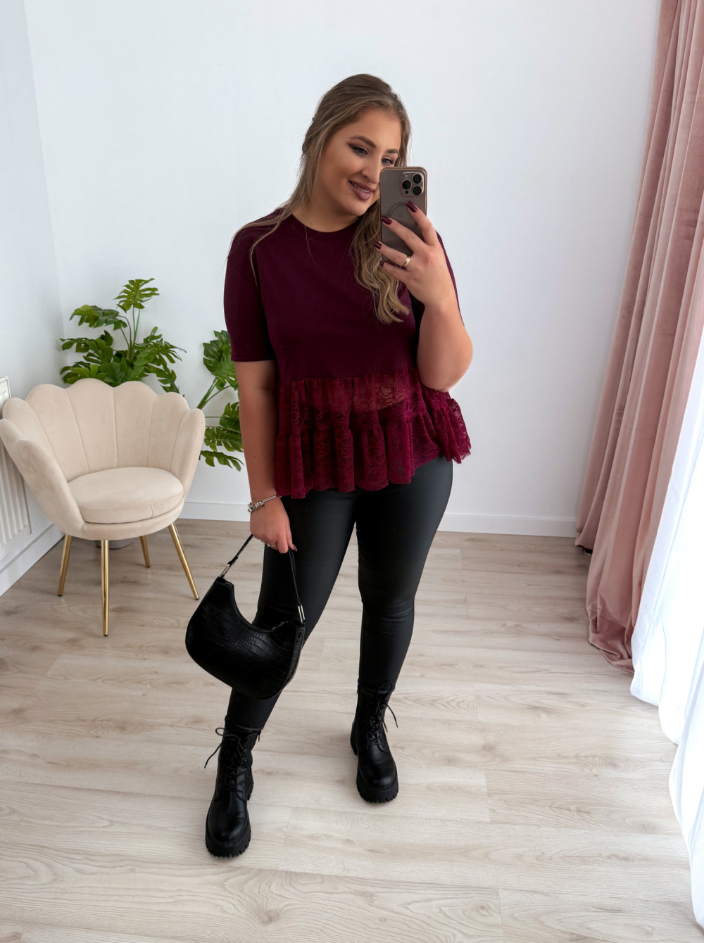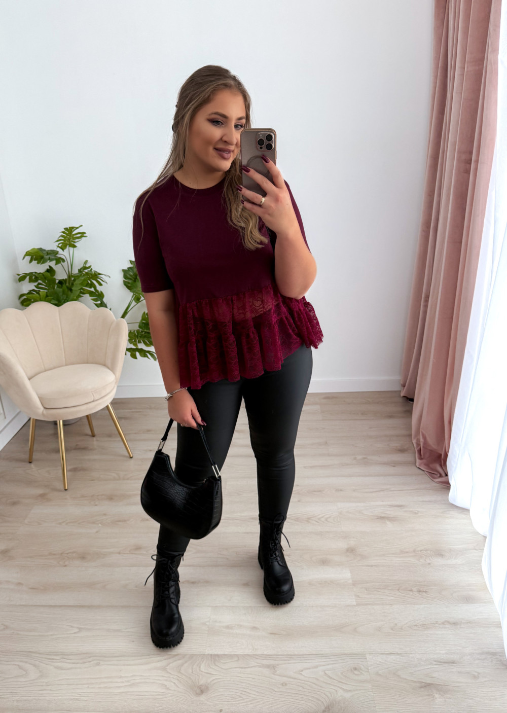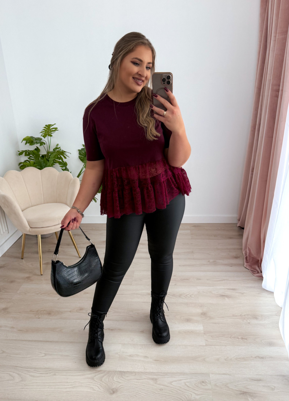 Bluzka na krótki rękaw z koronką Basanti - bordo