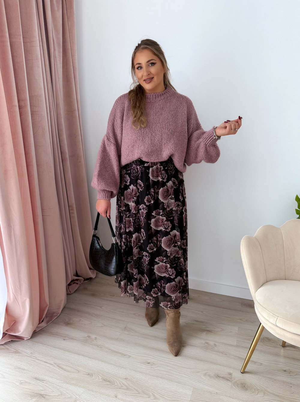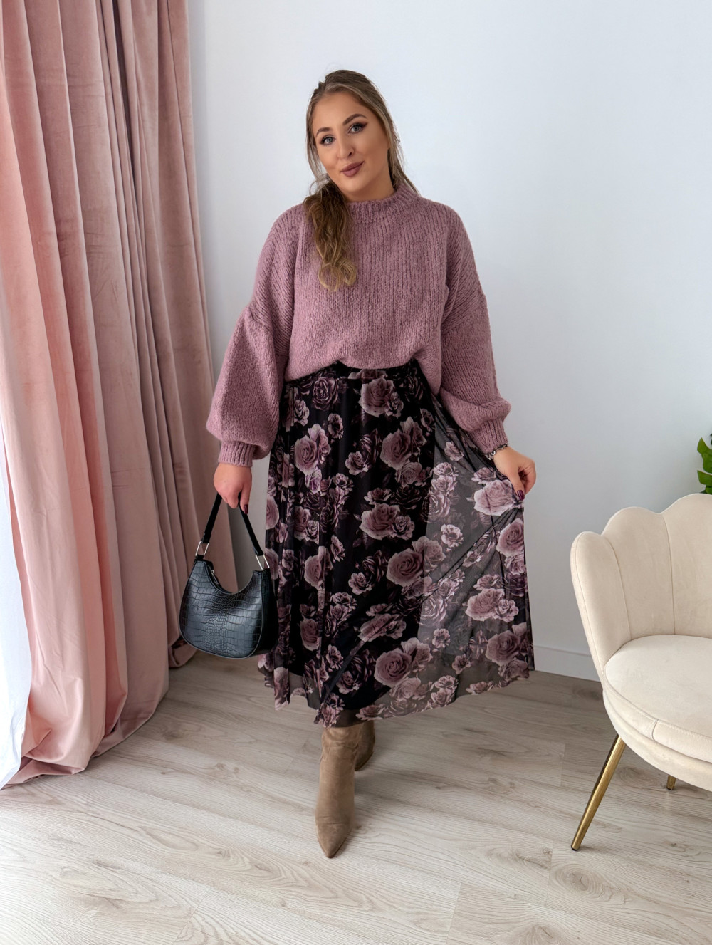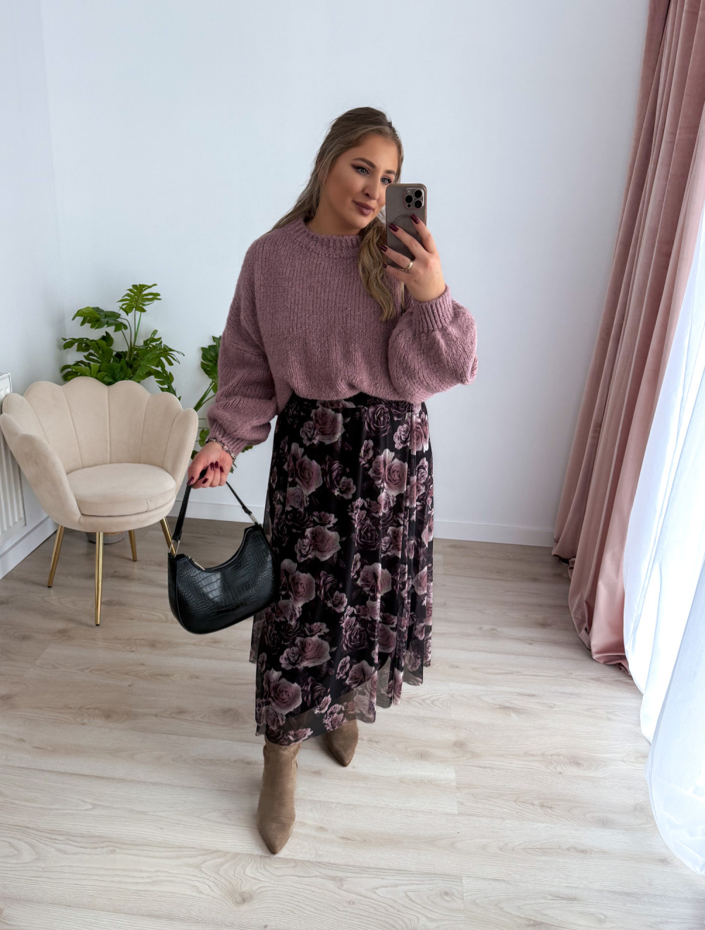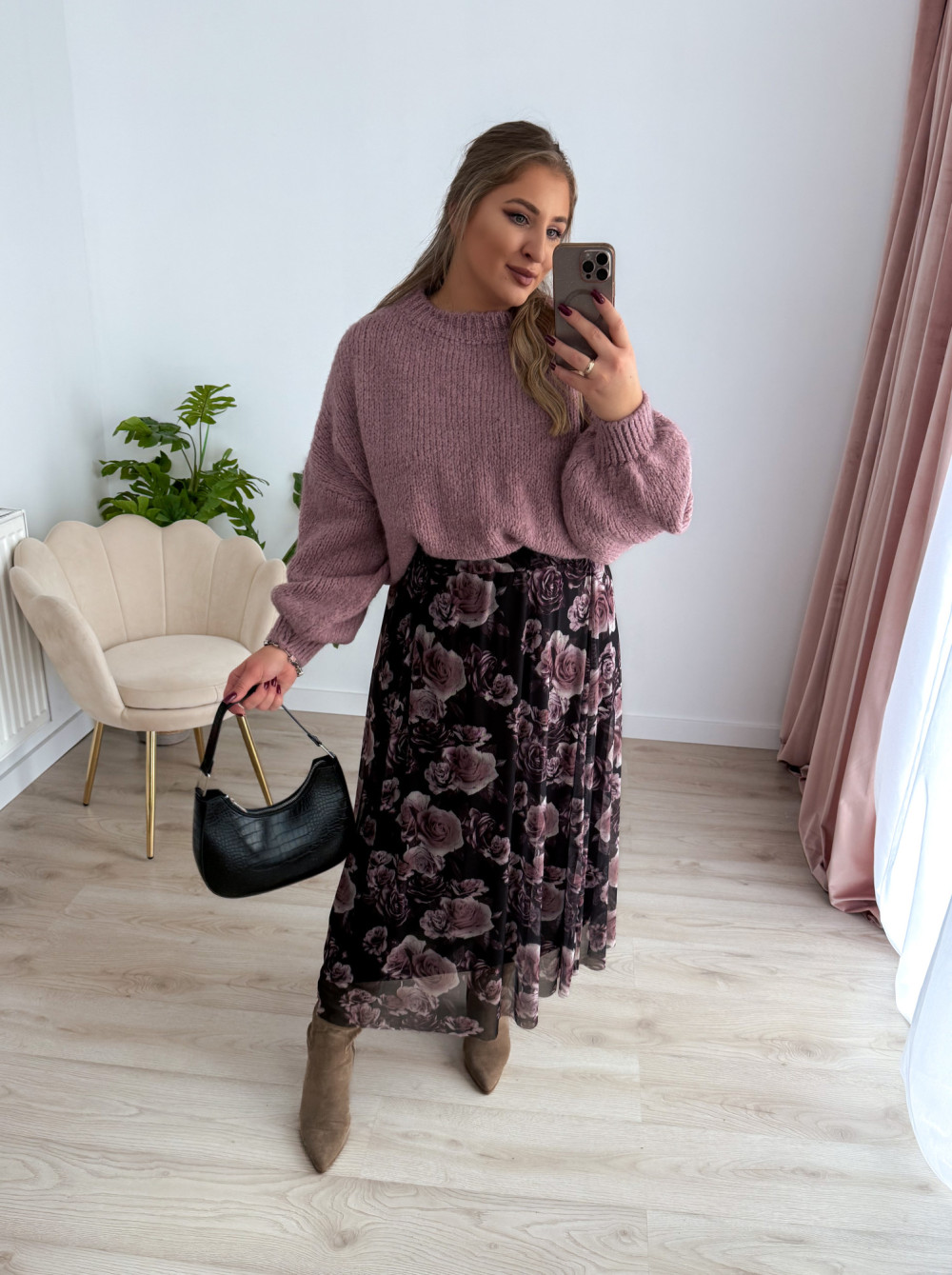 Spódnica maxi siateczkowa czarna w fioletowe róże Mariella