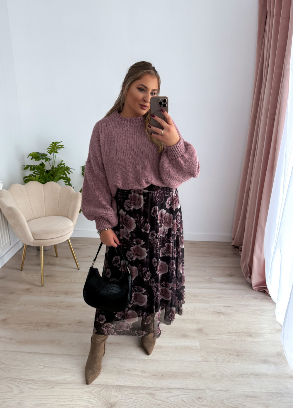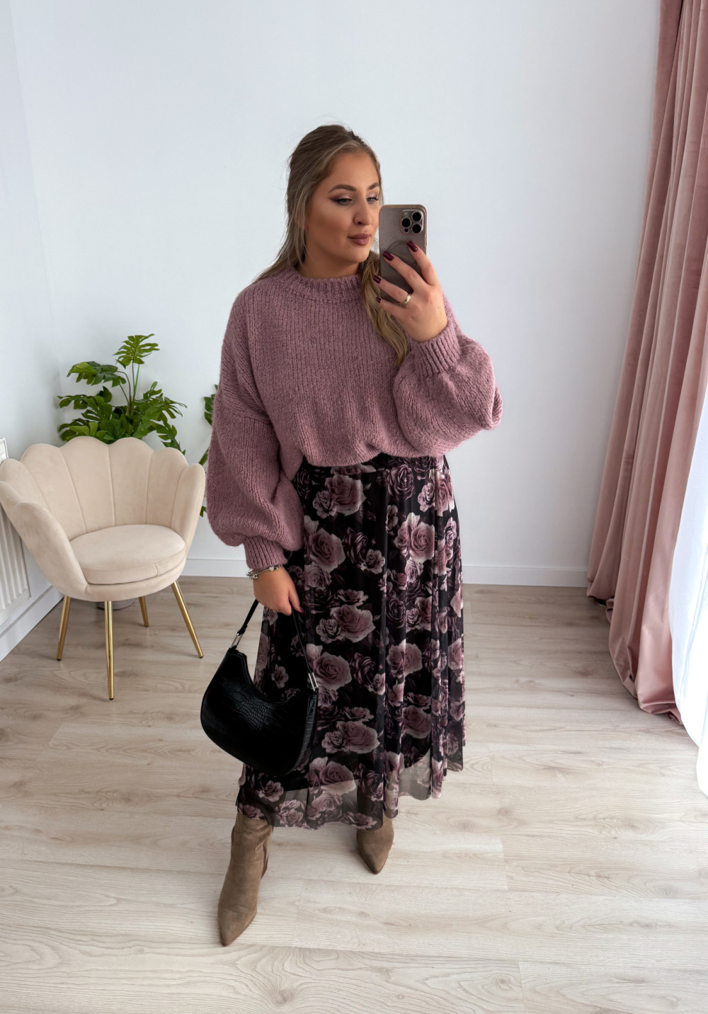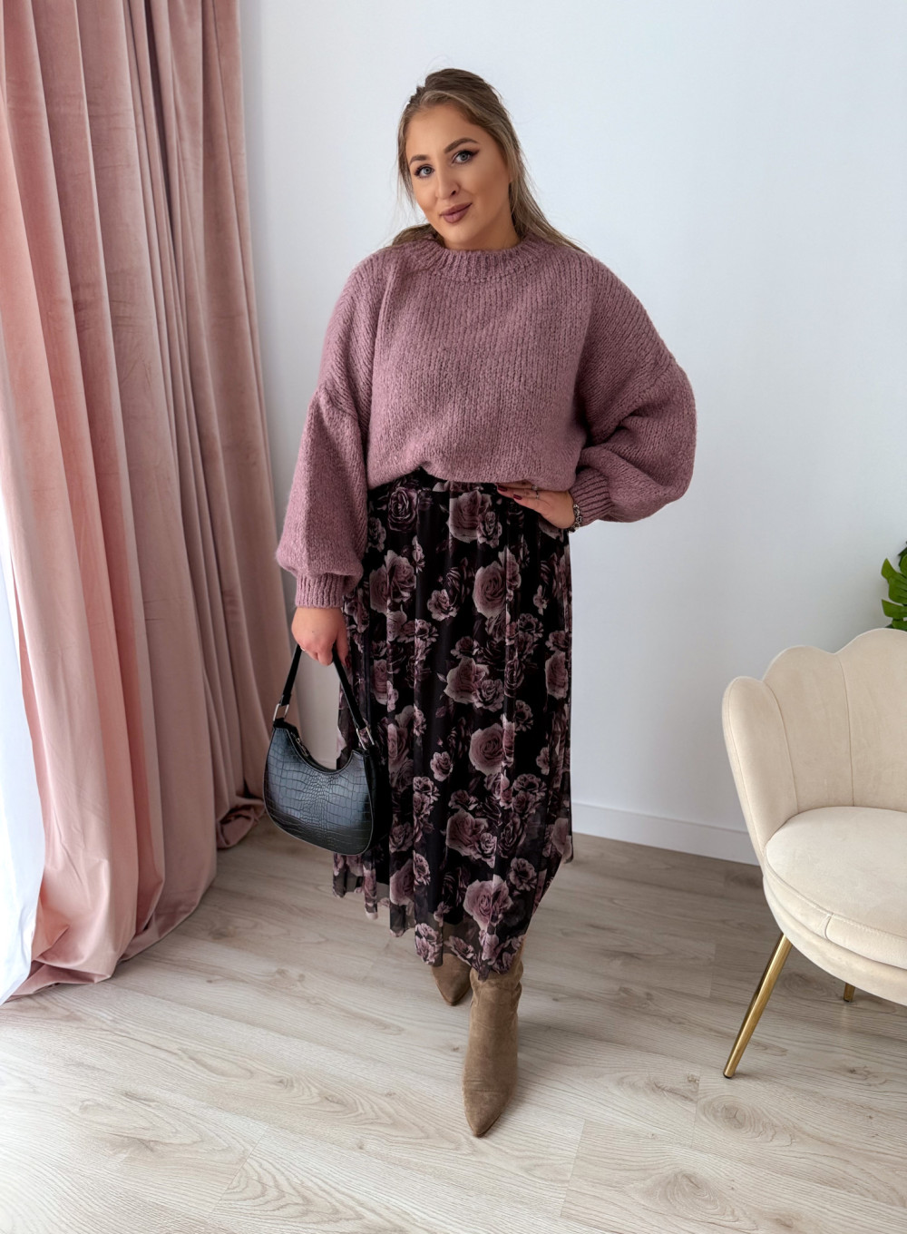 Spódnica maxi siateczkowa czarna w fioletowe róże Mariella