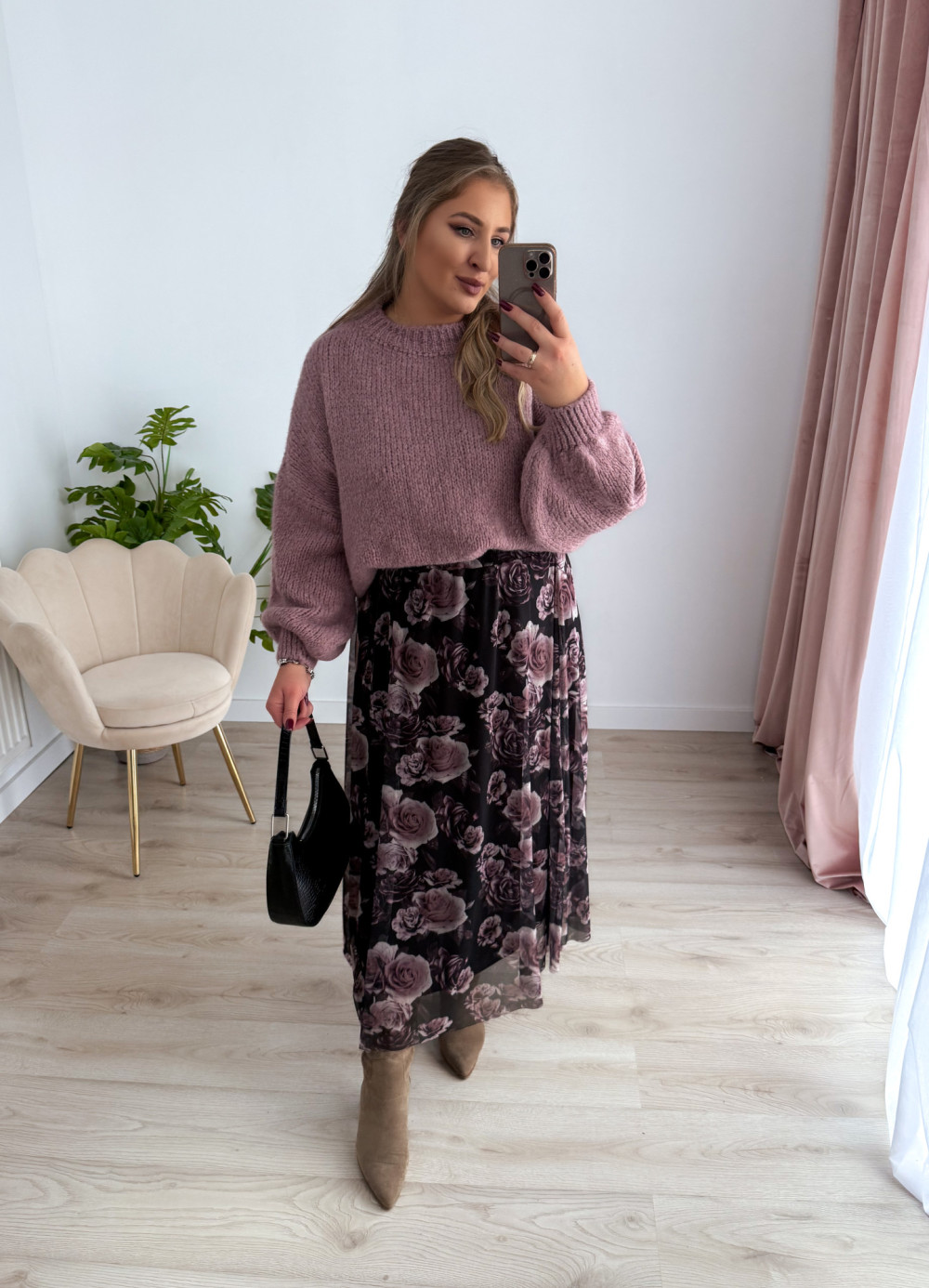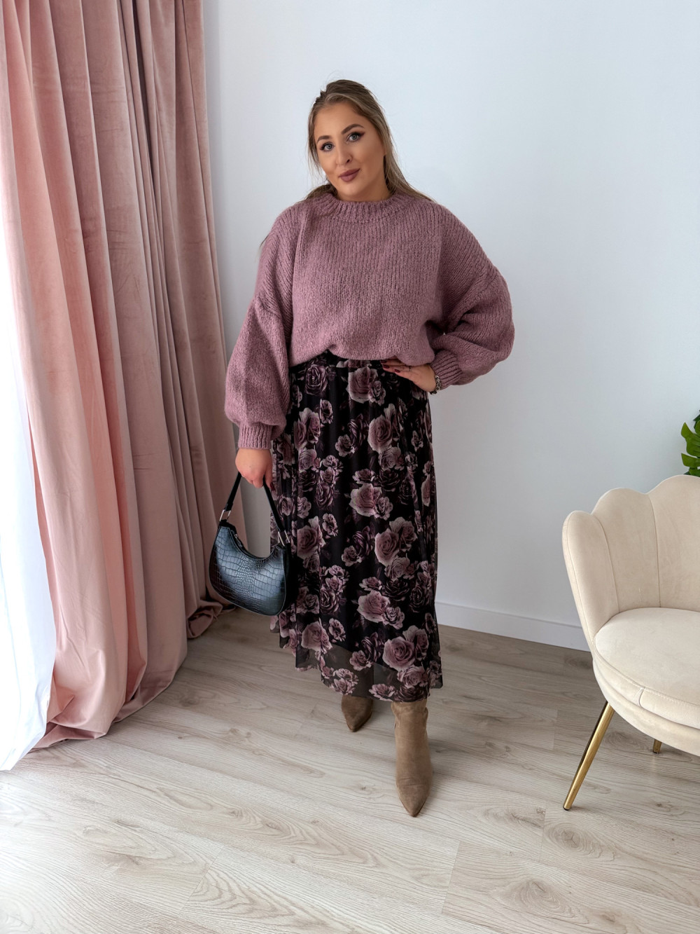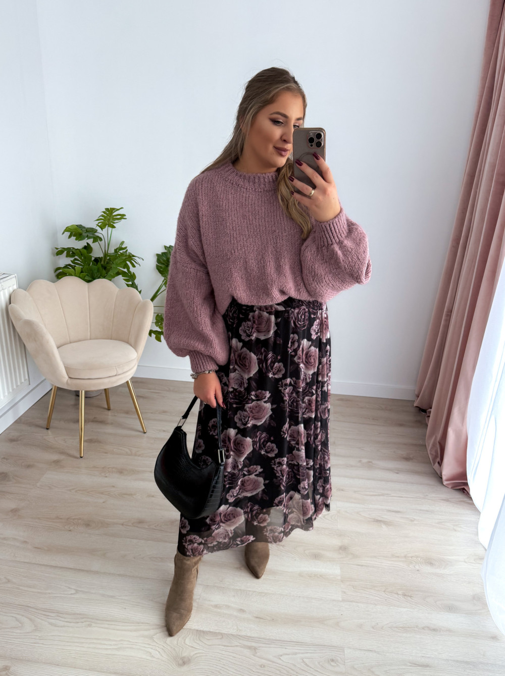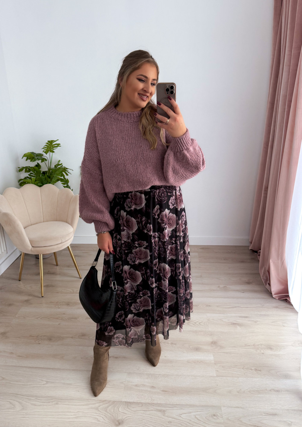 Spódnica maxi siateczkowa czarna w fioletowe róże Mariella
