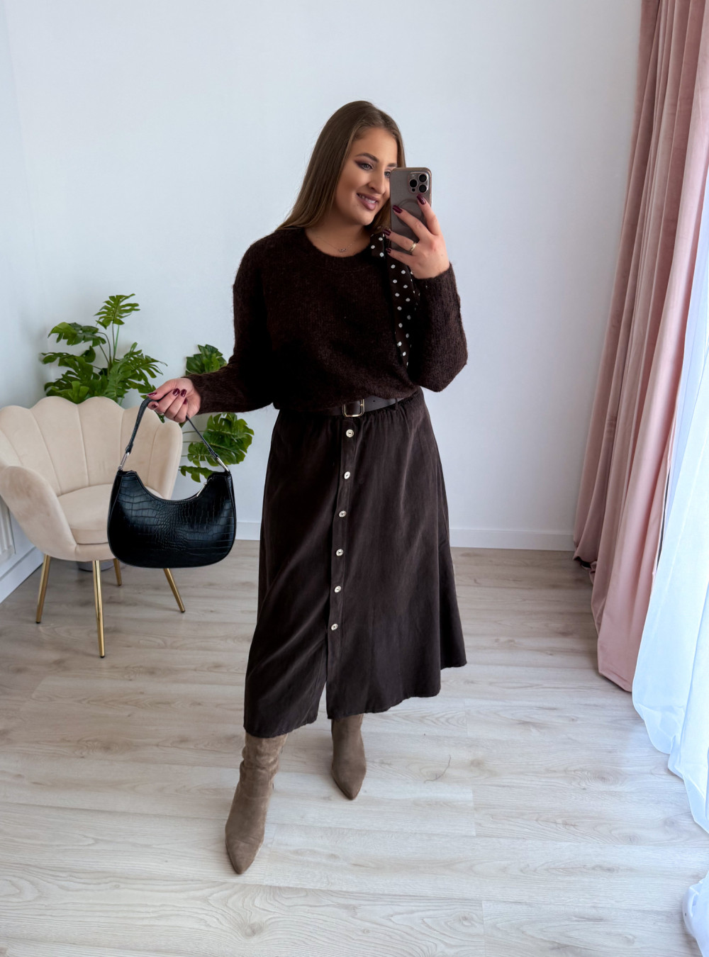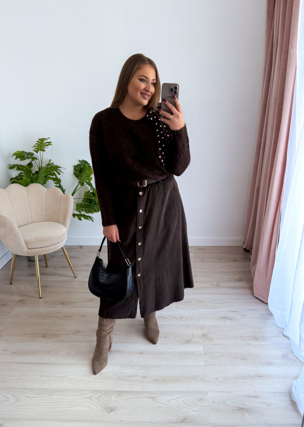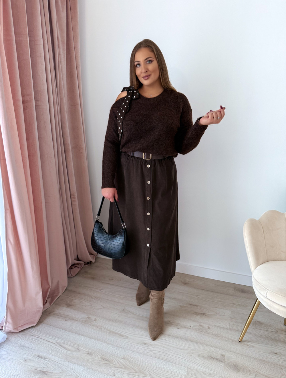 Stylowa i wygodna spódnica midi wykonana z miękkiego, przyjemnego w dotyku sztruksu to must-have w garderobie każdej kobiety. Klasyczna długość i lekko rozkloszowany fason pięknie podkreślają sylwetkę, a elastyczna gumka w pasie zapewnia komfort noszenia przez cały dzień. Dodatkowy pasek w talii pozwala dopasować spódnicę do figury i nadaje jej eleganckiego charakteru. Idealna do pracy, na spotkania czy casualowe stylizacje z botkami lub sneakersami.