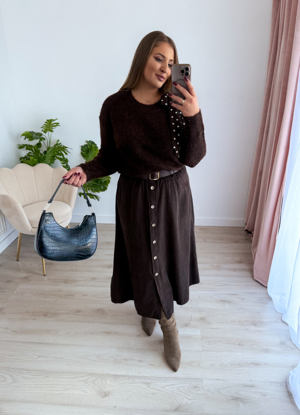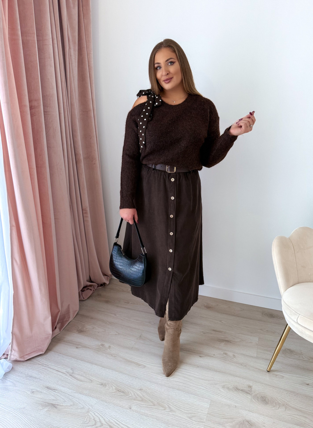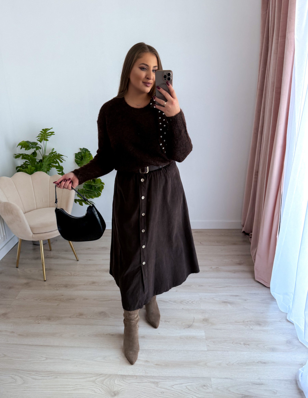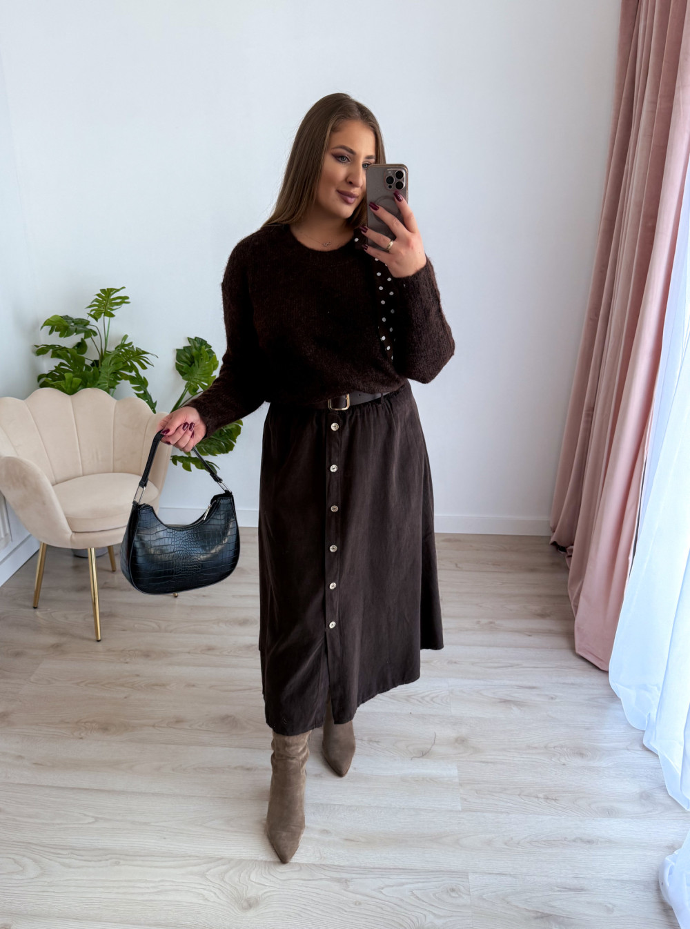 Stylowa i wygodna spódnica midi wykonana z miękkiego, przyjemnego w dotyku sztruksu to must-have w garderobie każdej kobiety. Klasyczna długość i lekko rozkloszowany fason pięknie podkreślają sylwetkę, a elastyczna gumka w pasie zapewnia komfort noszenia przez cały dzień. Dodatkowy pasek w talii pozwala dopasować spódnicę do figury i nadaje jej eleganckiego charakteru. Idealna do pracy, na spotkania czy casualowe stylizacje z botkami lub sneakersami.