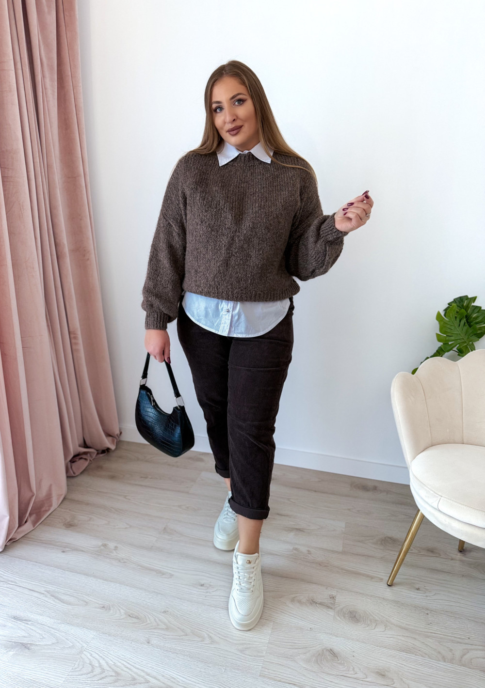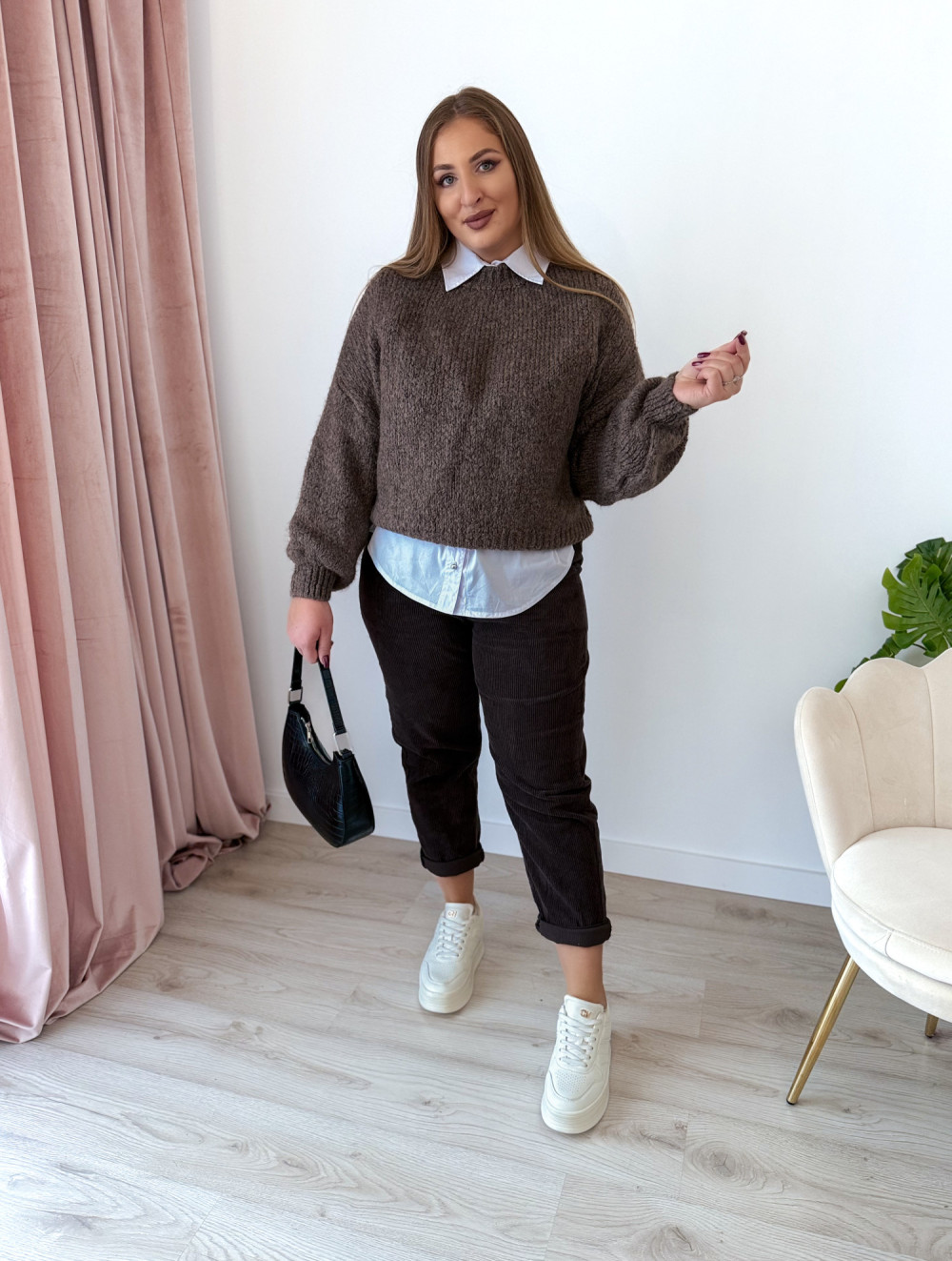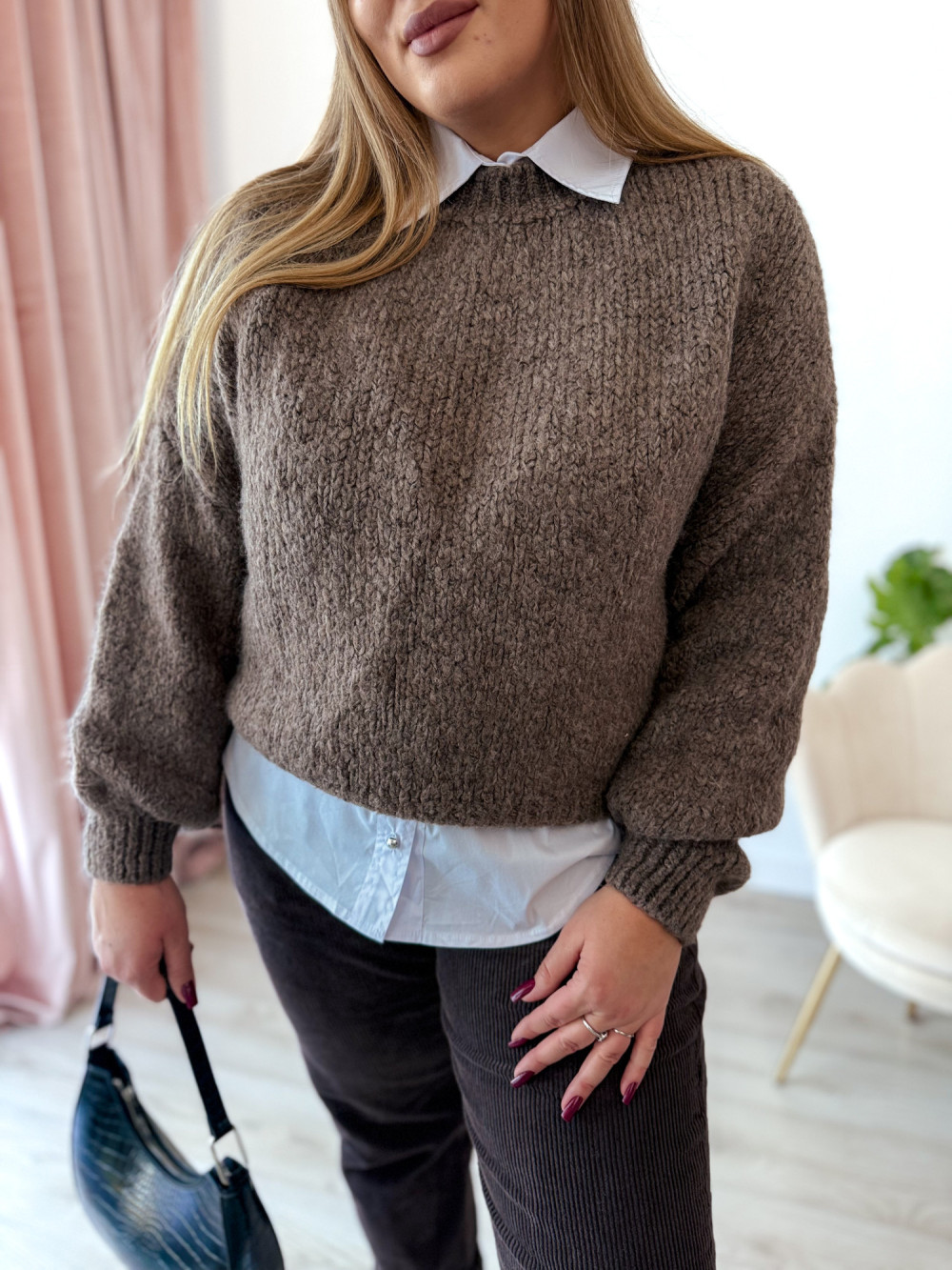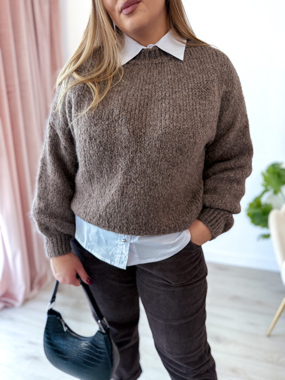 Cudowny sweter oversize, który łączy wygodę z modnym wyglądem. Idealny na chłodniejsze dni i do codziennych stylizacji.