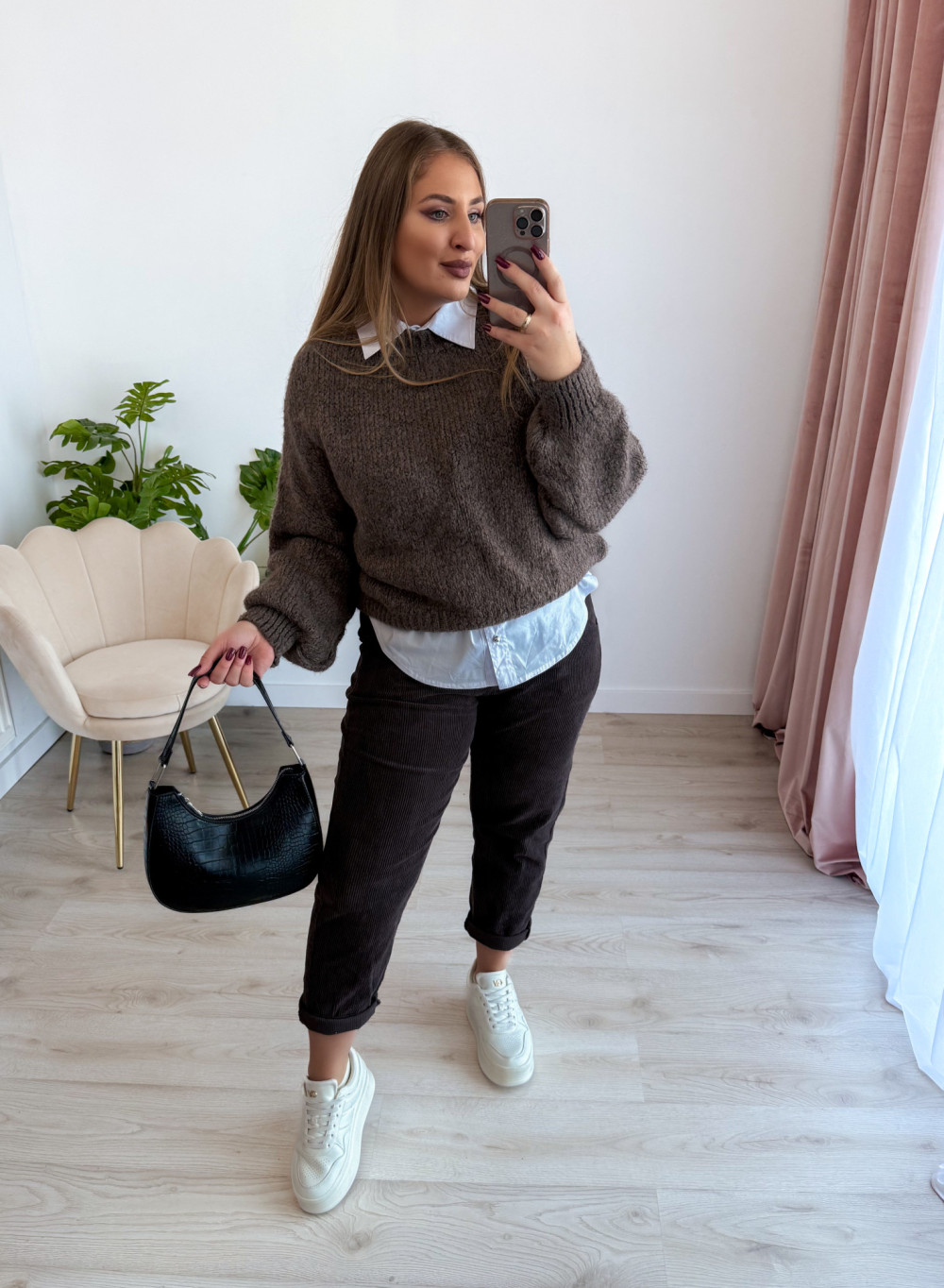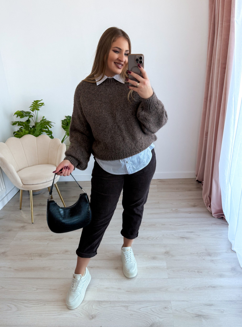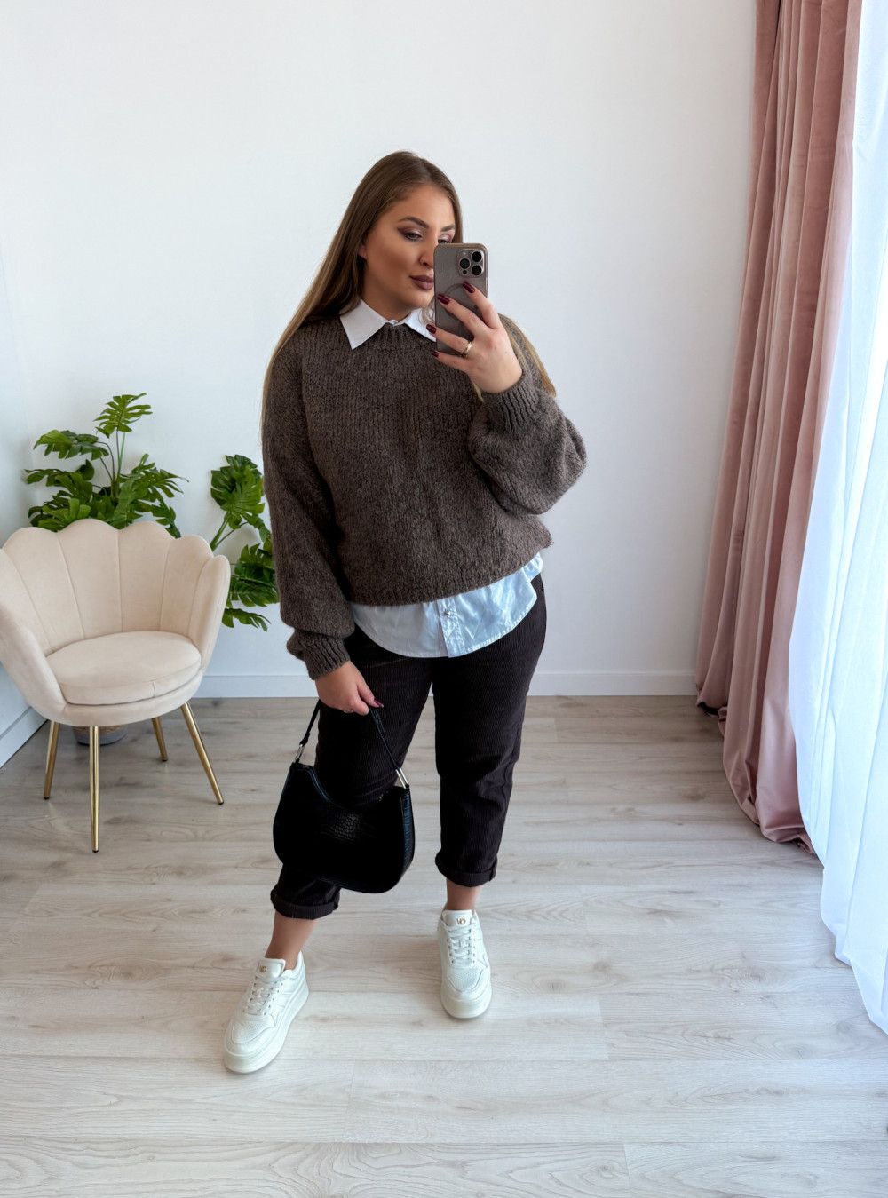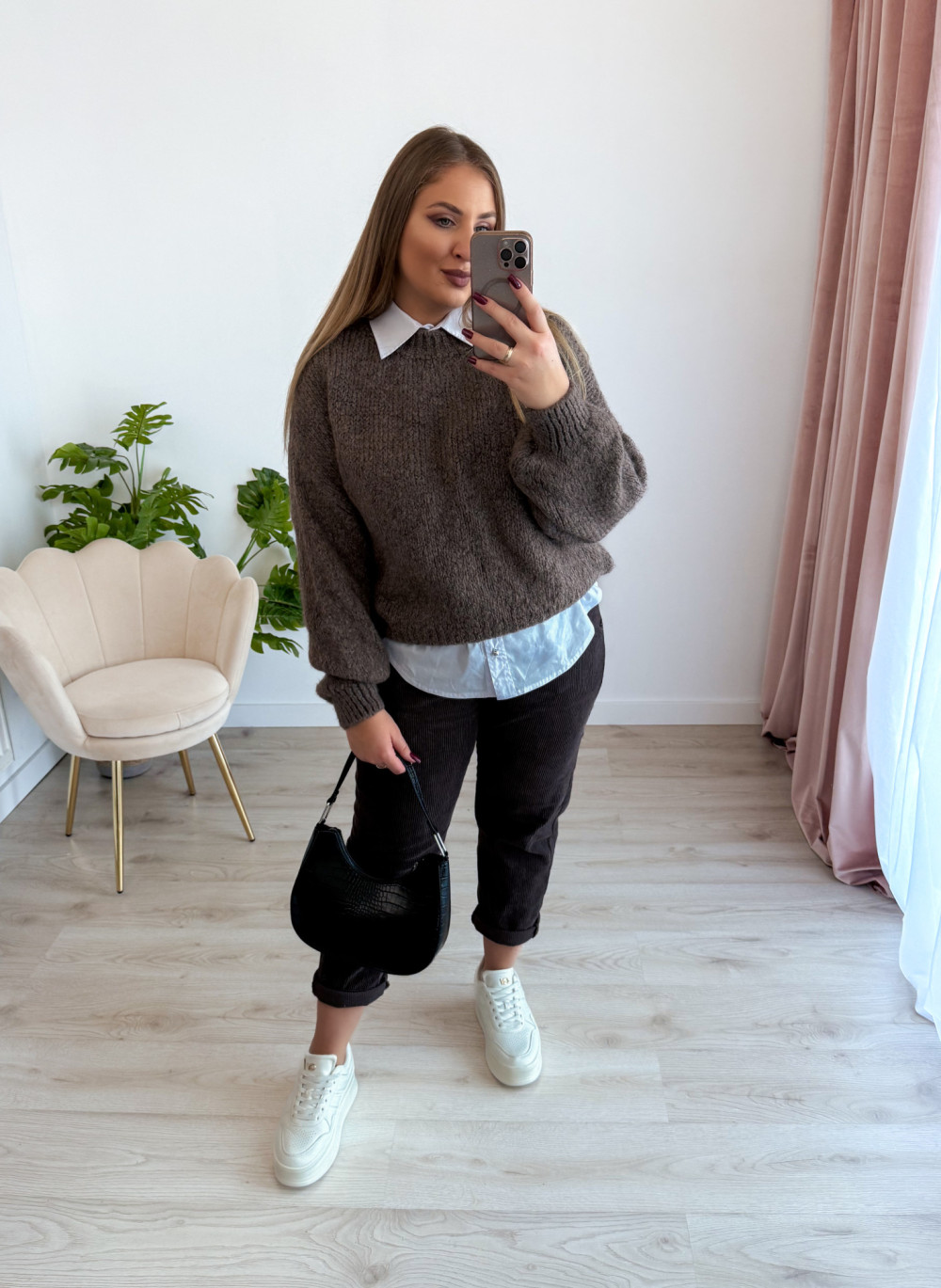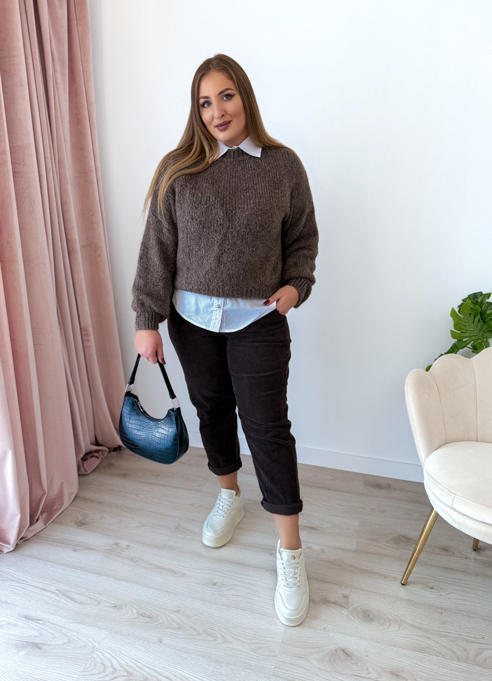 Cudowny sweter oversize, który łączy wygodę z modnym wyglądem. Idealny na chłodniejsze dni i do codziennych stylizacji.