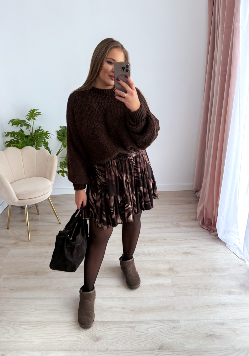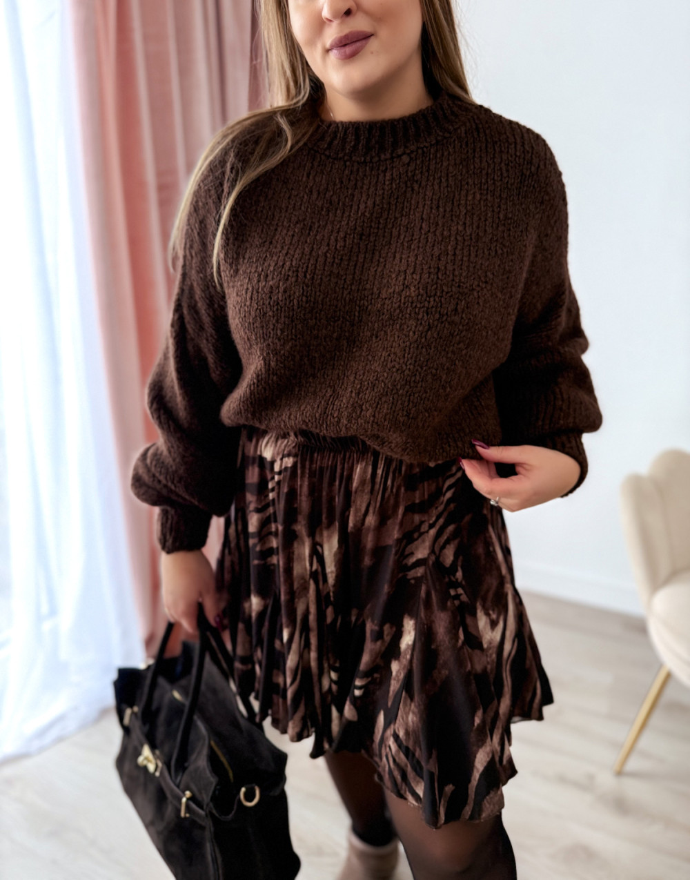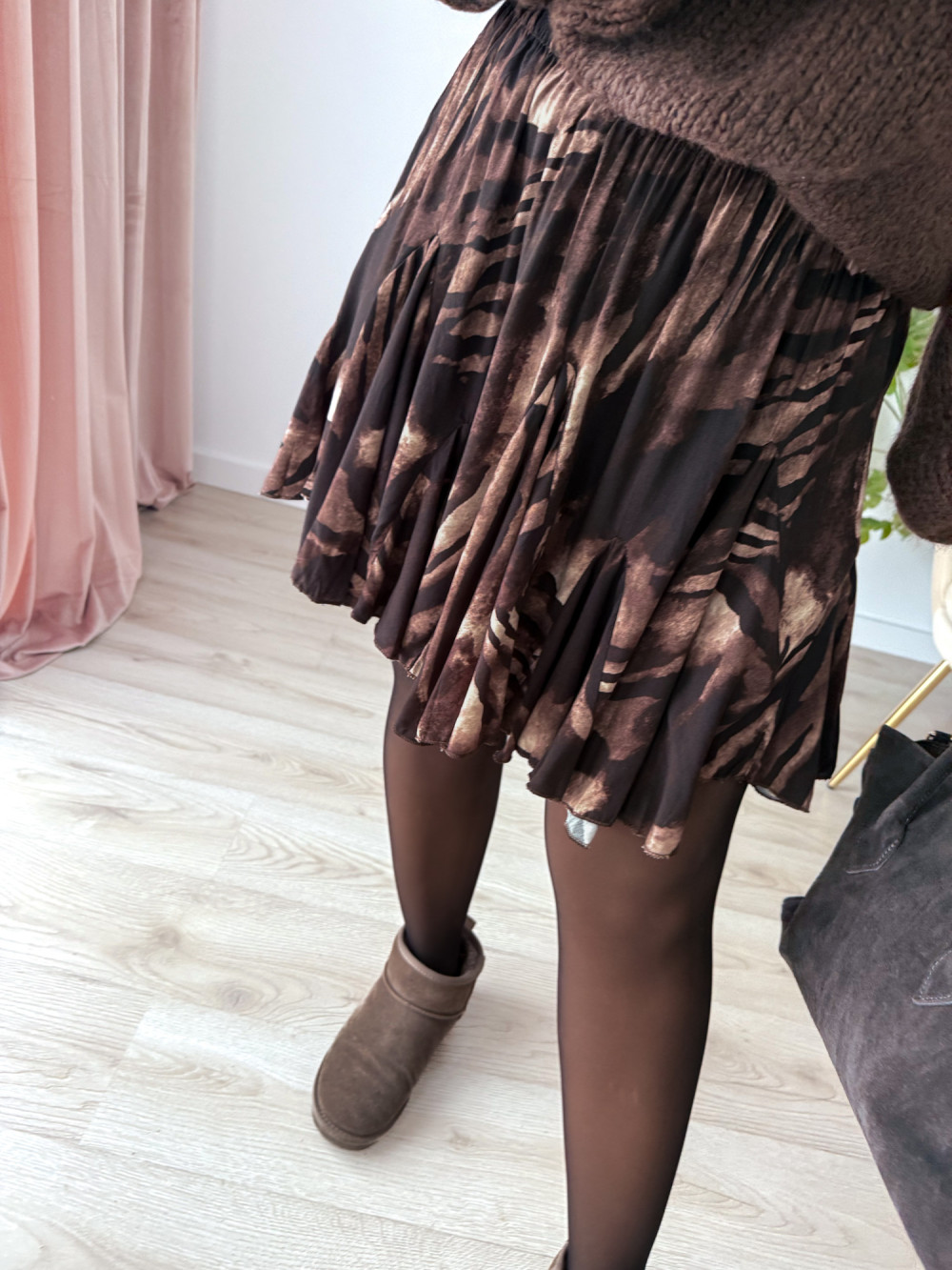 Spódniczka czekoladowo-beżowy wzór krótka rozkloszowana Kelli