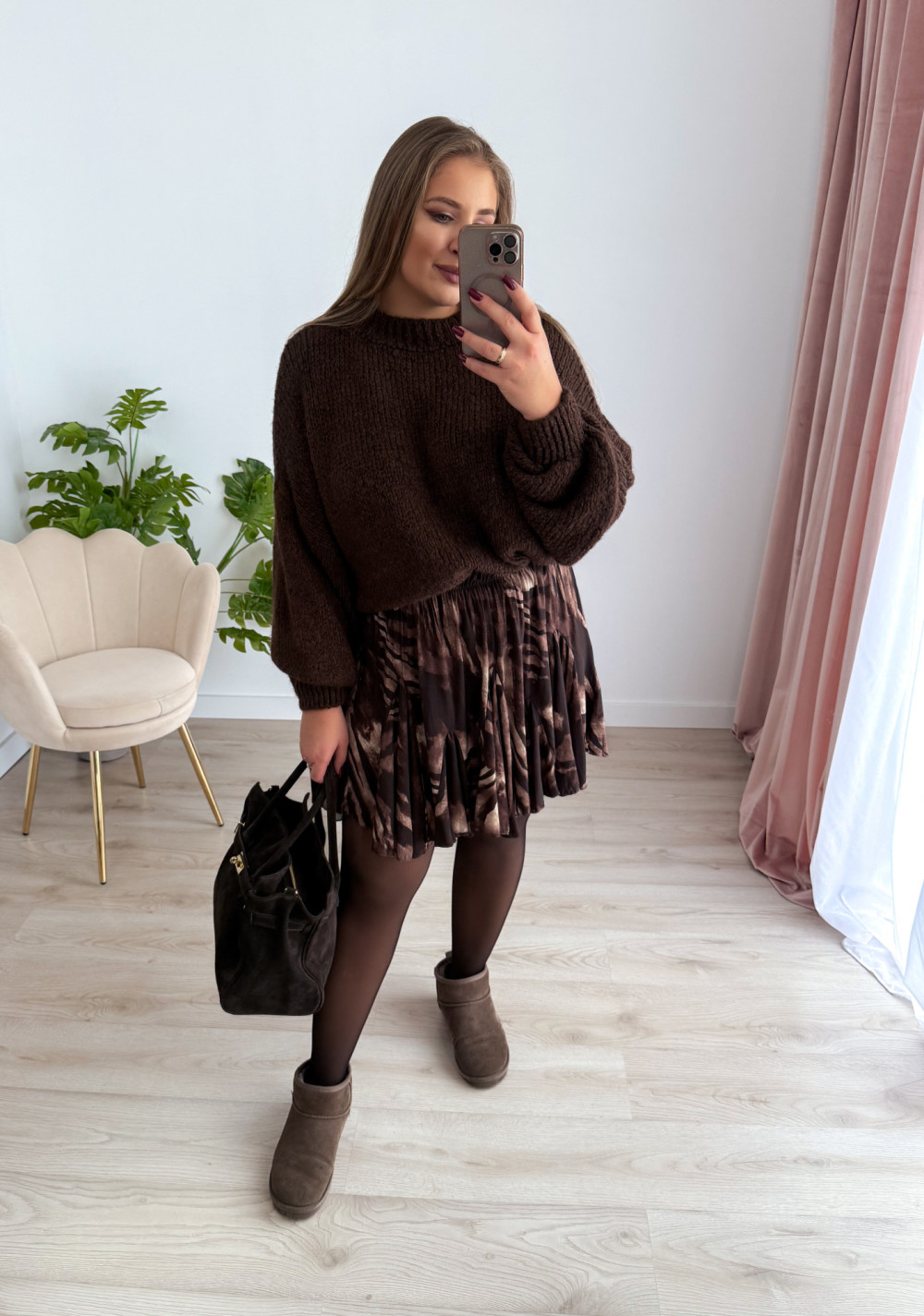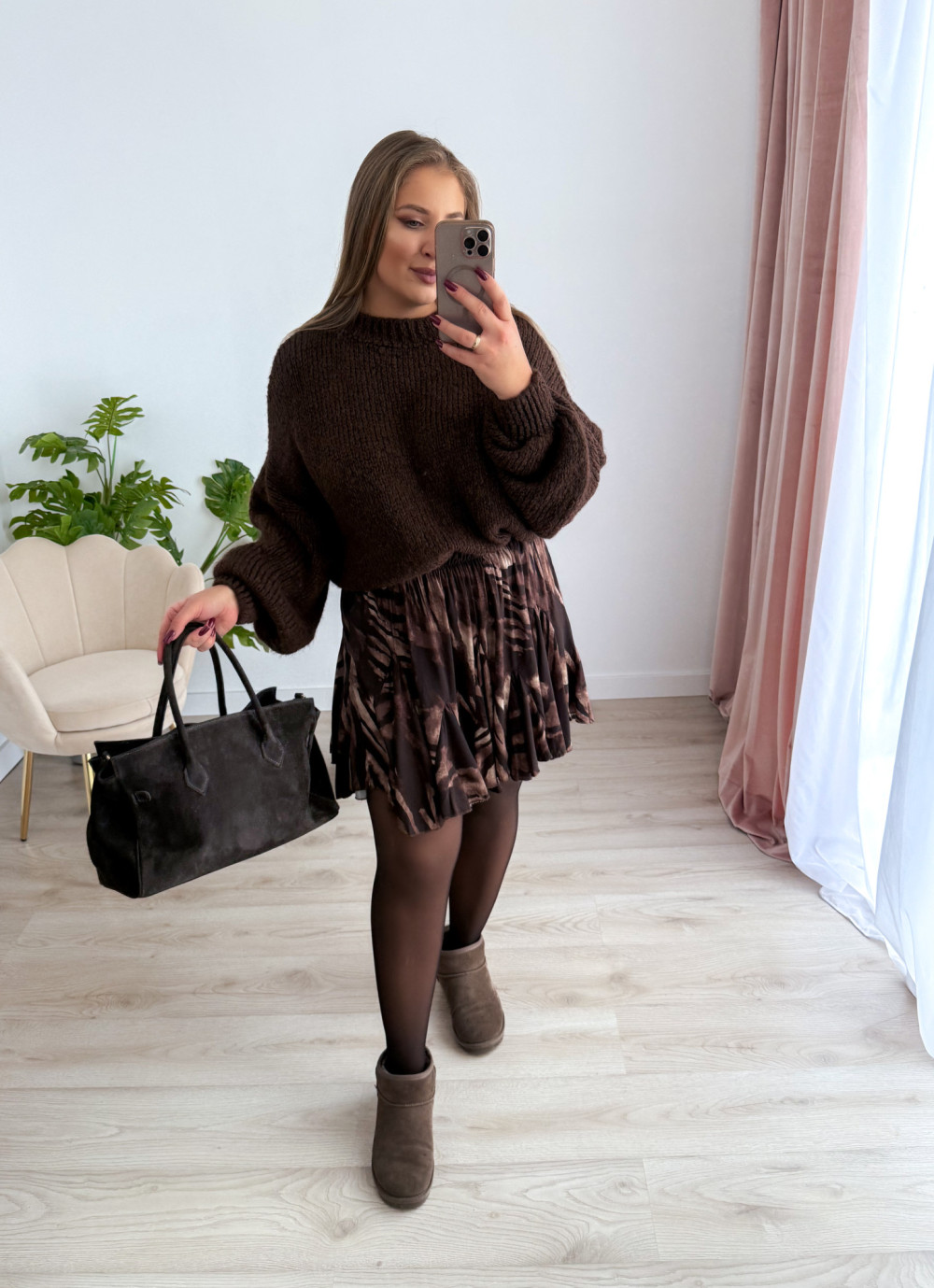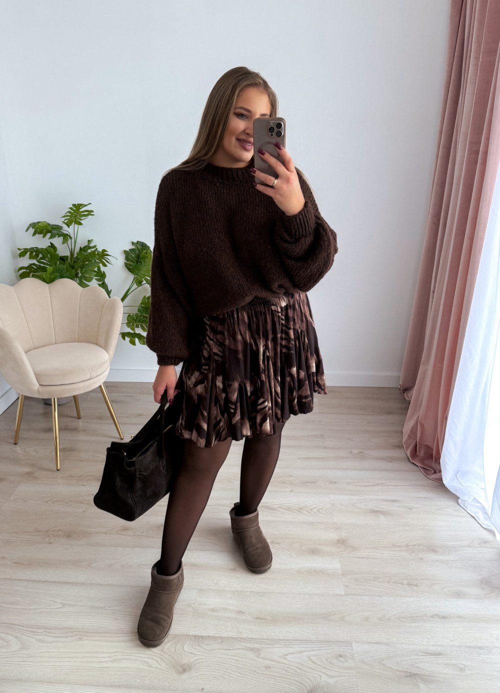 Spódniczka czekoladowo-beżowy wzór krótka rozkloszowana Kelli