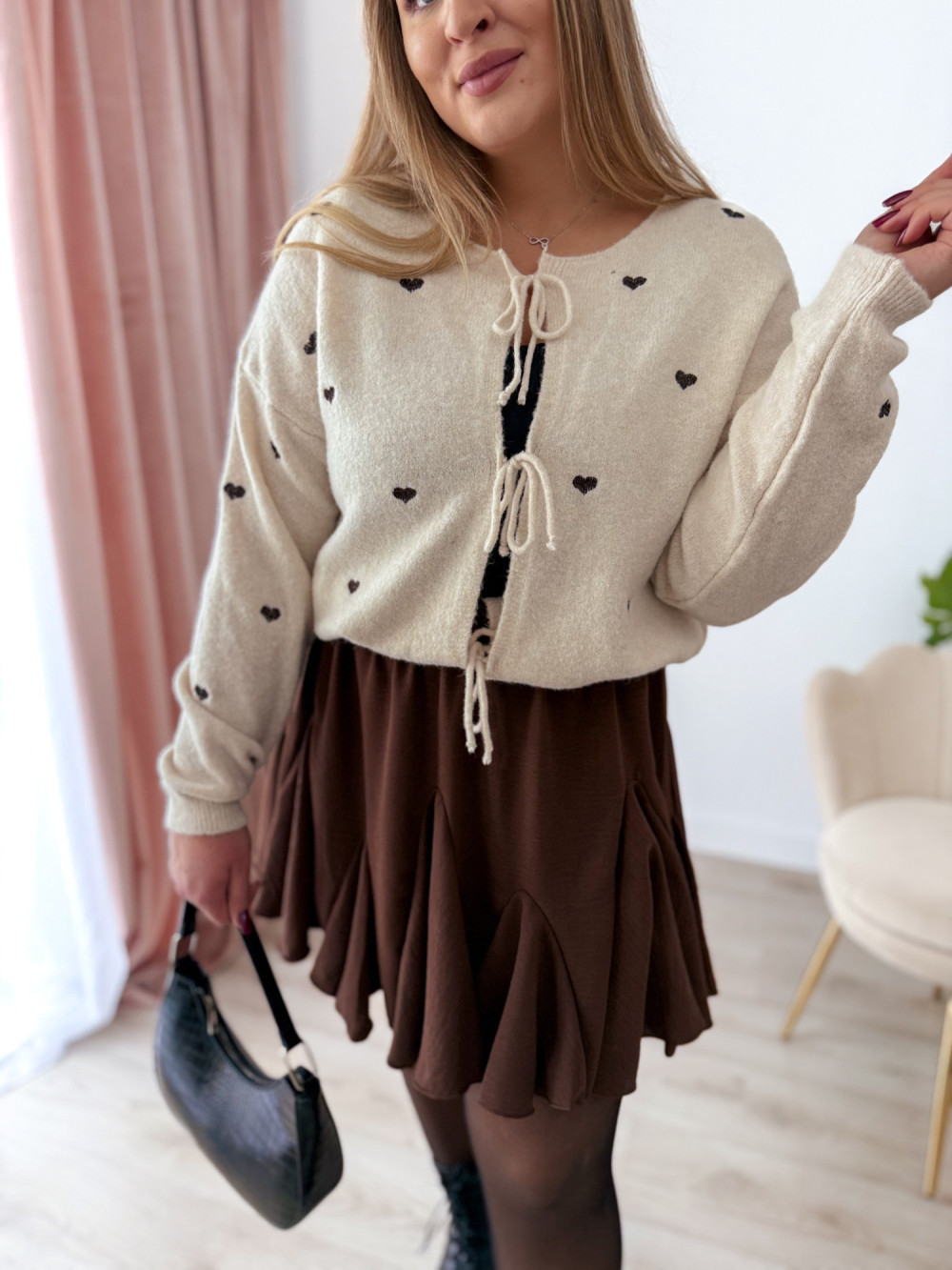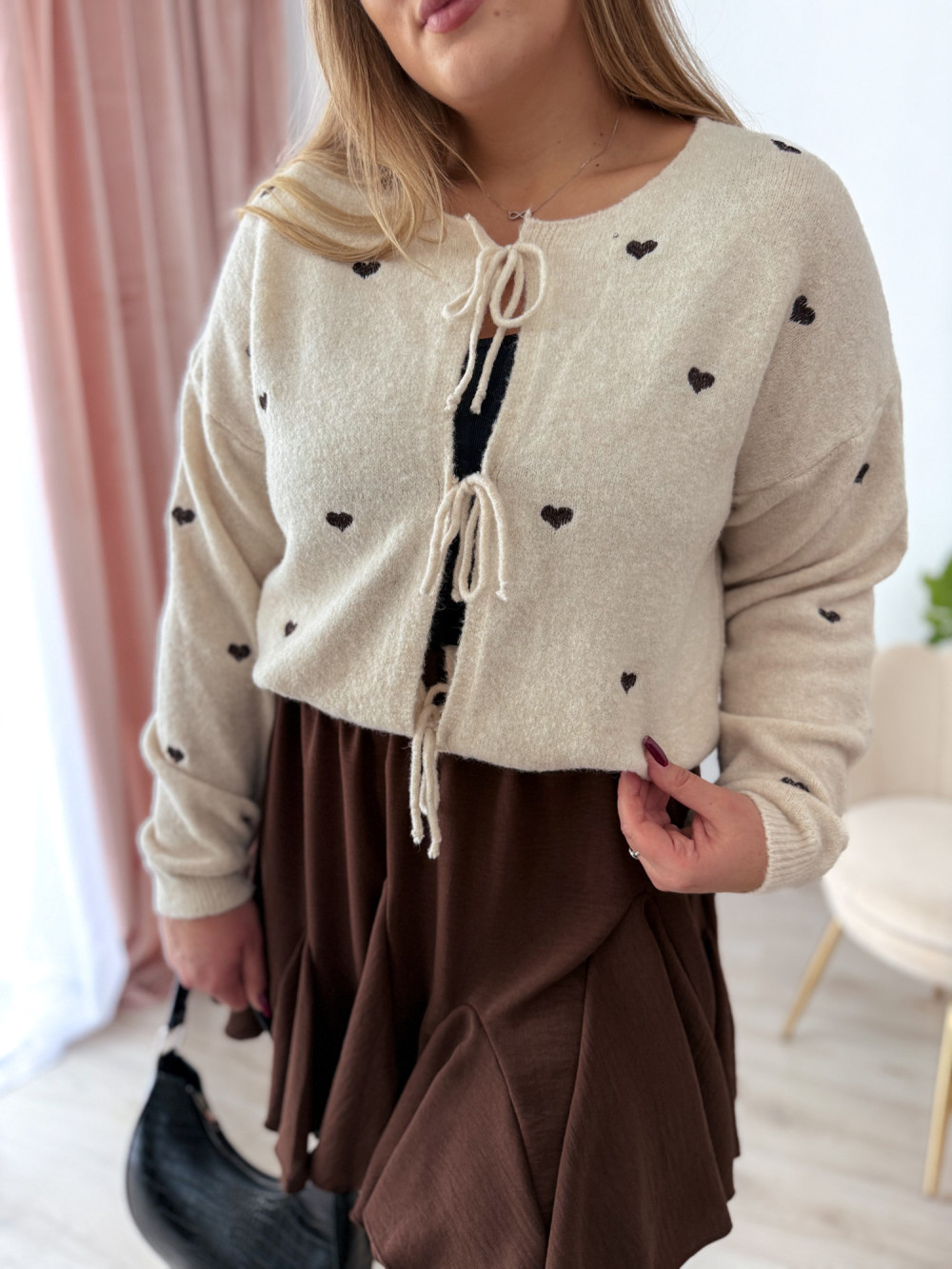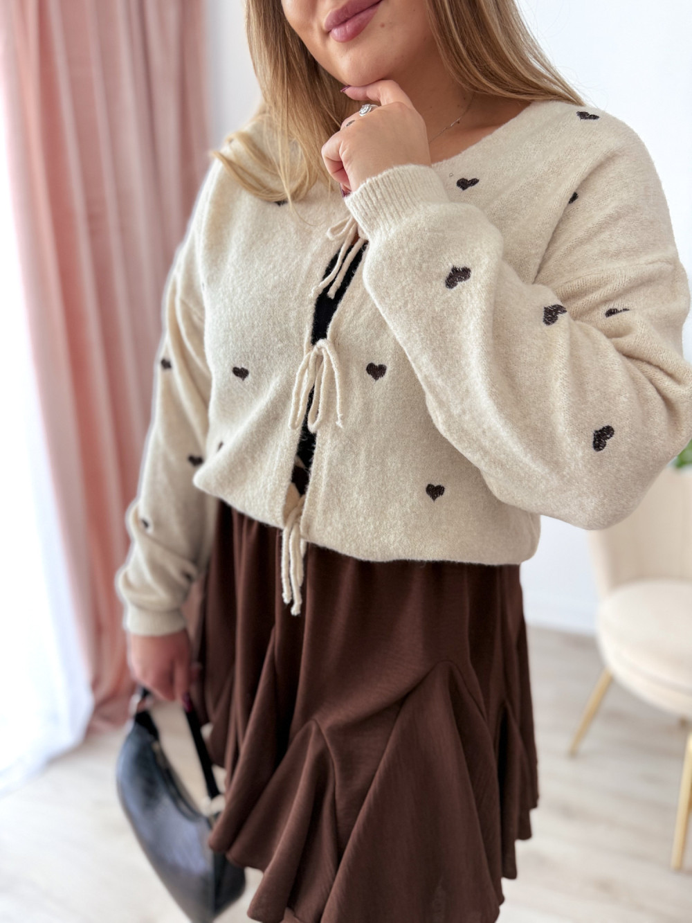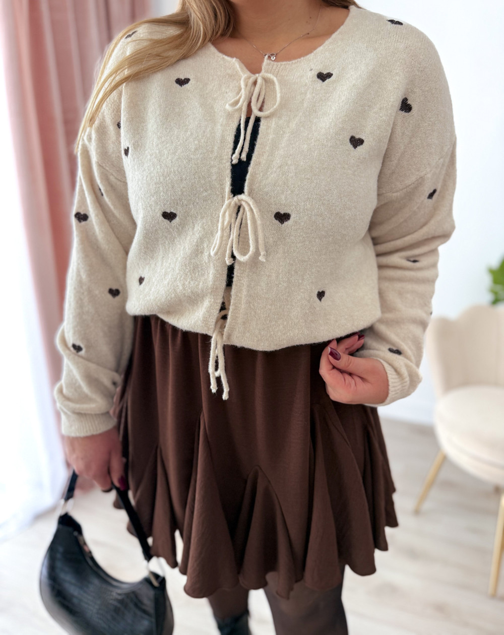 Uroczy sweterek zawiązywany z wyszywanymi serduszkami to idealny wybór dla kobiet, które cenią sobie subtelne detale i romantyczny styl. Miękki, przyjemny w dotyku materiał otula ciało, zapewniając ciepło i wygodę przez cały dzień. Model z wiązaniem pozwala dopasować sweterek do sylwetki, a delikatne wyszywane serduszka dodają mu dziewczęcego uroku. Doskonale sprawdzi się zarówno w codziennych stylizacjach, jak i w bardziej eleganckich zestawach.