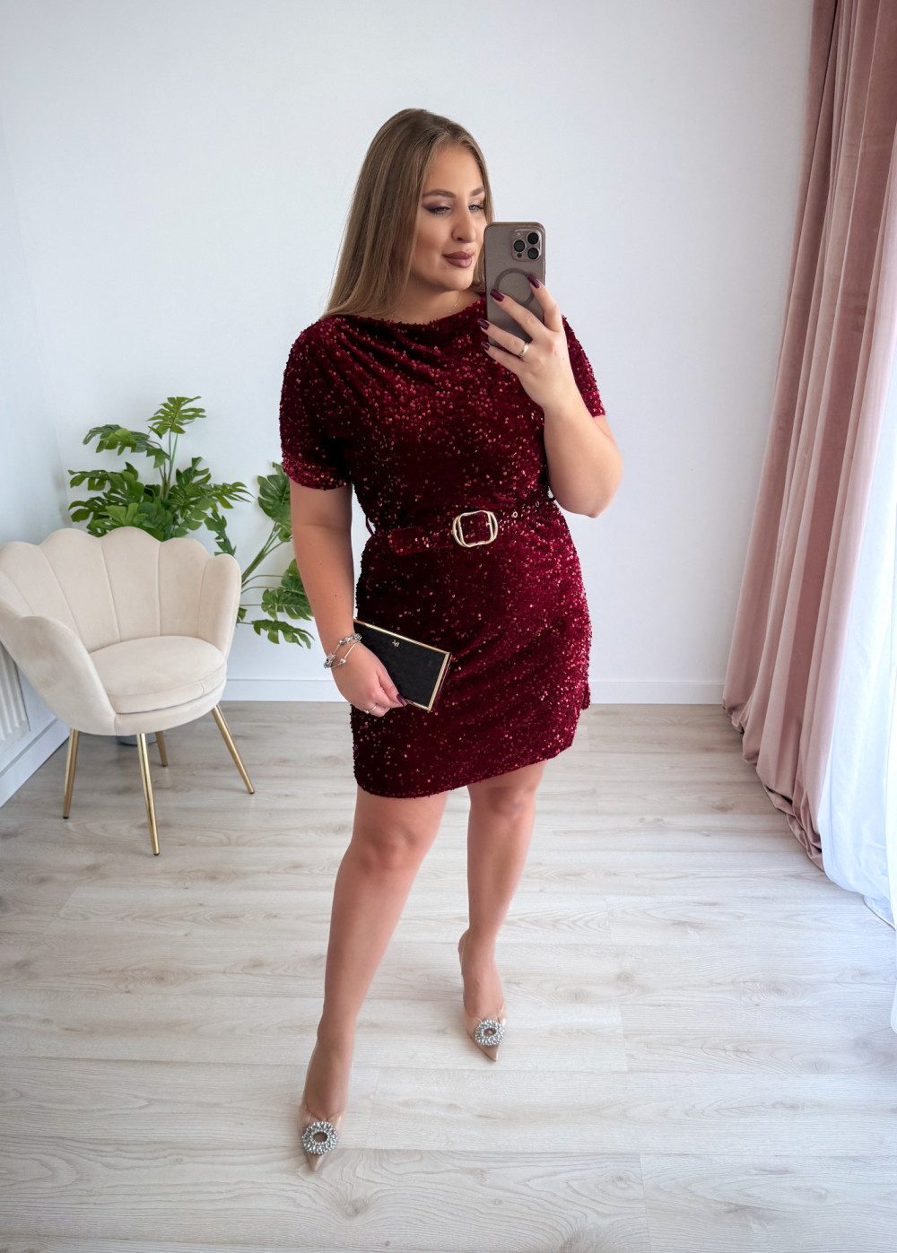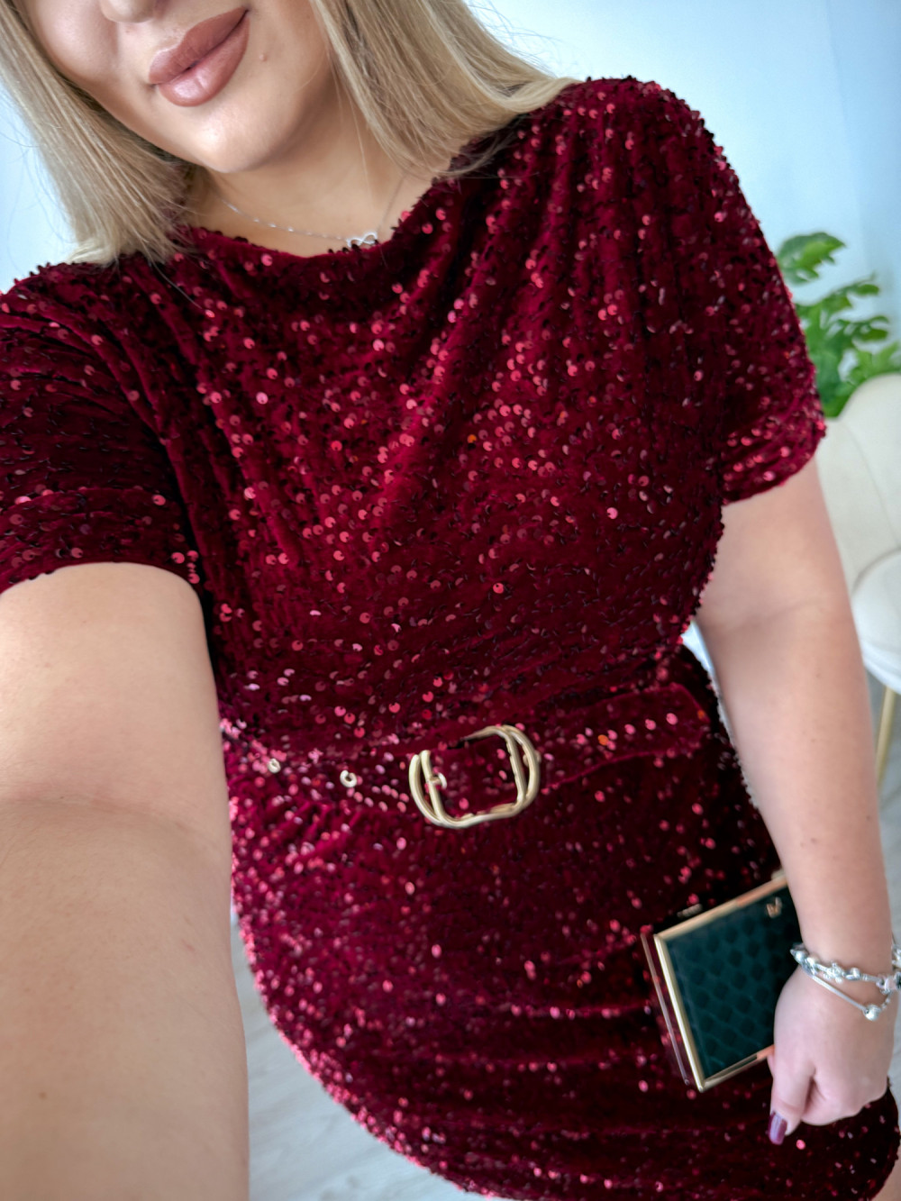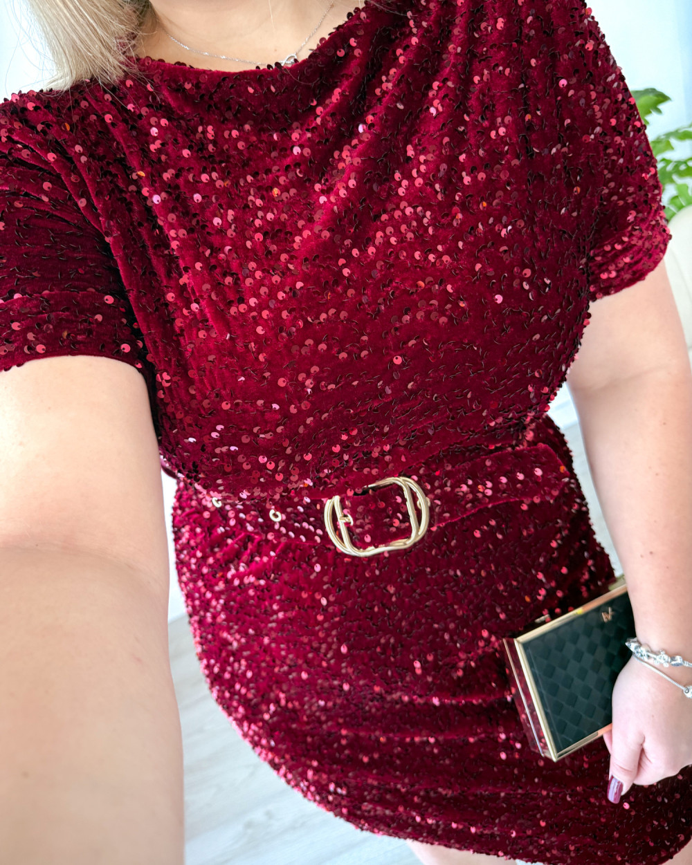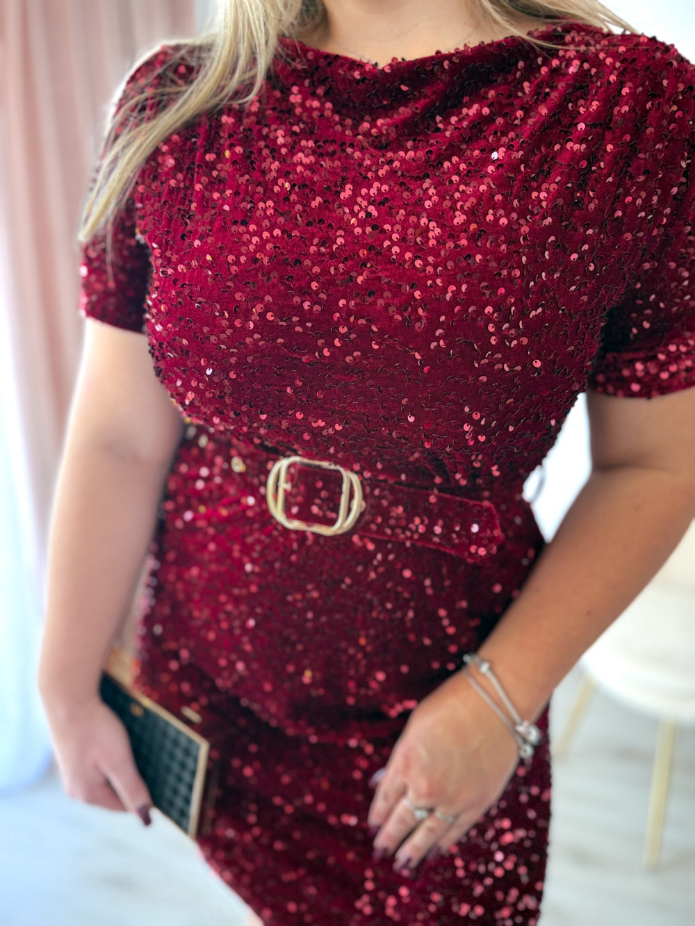 Sukienka krótka cekinowa welurowa z paskiem w talii Everyday Beauty - bordo