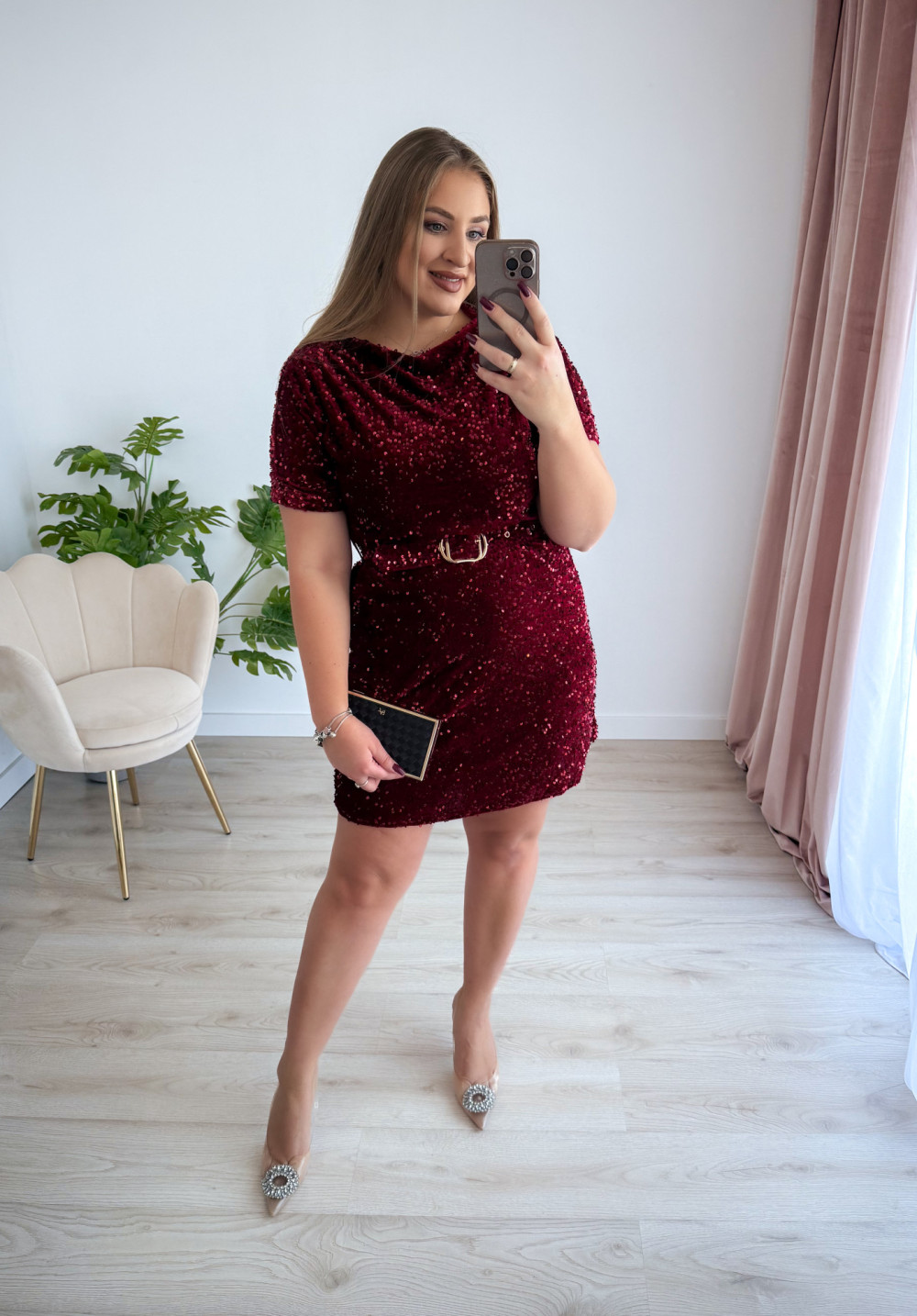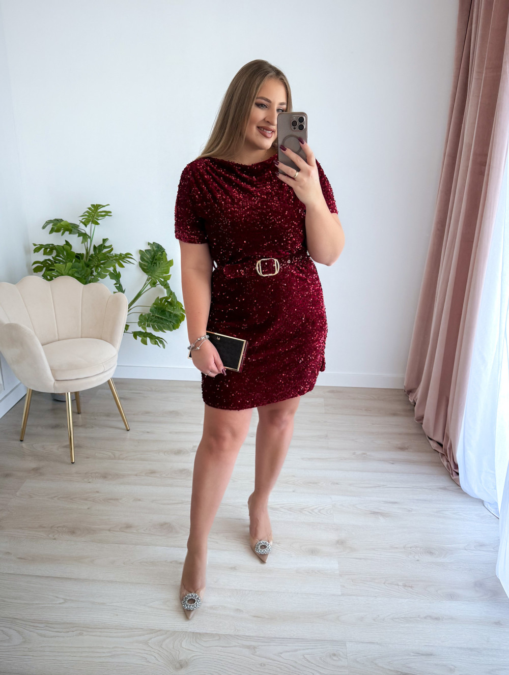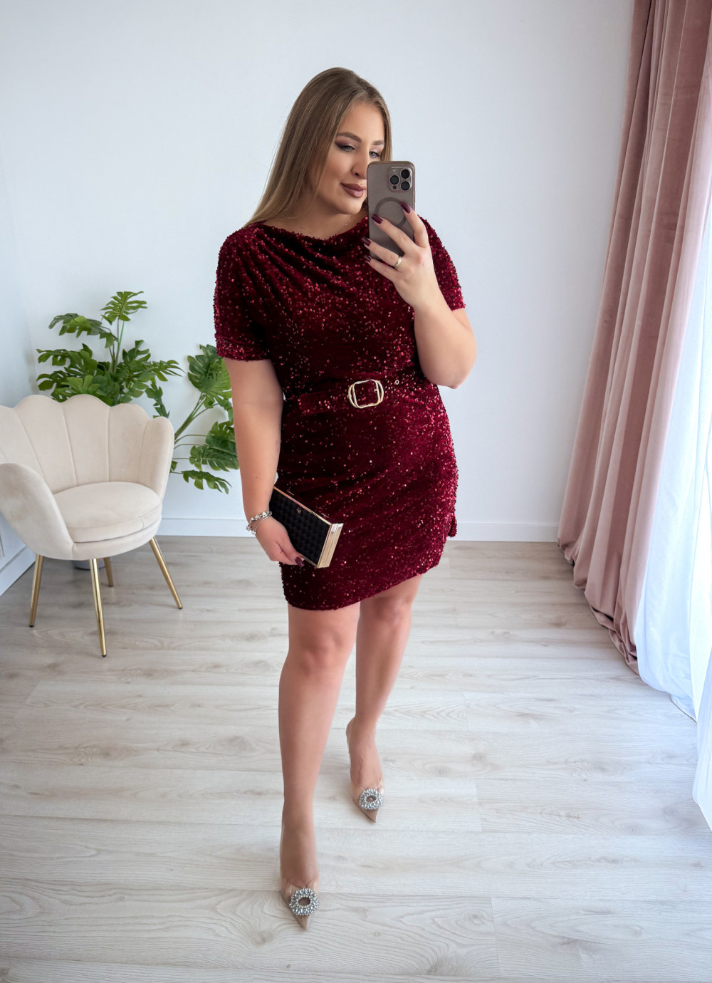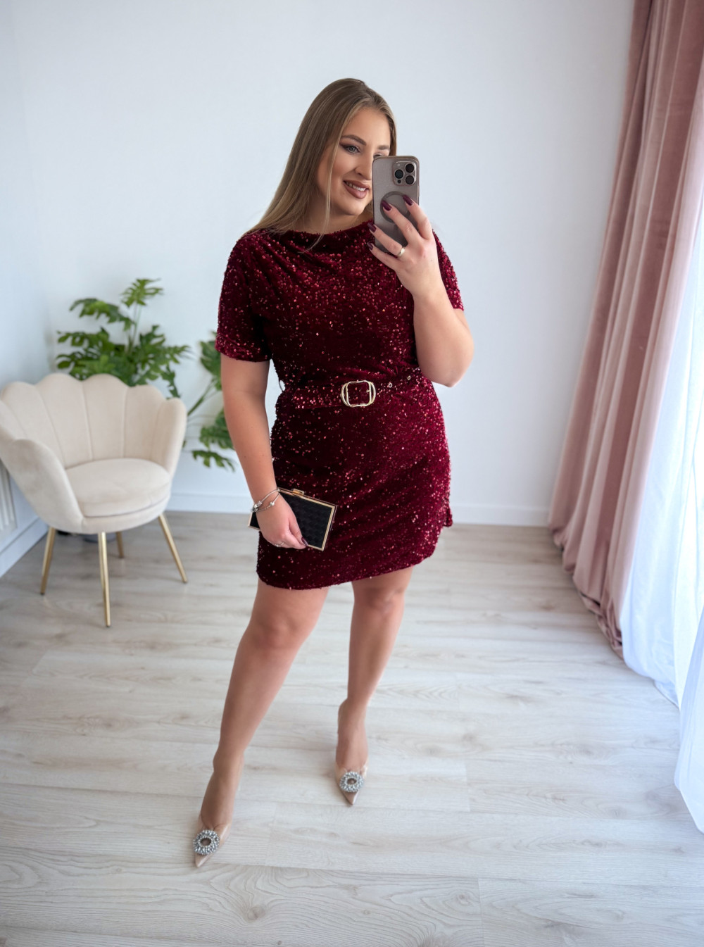 Sukienka krótka cekinowa welurowa z paskiem w talii Everyday Beauty - bordo