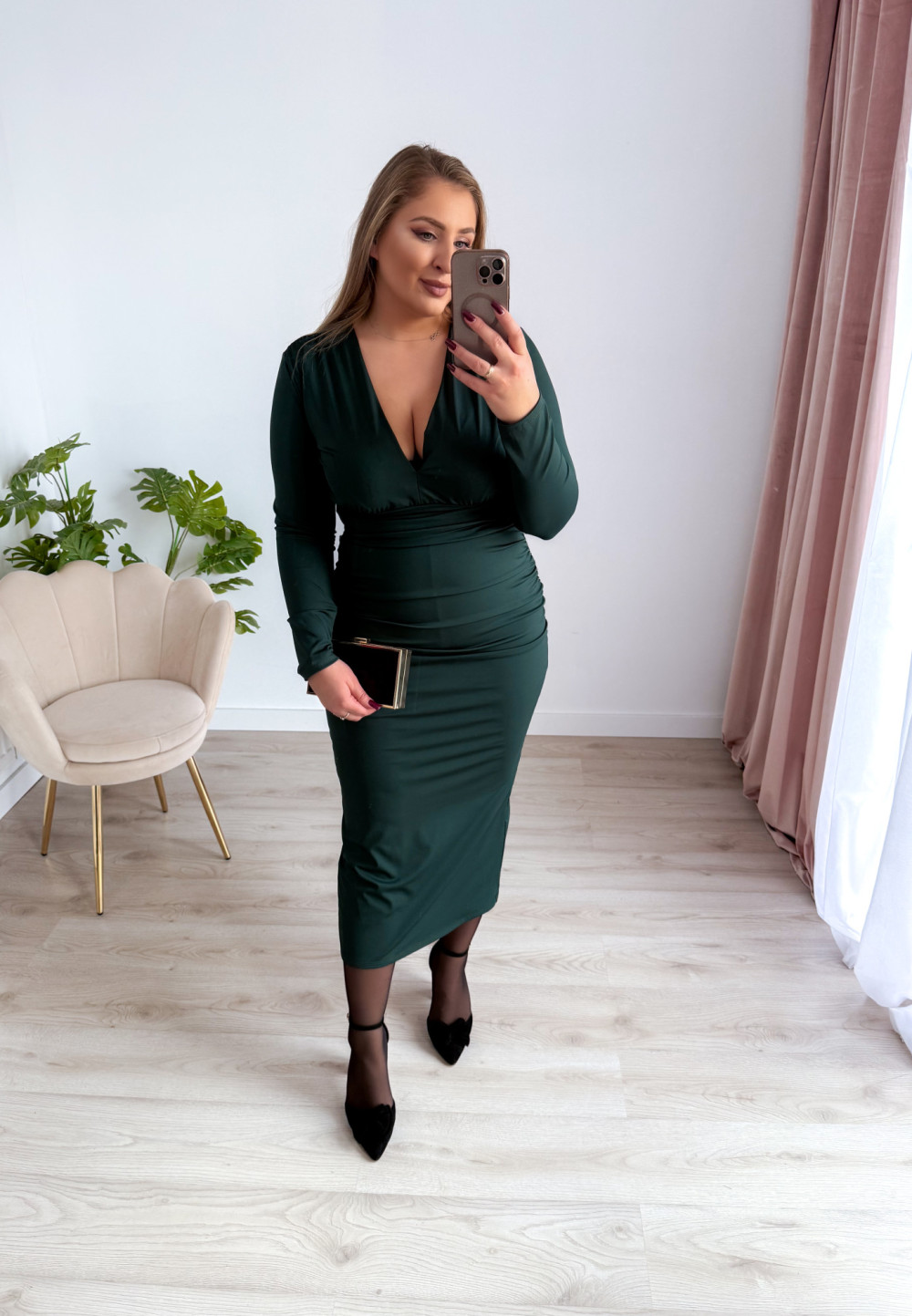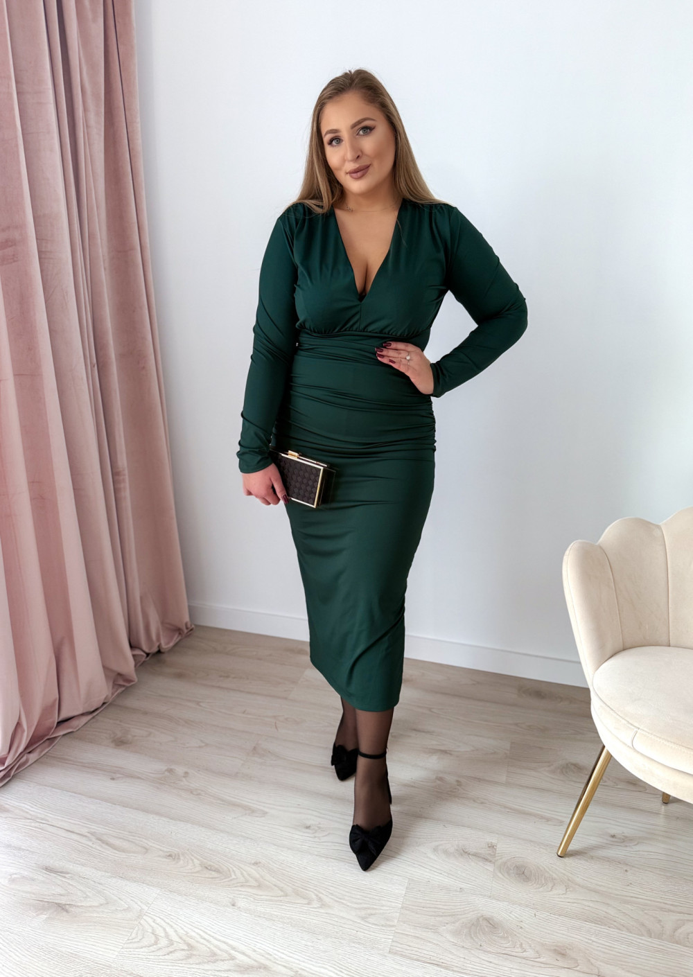 Sukienka maxi z delikatnym marszczeniem i dekoltem V Sylvia - butelkowa zieleń