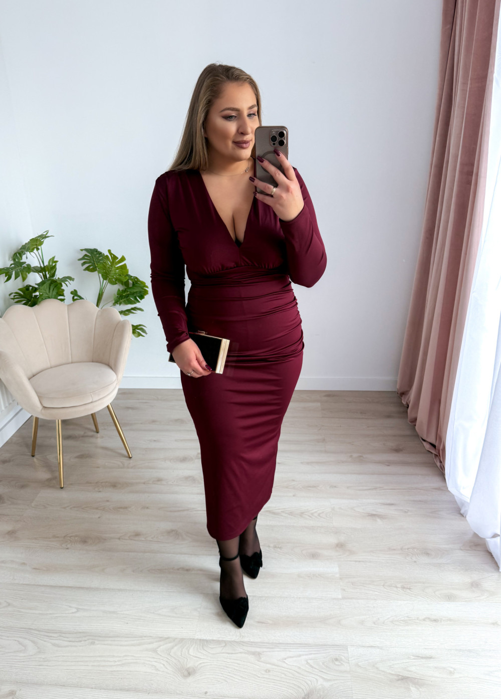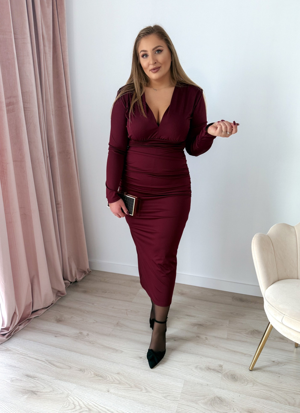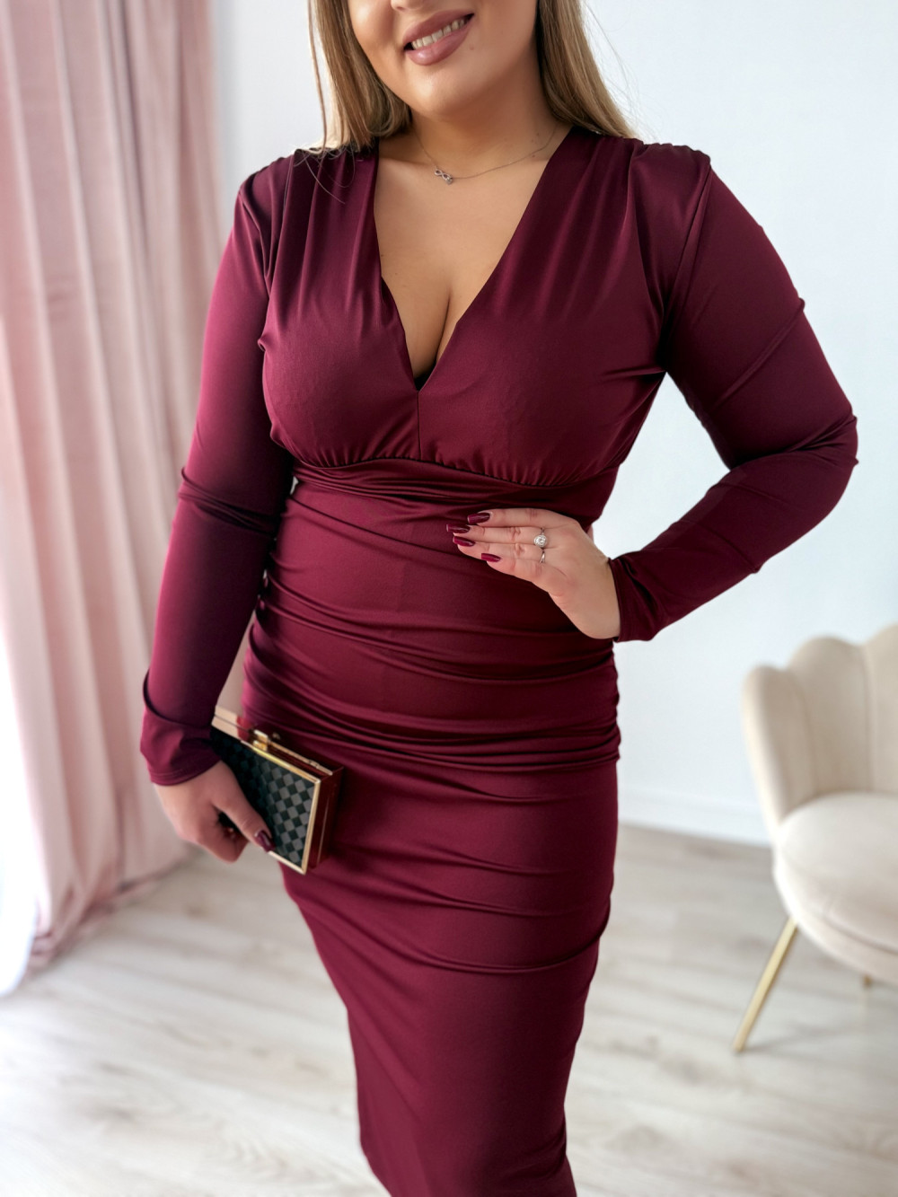 Sukienka maxi z delikatnym marszczeniem i dekoltem V Sylvia - bordo