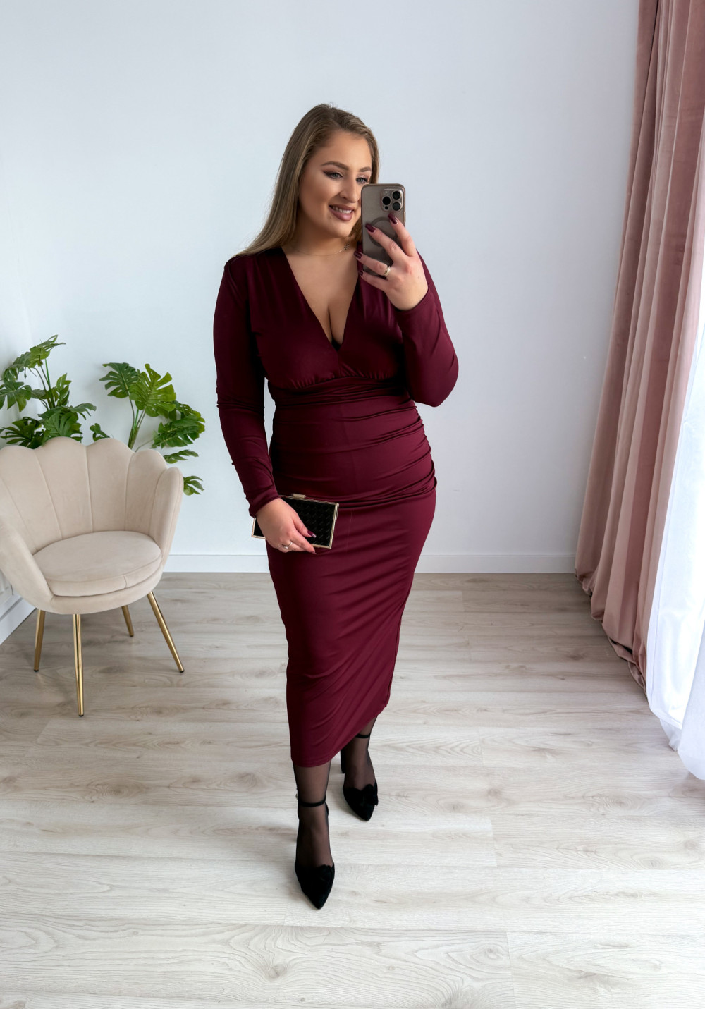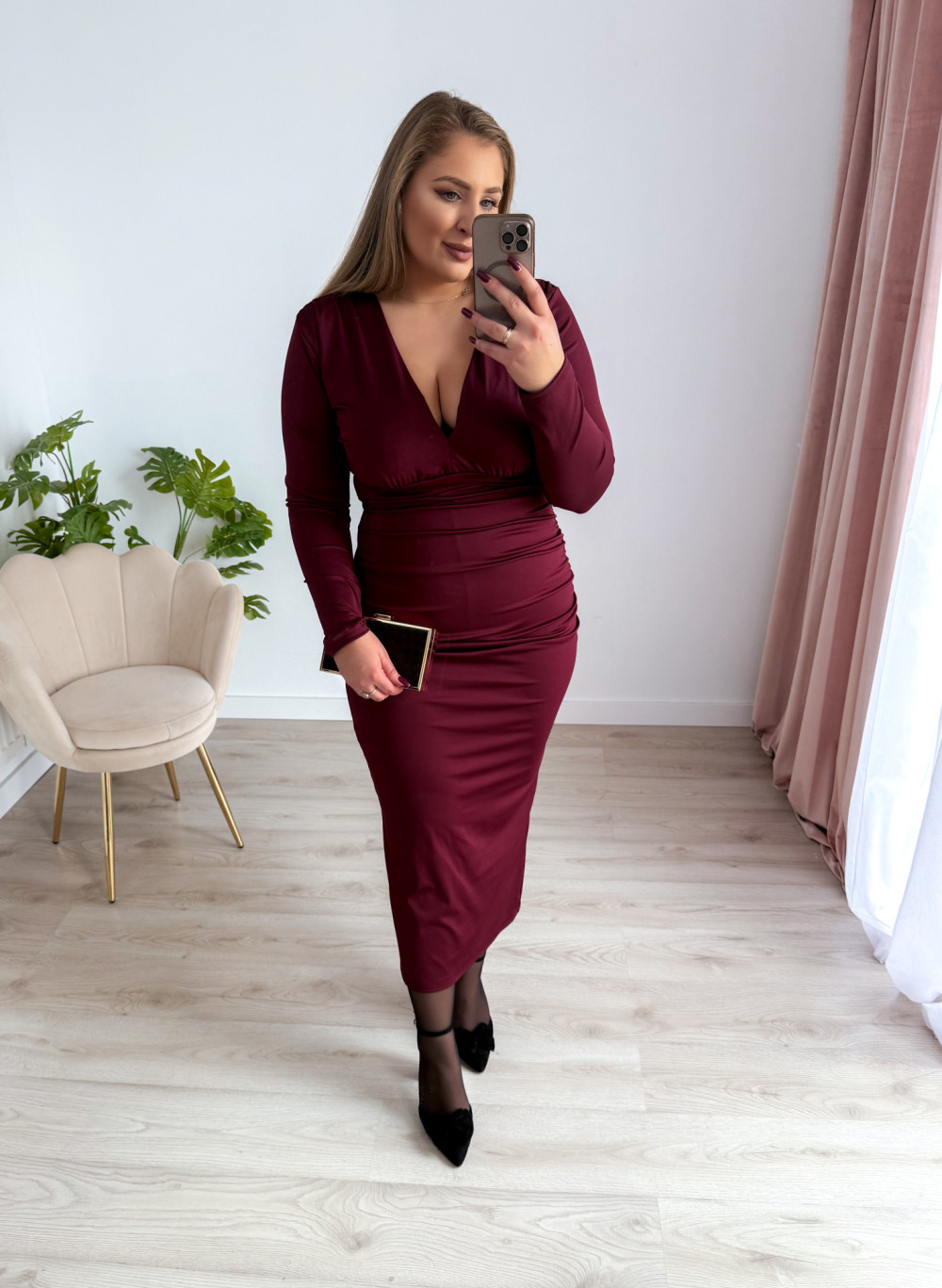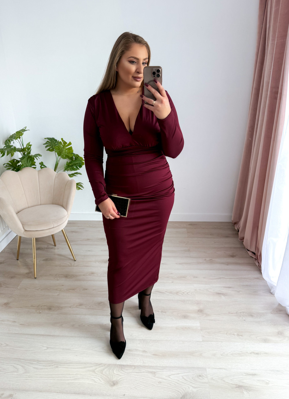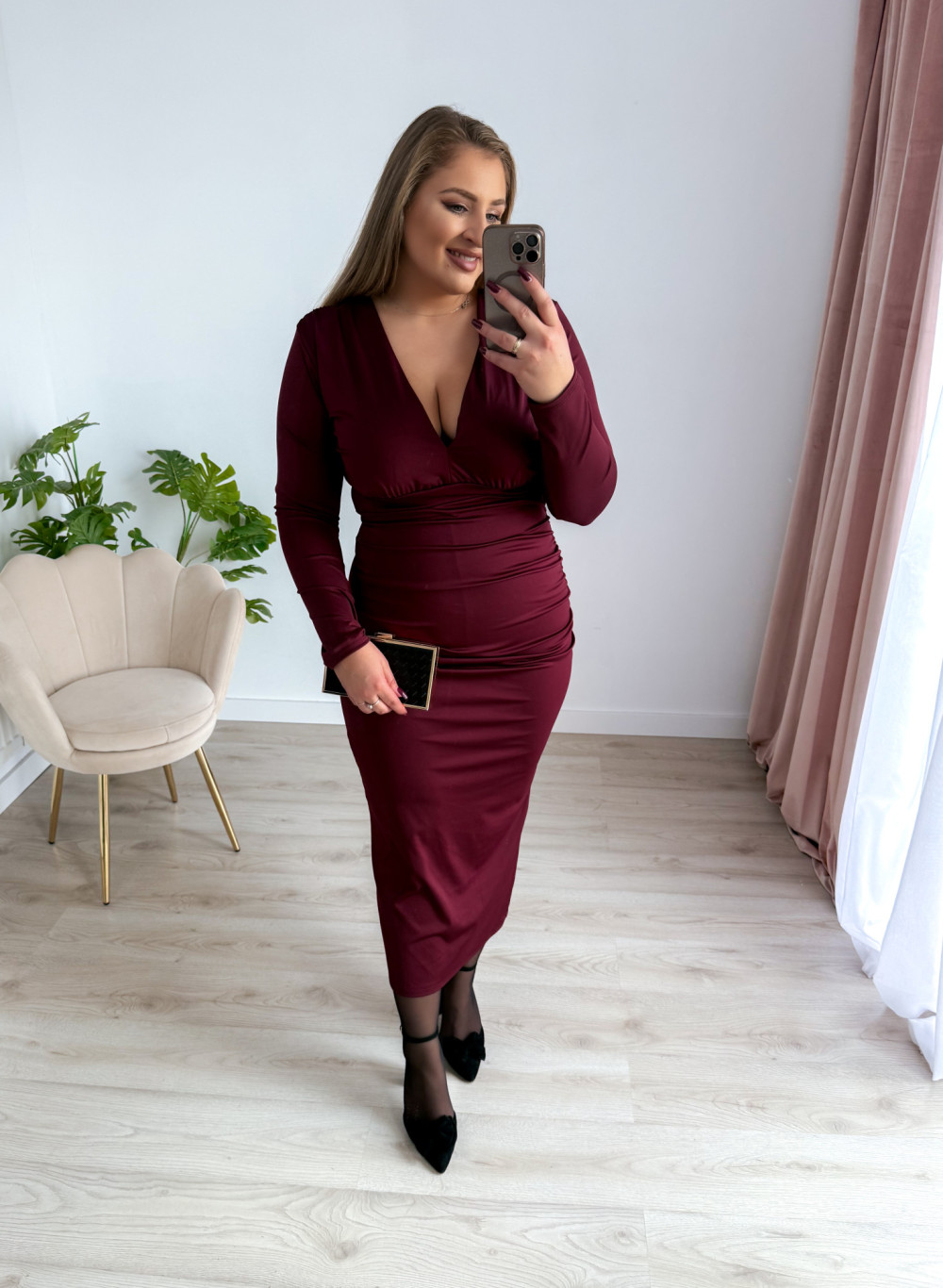 Sukienka maxi z delikatnym marszczeniem i dekoltem V Sylvia - bordo